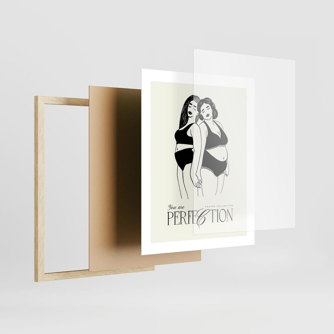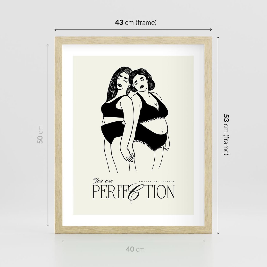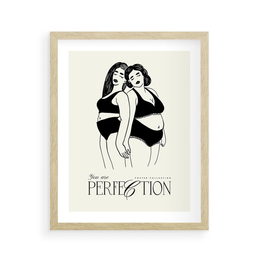 Ten nowoczesny plakat przedstawia dwie kobiety w bieliźnie, promując wartość samoakceptacji. Ich połączenie symbolizuje wspólnotę i siłę kobiecej natury, podkreślanej inspirującą typografią.