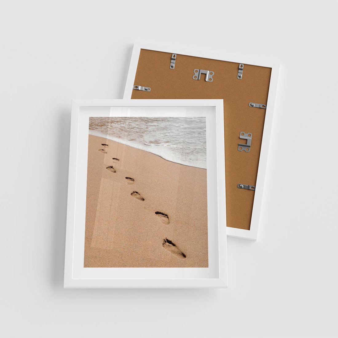 Plakat w ramie 40x50 - Ślady Stóp na Plaży: Spacer nad Morzem - plaża, ślady stóp na piasku - rama biała