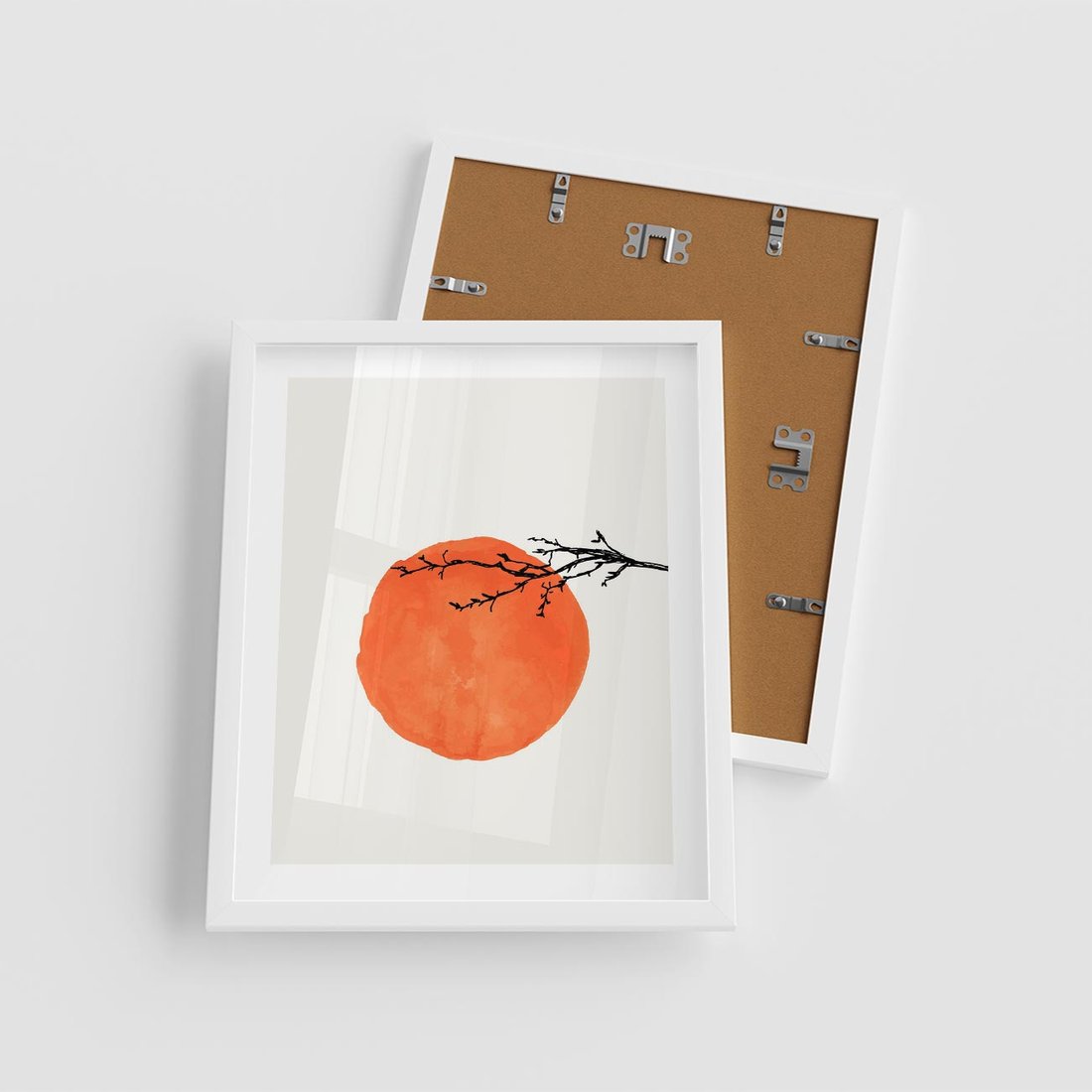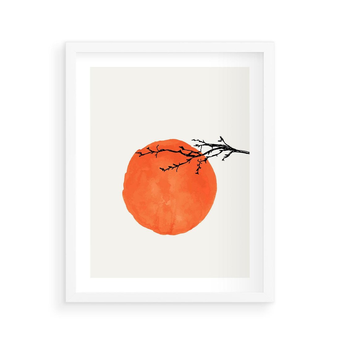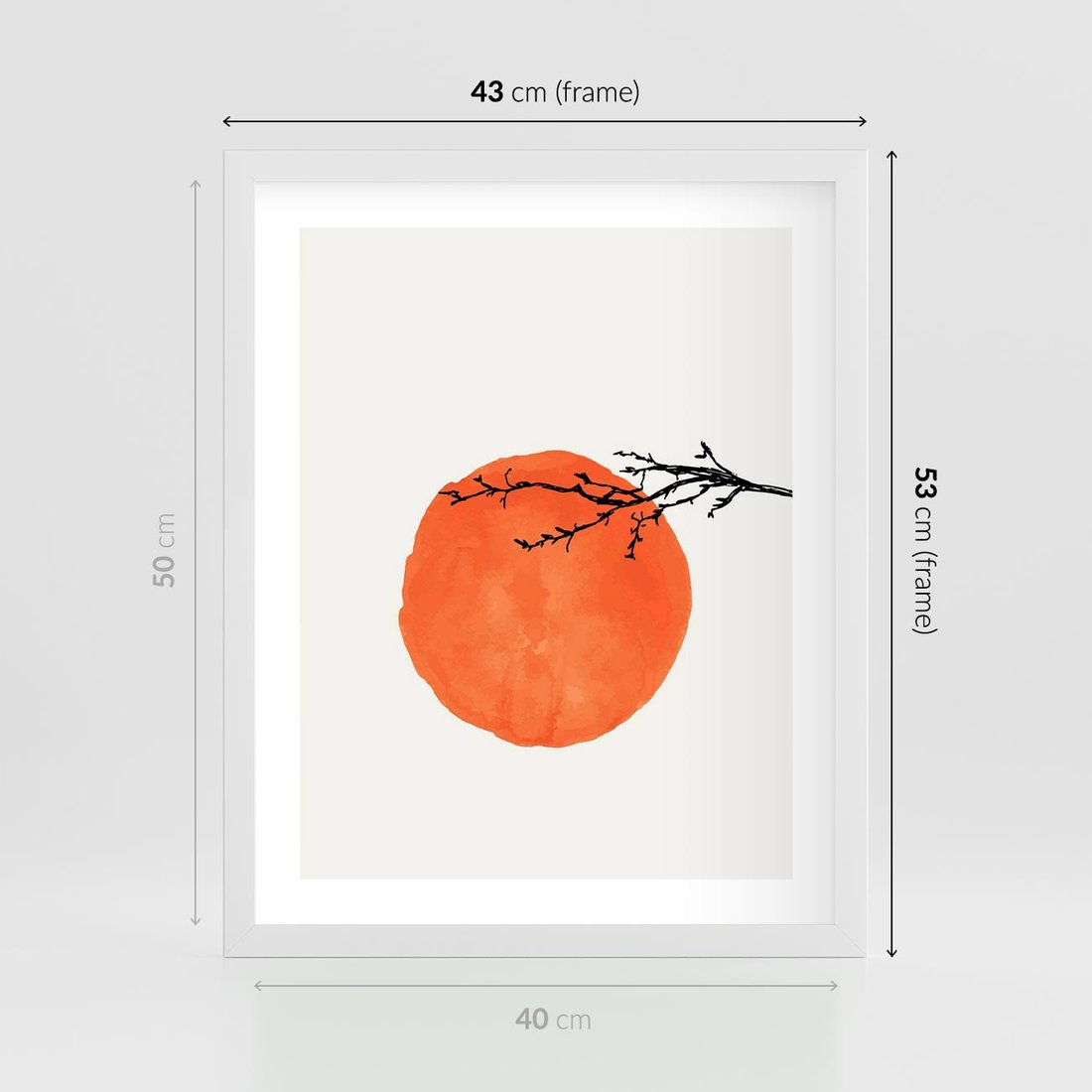 Plakat w ramie 40x50 - Słońce i Gałązka - pomarańczowe słońce, gałązka - rama biała