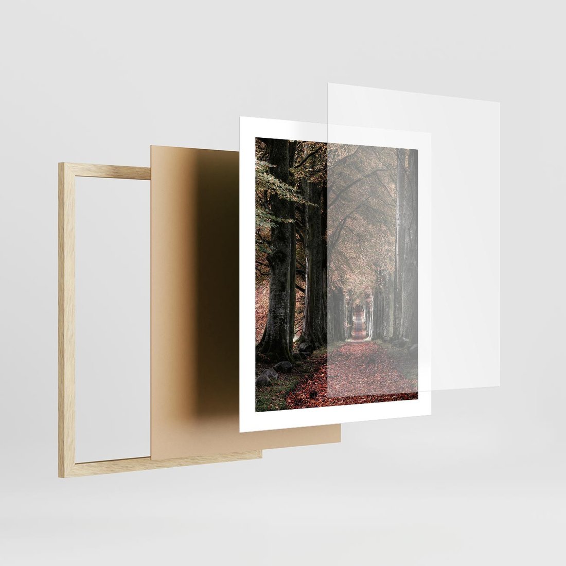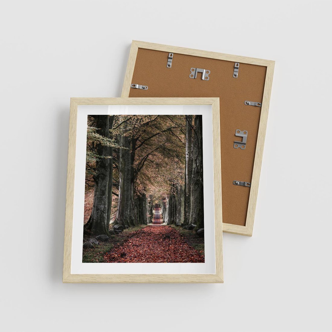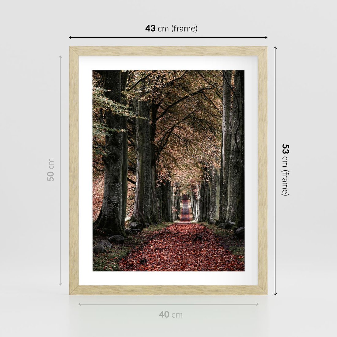 Plakat w ramie 40x50 - Spacer po Leśnej Drodze - ścieżka w lesie, jesień suche liście - rama drewno