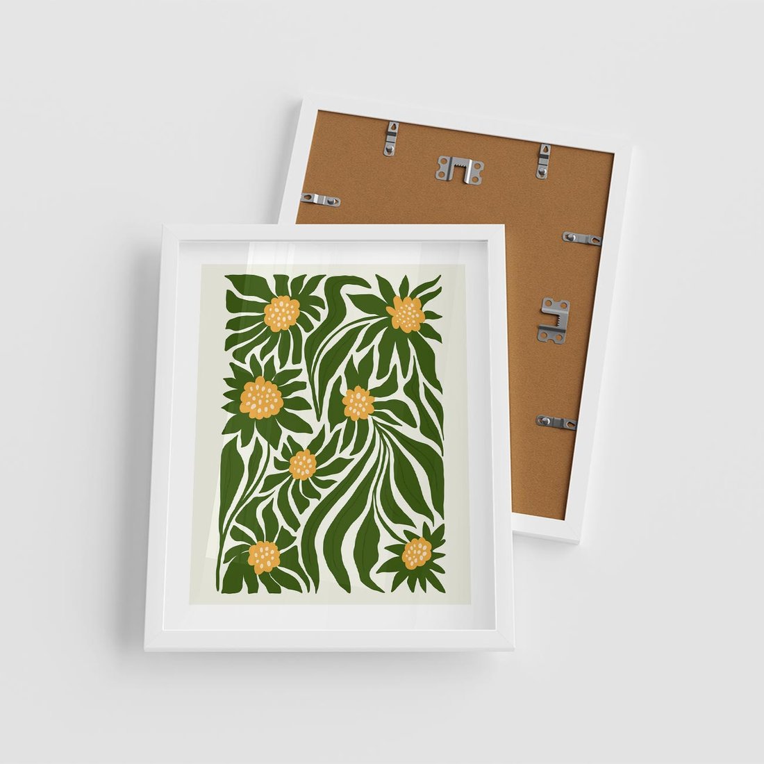 Ta abstrakcyjna kompozycja ukazuje kwiaty w wyjątkowo niekonwencjonalny sposób. Zieleń i żółć splatają się w harmonijną całość, tworząc abstrakcyjne pejzaże natury. Bez tytułu obraz zachęca do indywidualnych interpretacji, pozostawiając przestrzeń dla wyobraźni i refleksji.