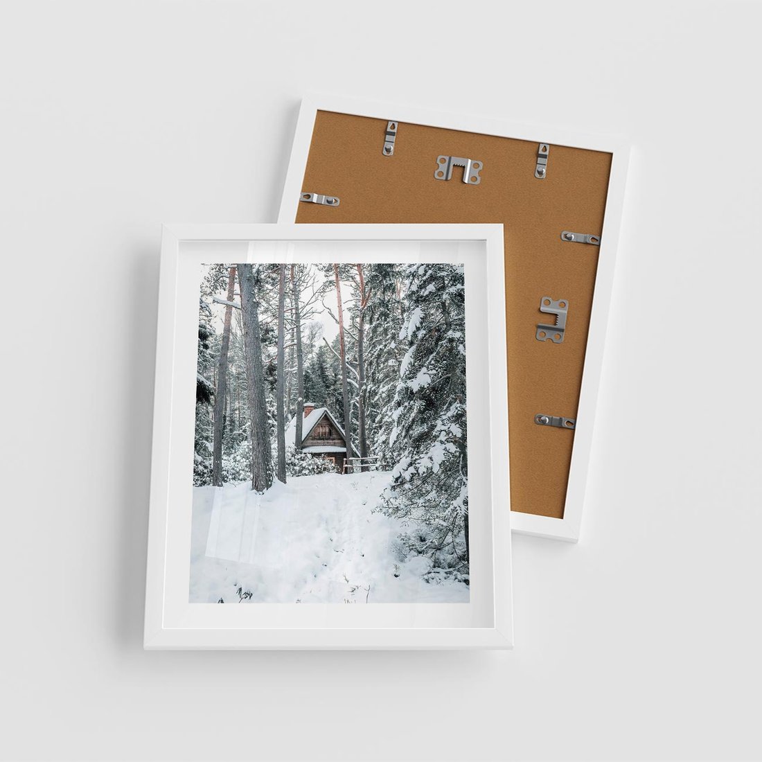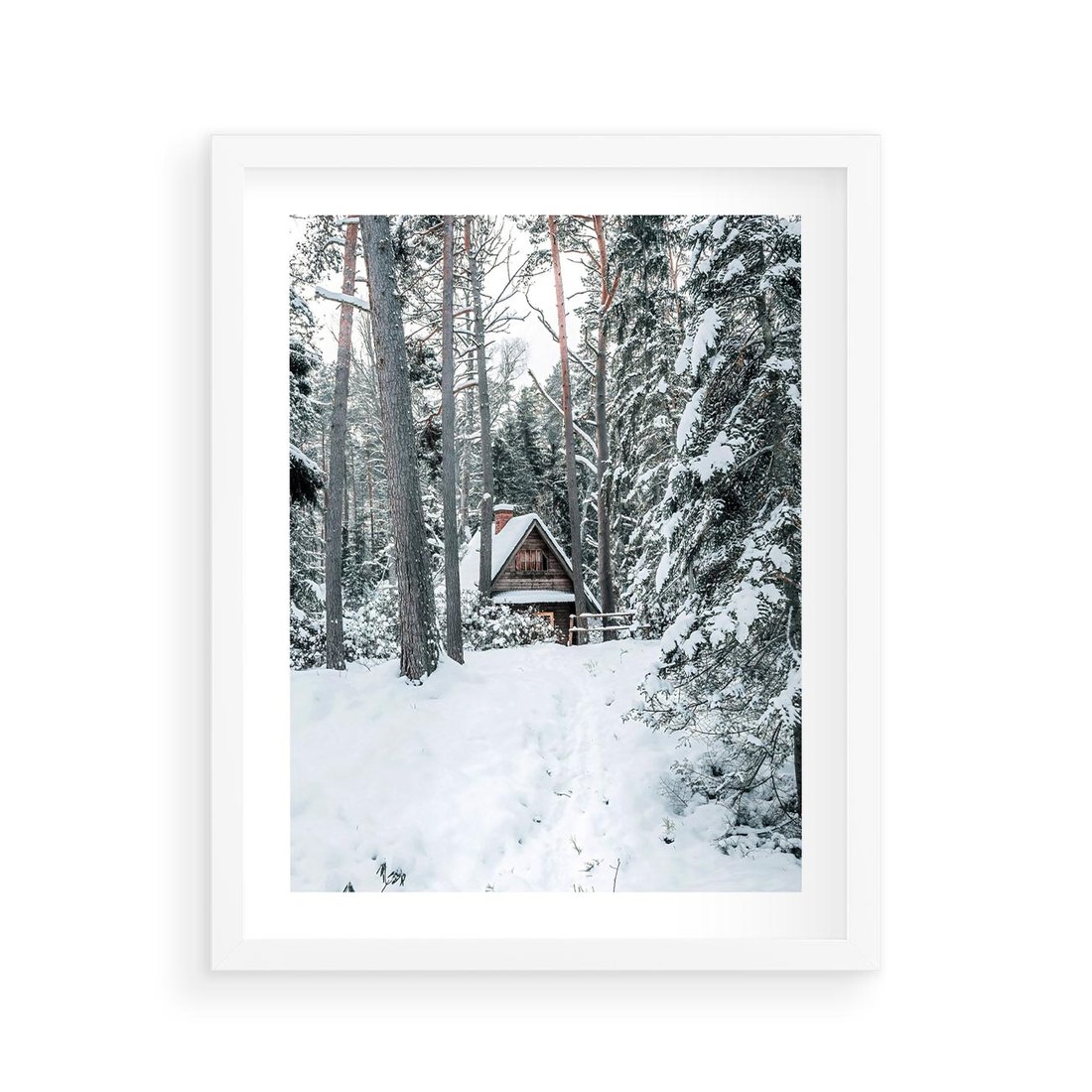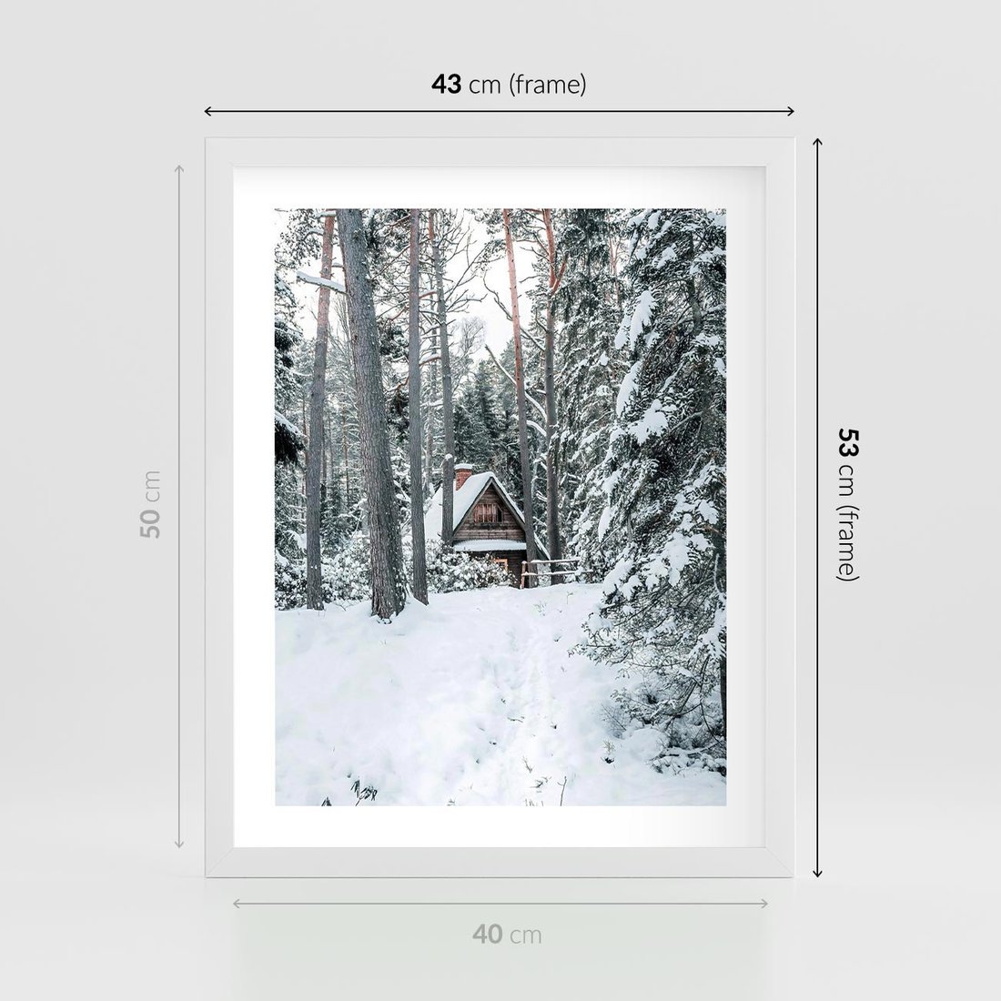 Plakat w ramie 40x50 - Spokój Zimowej Przygody w Lesie - domek w górach w lesie, zima - rama biała
