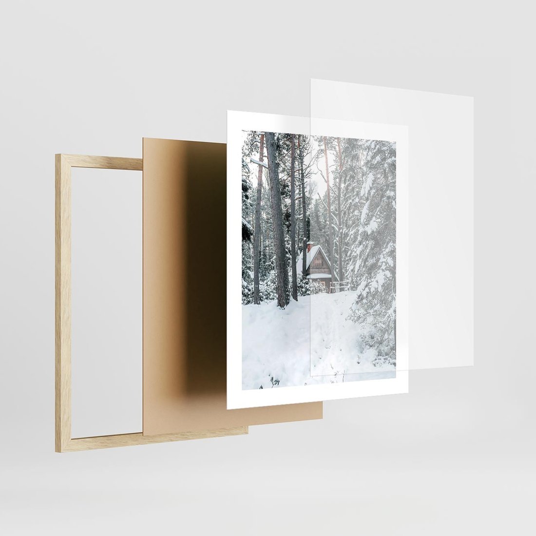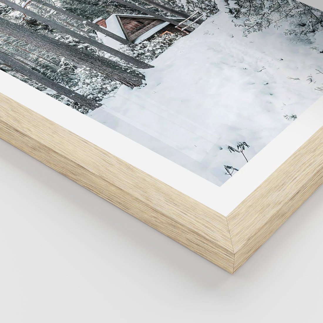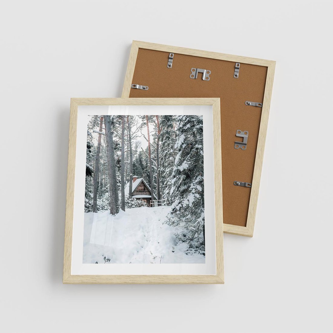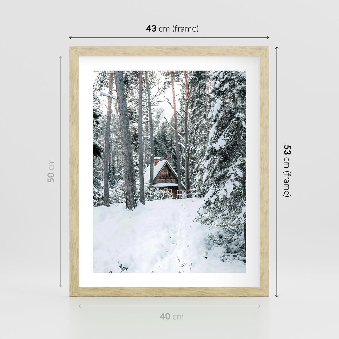 Plakat w ramie 40x50 - Spokój Zimowej Przygody w Lesie - domek w górach w lesie, zima - rama drewno