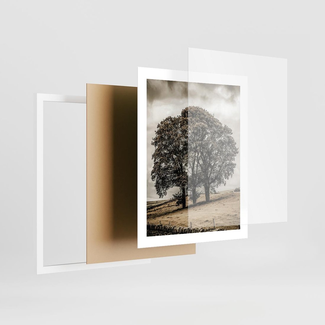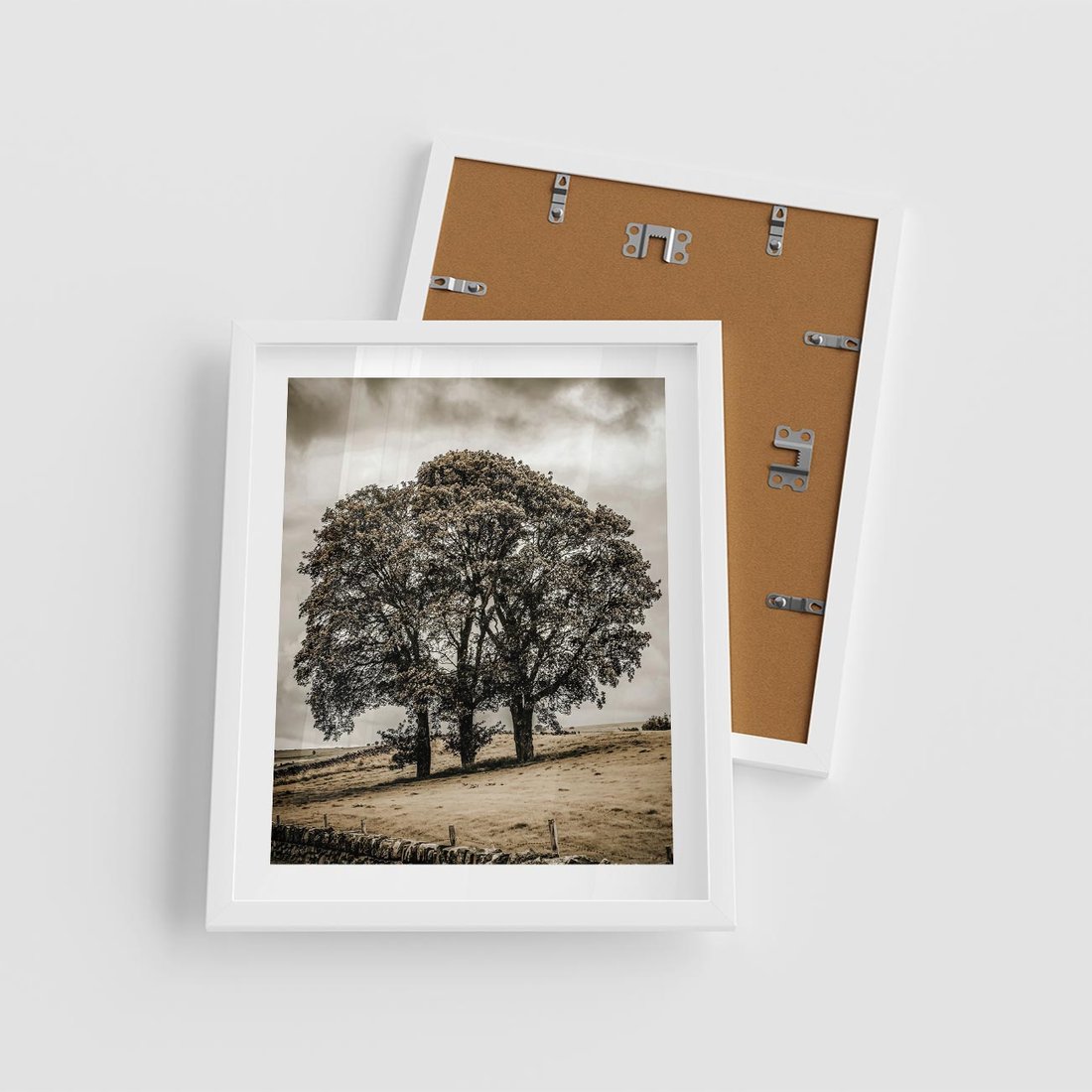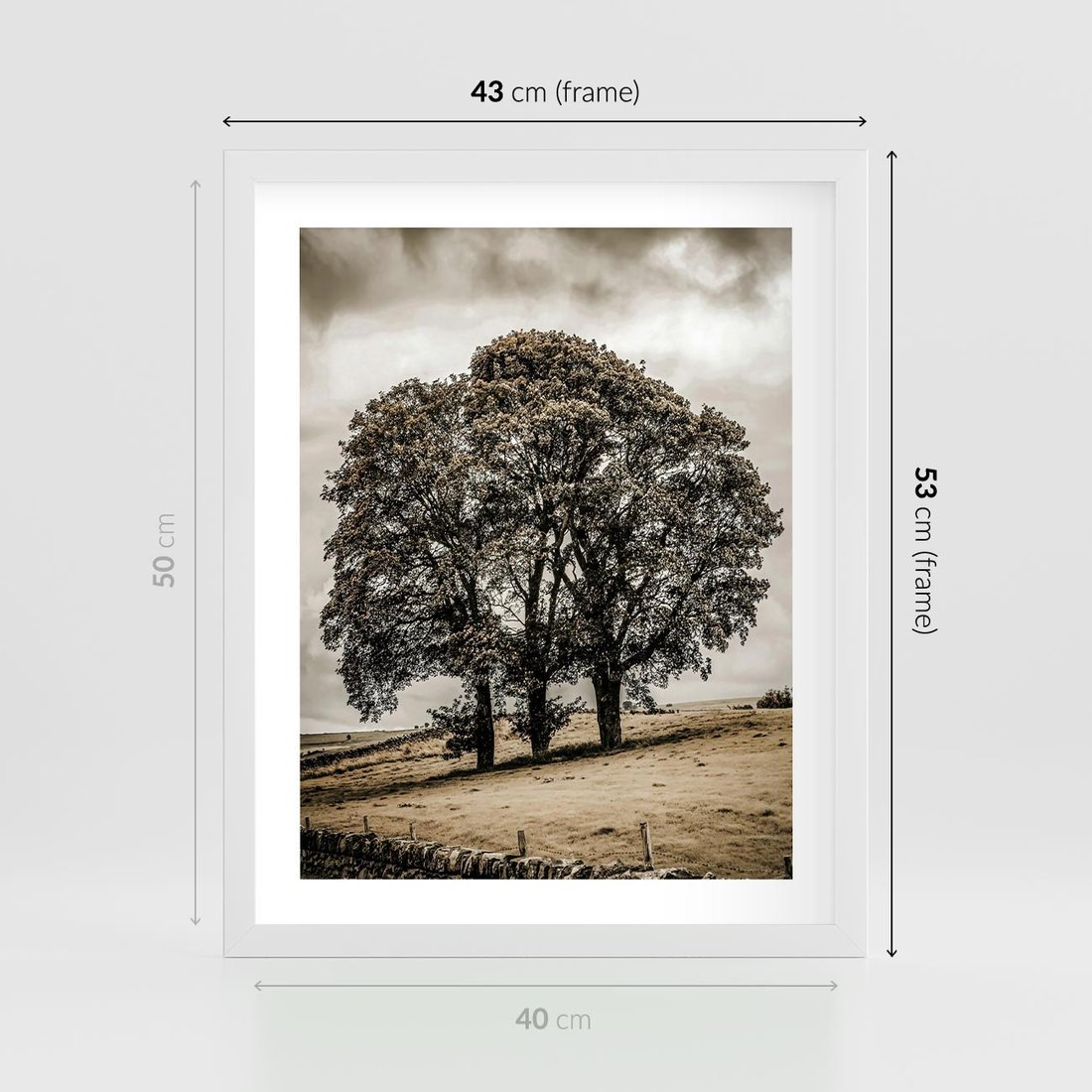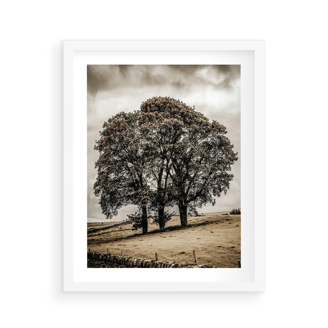Plakat w ramie 40x50 - Spokojna Osamotniona Chwila - beżowe kolory, samotne drzewo na polu - rama biała