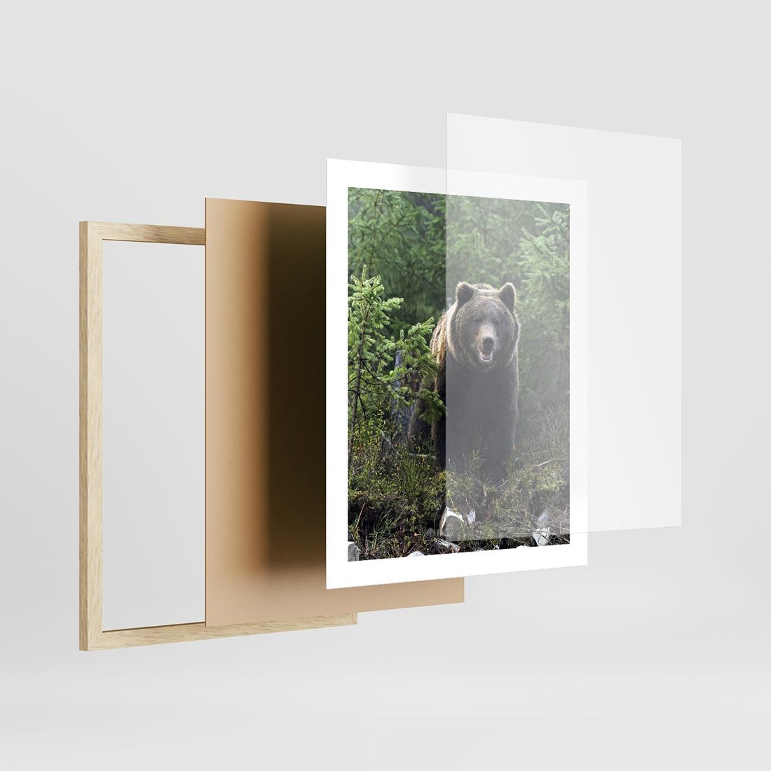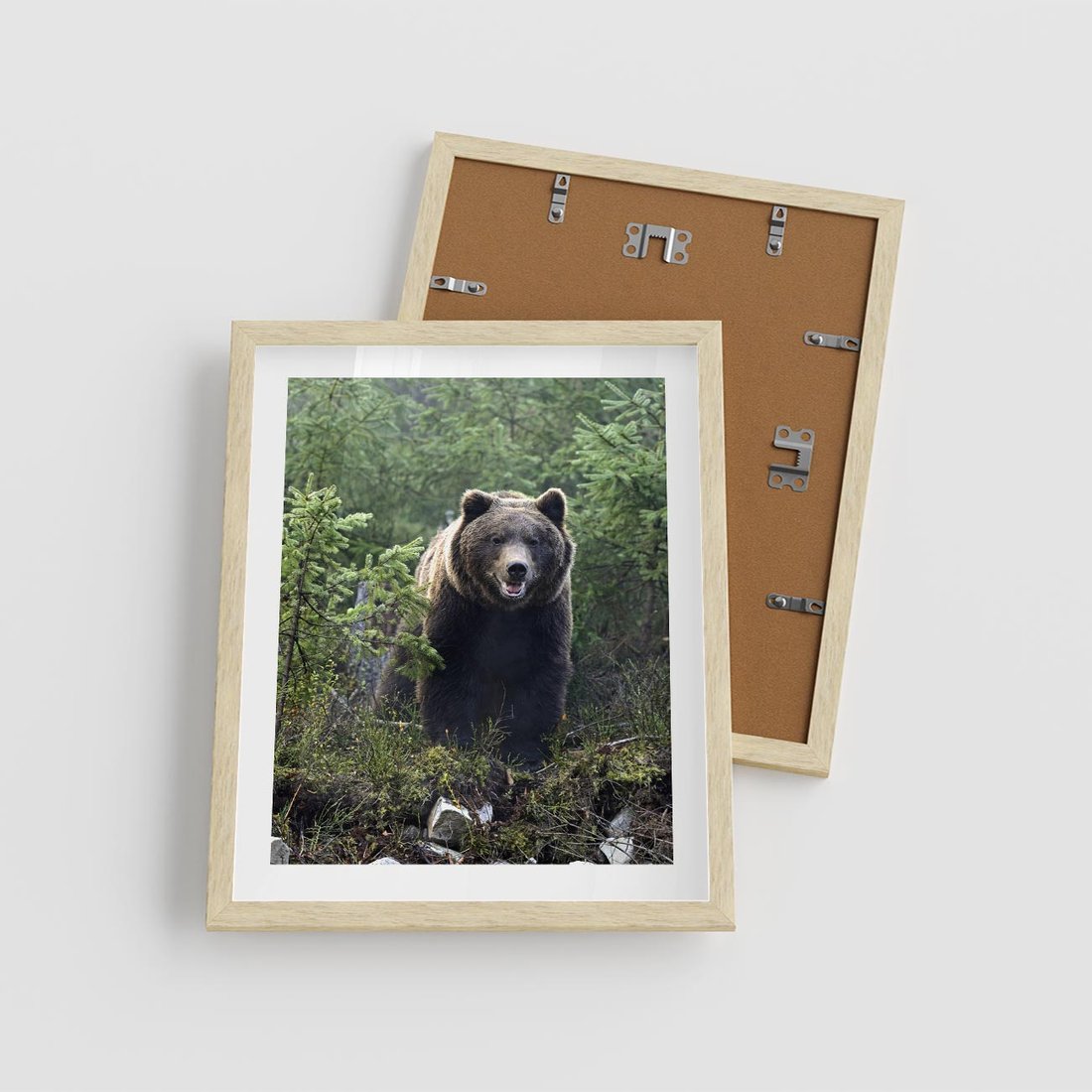 Plakat w ramie 40x50 - Spotkanie z Niedźwiedziem w Lesie - niedźwiedź, las - rama drewno