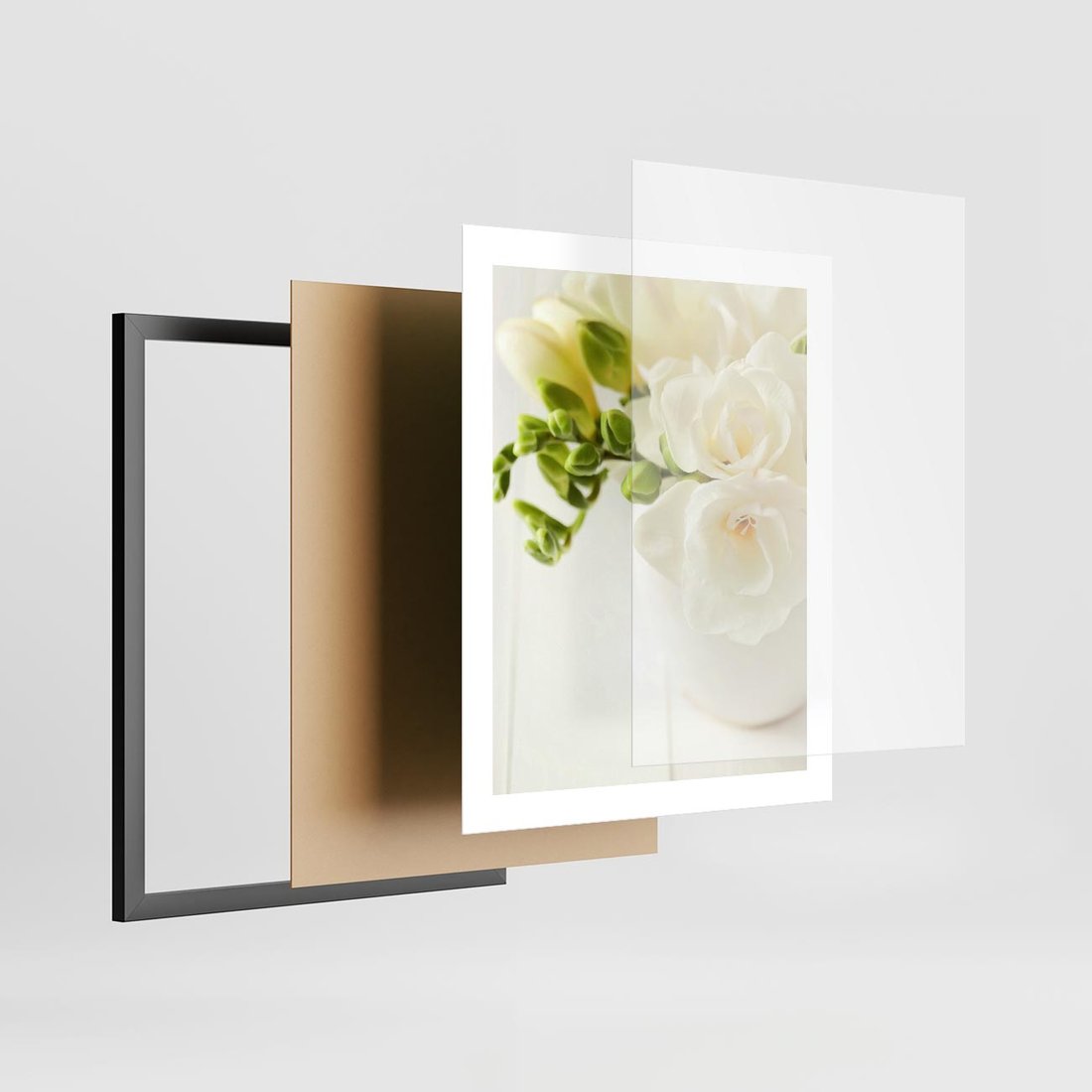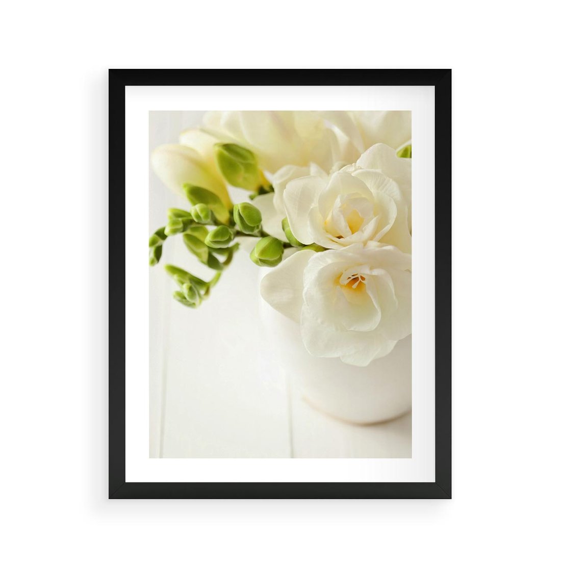 Plakat w ramie 40x50 - Subtelność białych frezji - frezja, białe - rama czarna