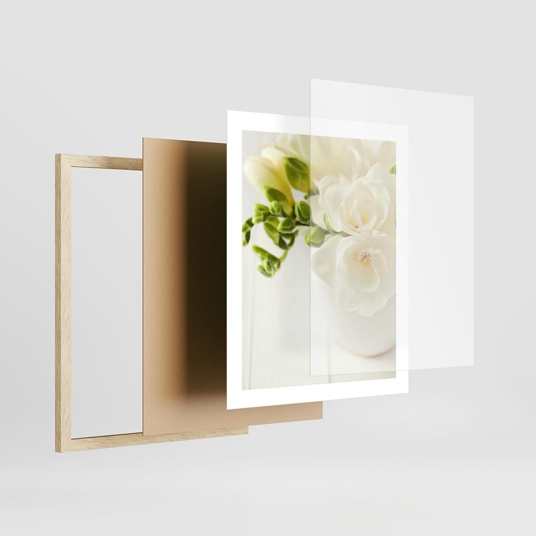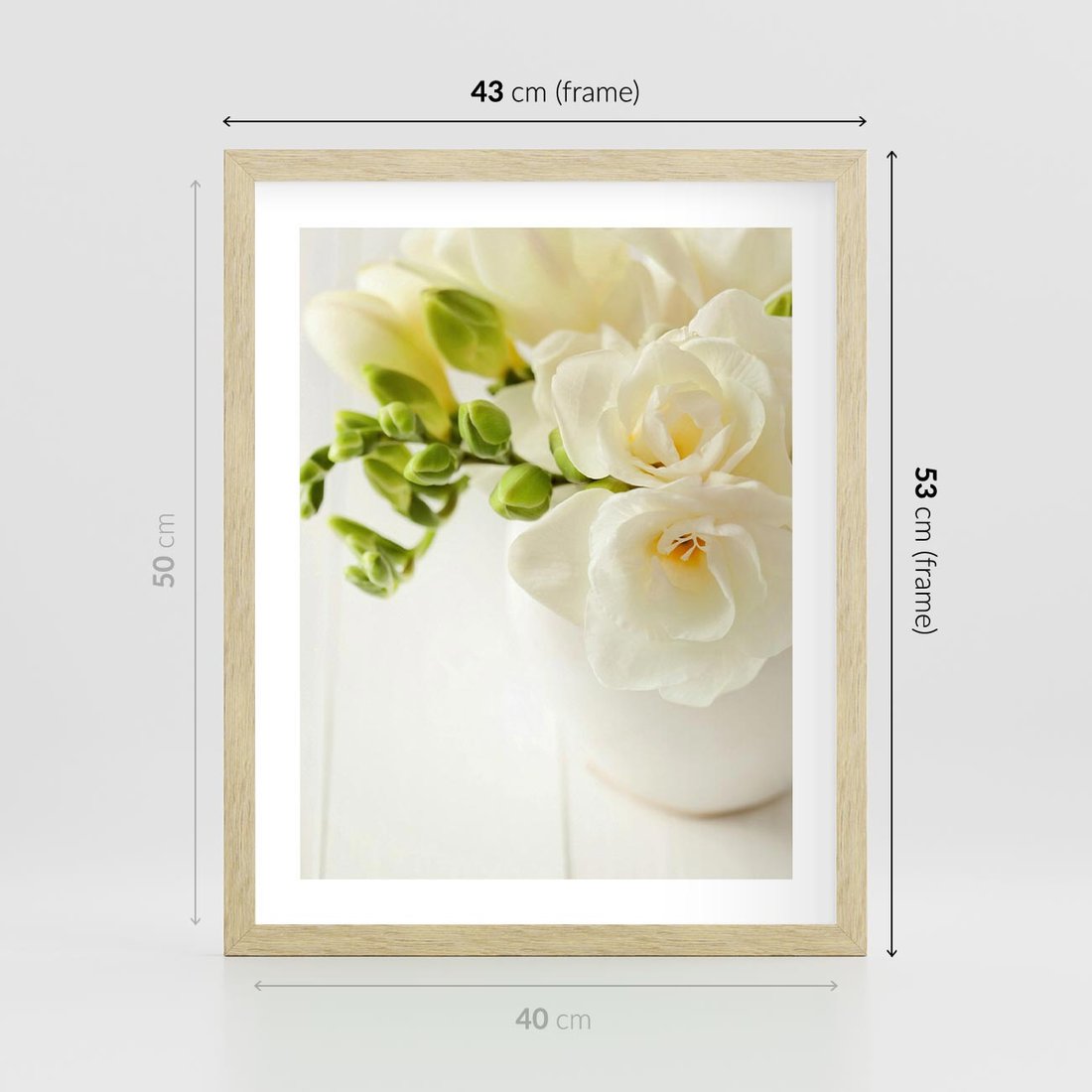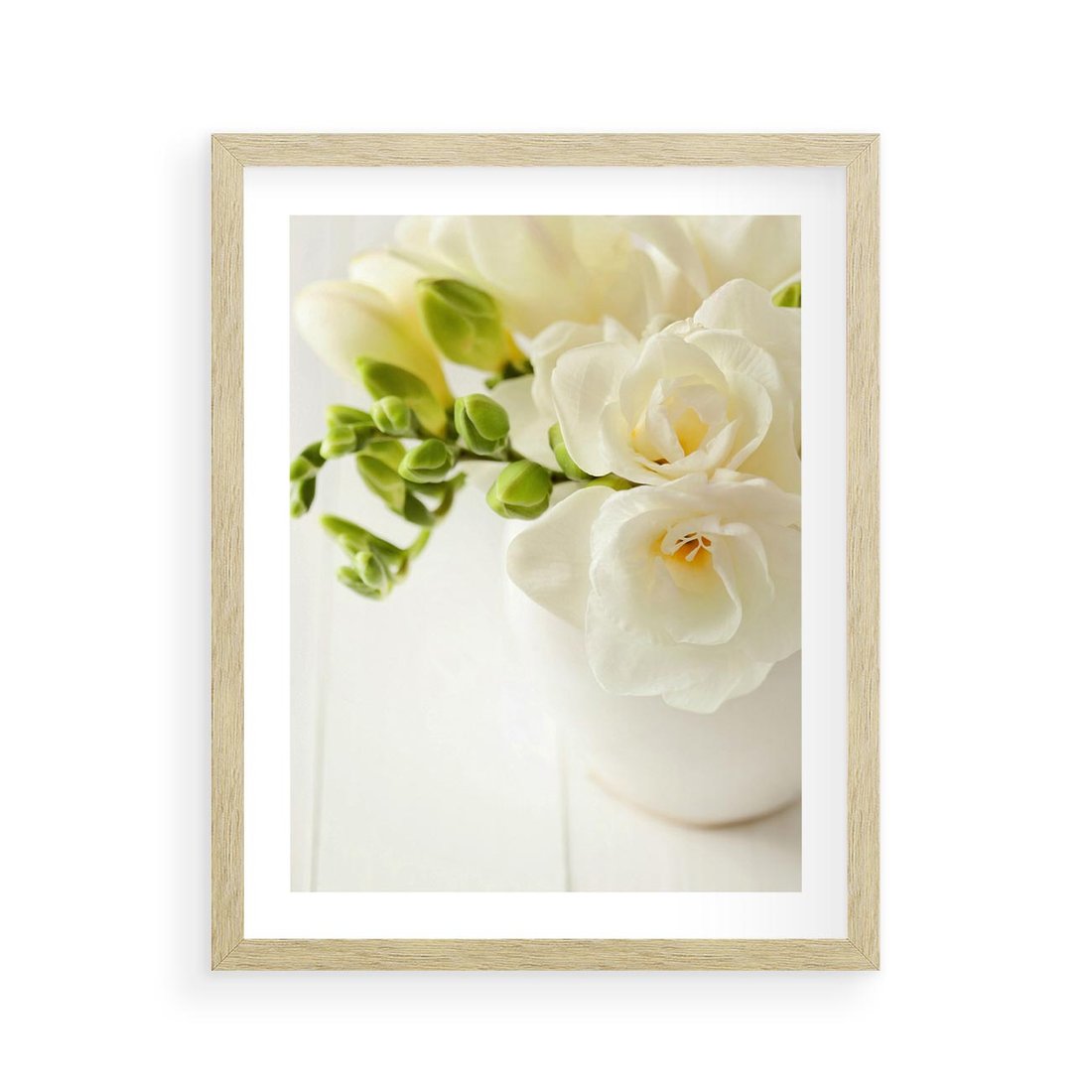 Plakat w ramie 40x50 - Subtelność białych frezji - frezja, białe - rama drewno