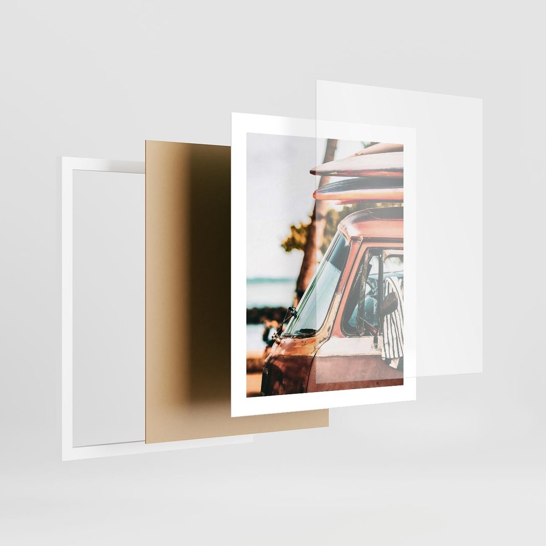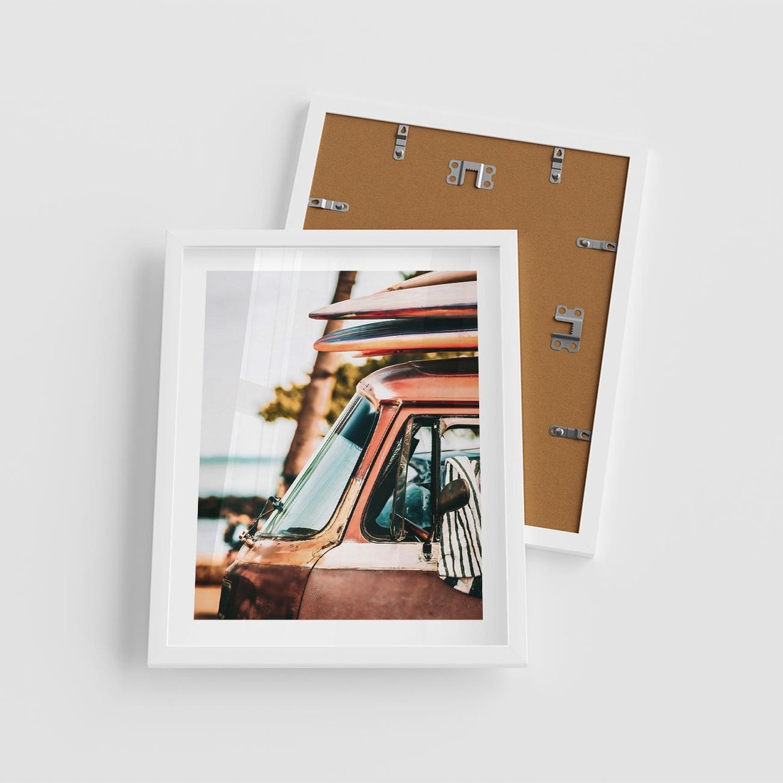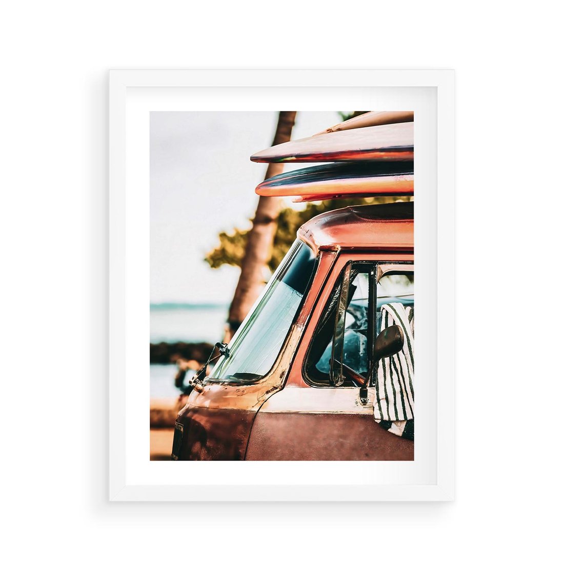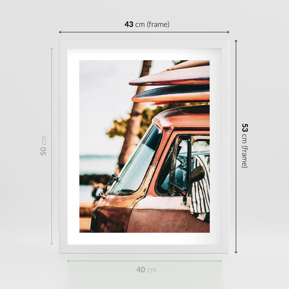 Plakat w ramie 40x50 - Surfingowa Wolność - samochód, stary van - rama biała