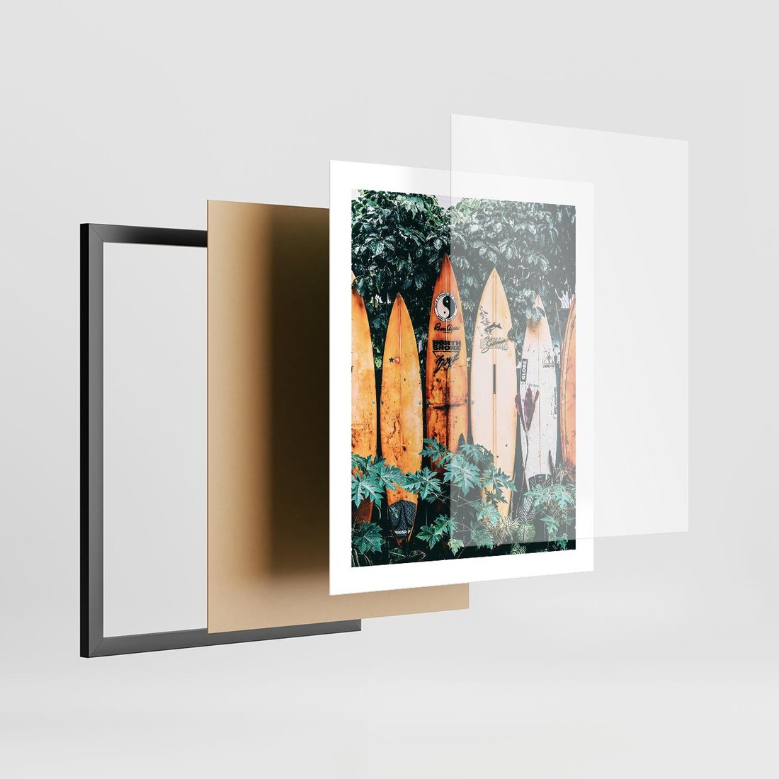 Plakat w ramie 40x50 - Surfowanie w Harmonii z Naturą - deski surfingowe, oparte o rośliny - rama czarna