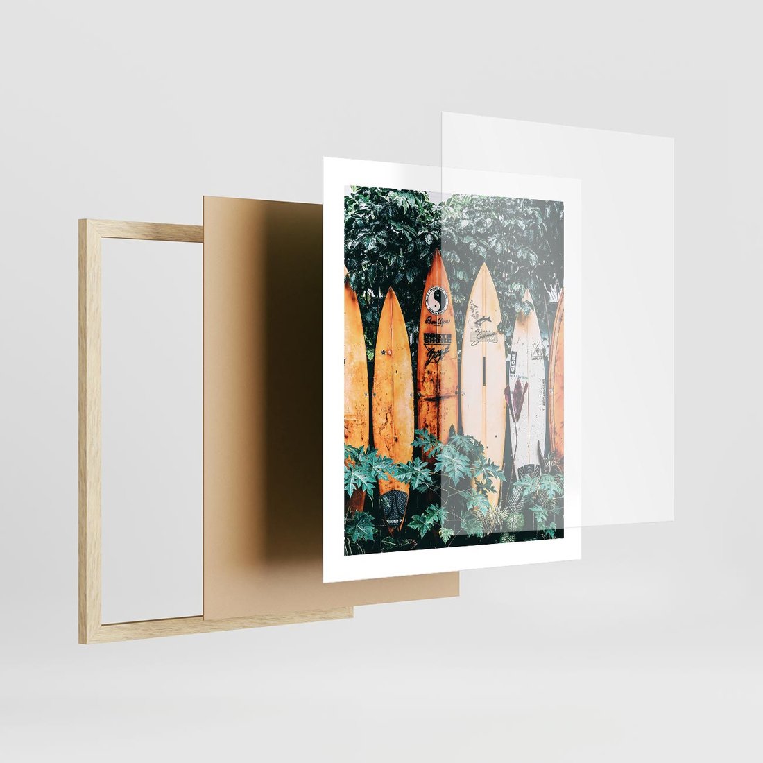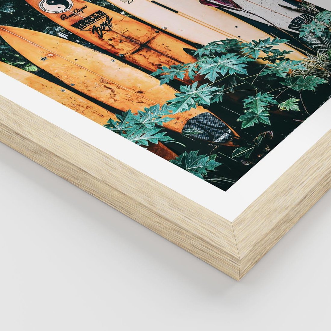 Plakat w ramie 40x50 - Surfowanie w Harmonii z Naturą - deski surfingowe, oparte o rośliny - rama drewno