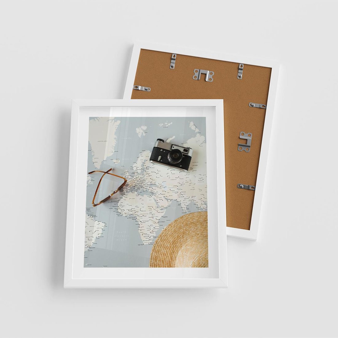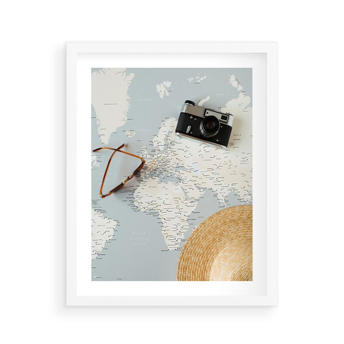 Plakat w ramie 40x50 - Świat w Kadrze - mapa, aparat - rama biała
