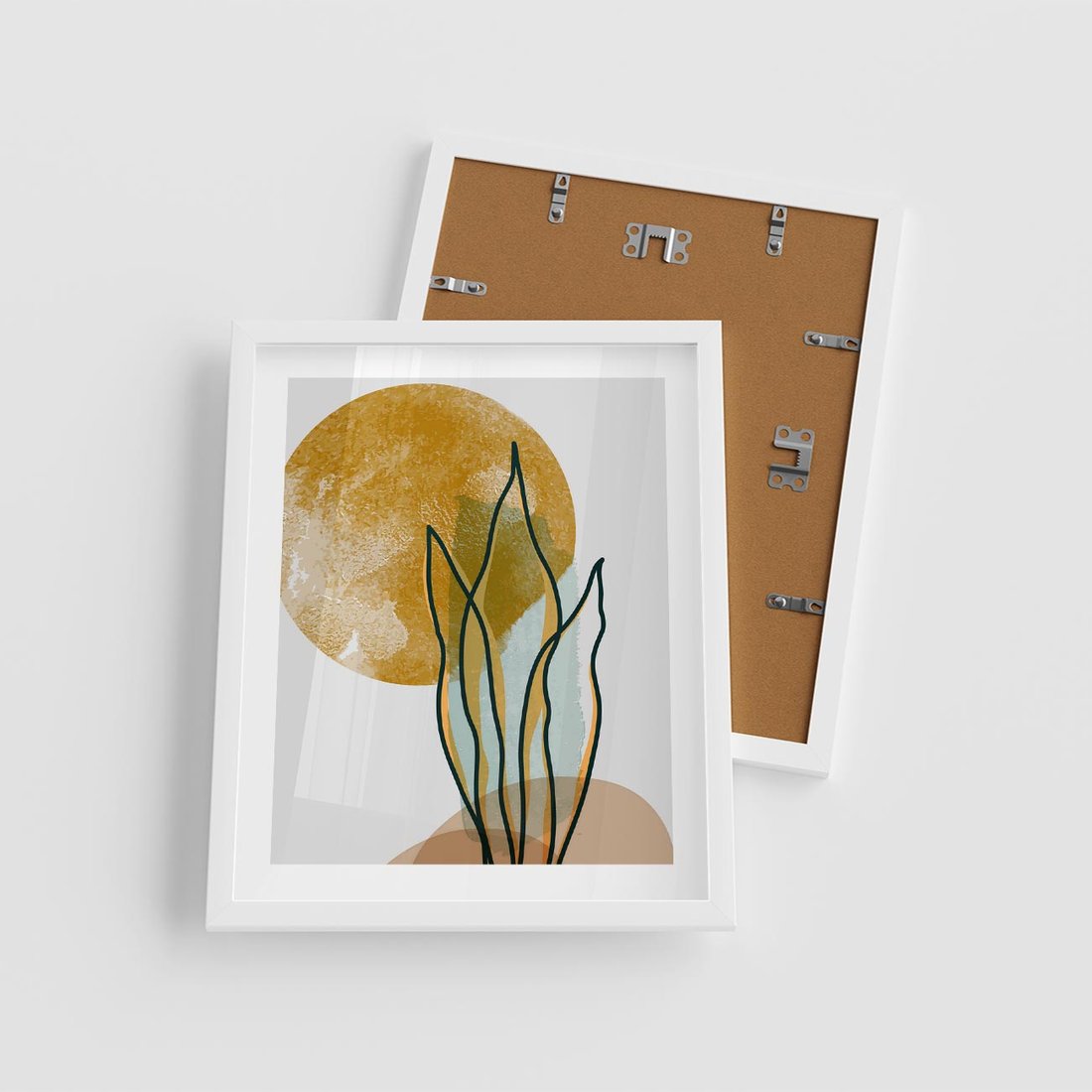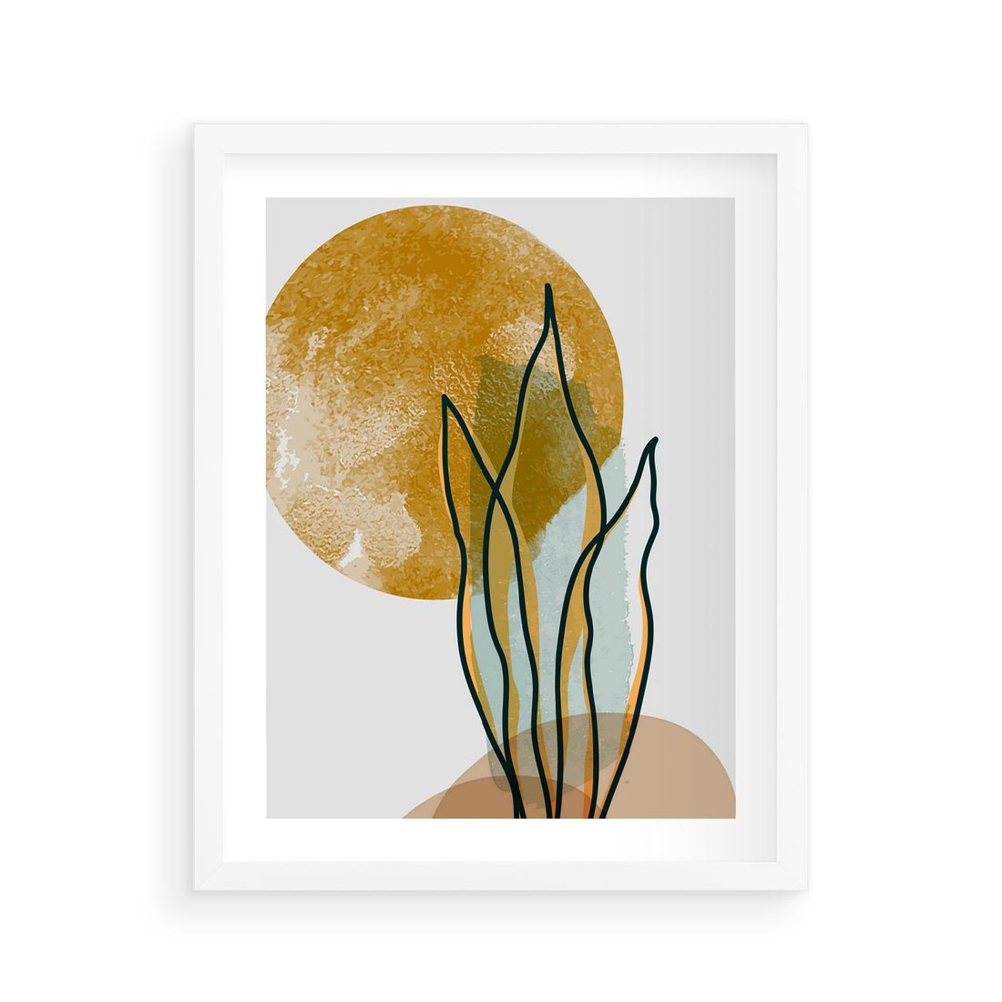 Plakat w ramie 40x50 - Światło Natury: Graficzne Liście i Złote Słońce - grafika, graficzne liście - rama biała
