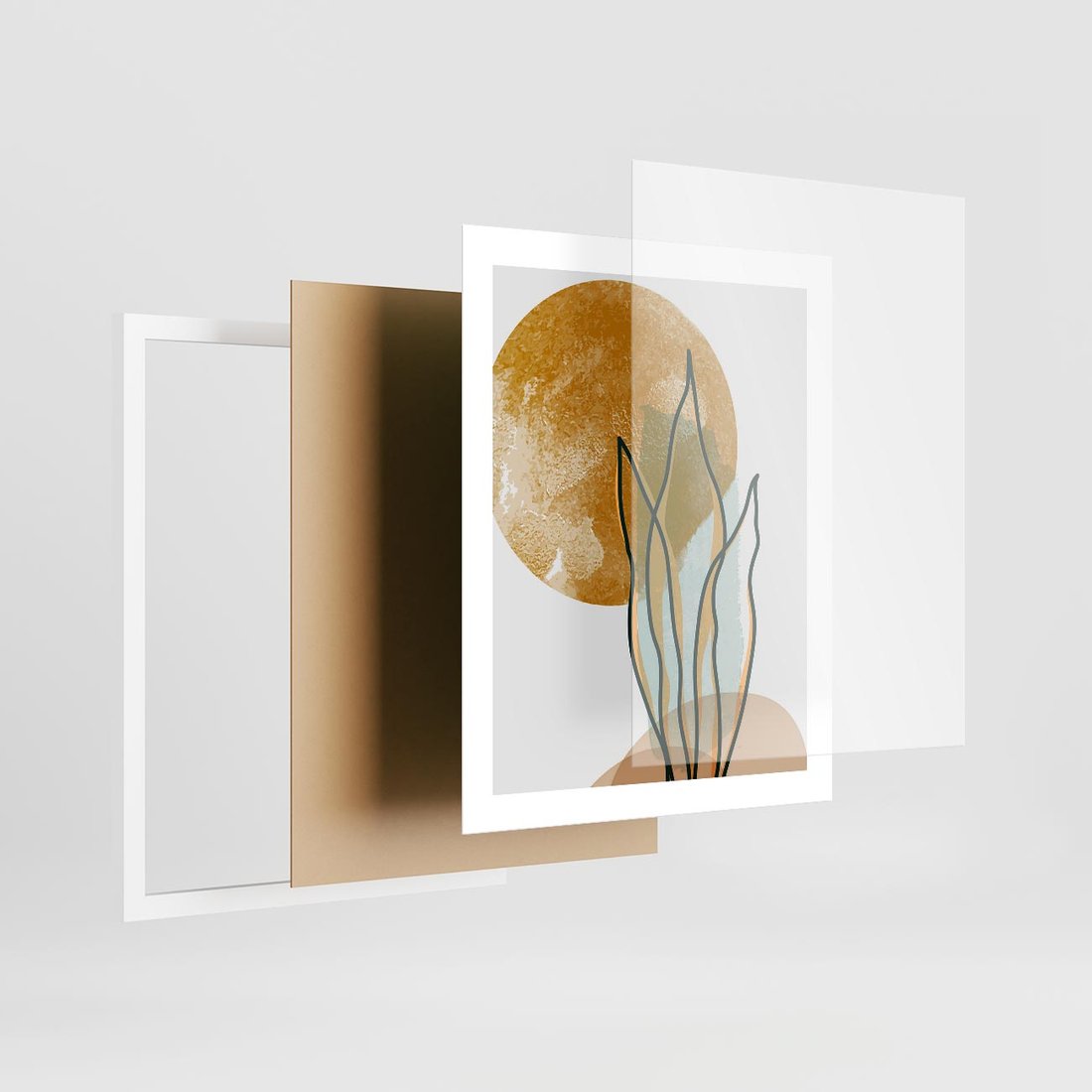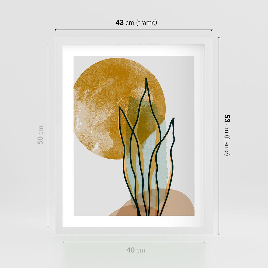 - Plakat w ramie 40x50 - Światło Natury: Graficzne Liście i Złote Słońce