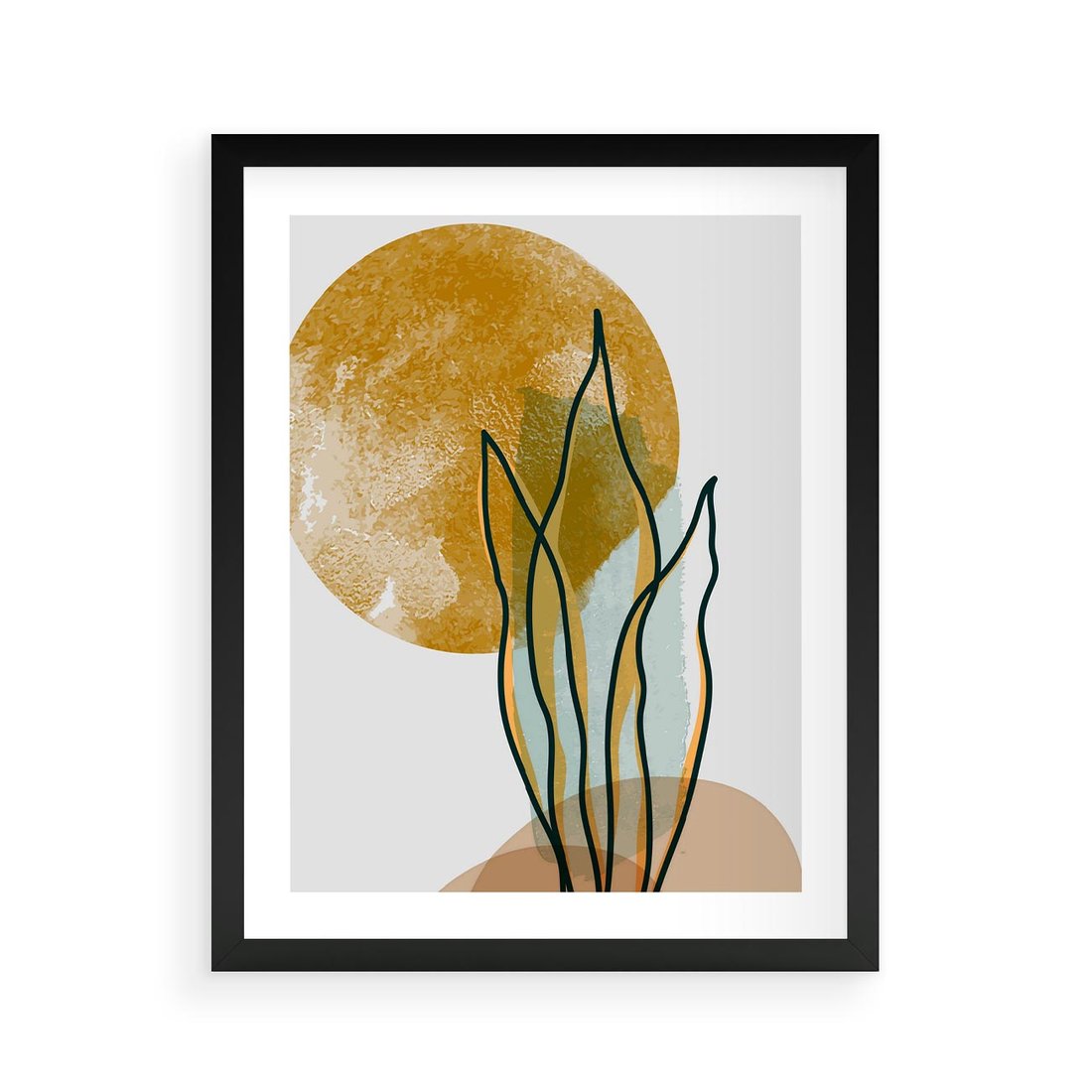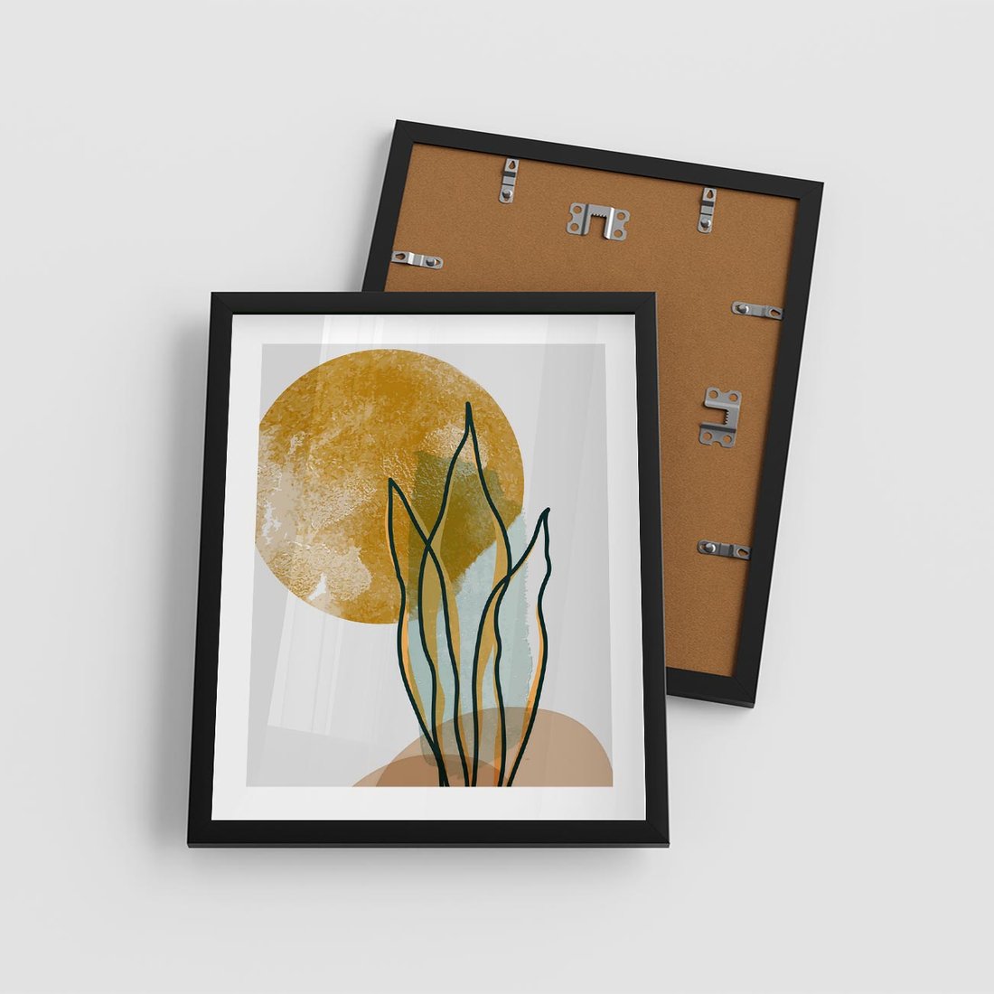- Plakat w ramie 40x50 - Światło Natury: Graficzne Liście i Złote Słońce