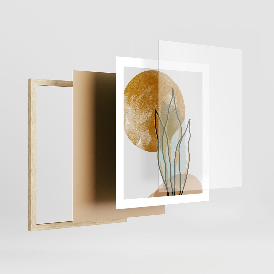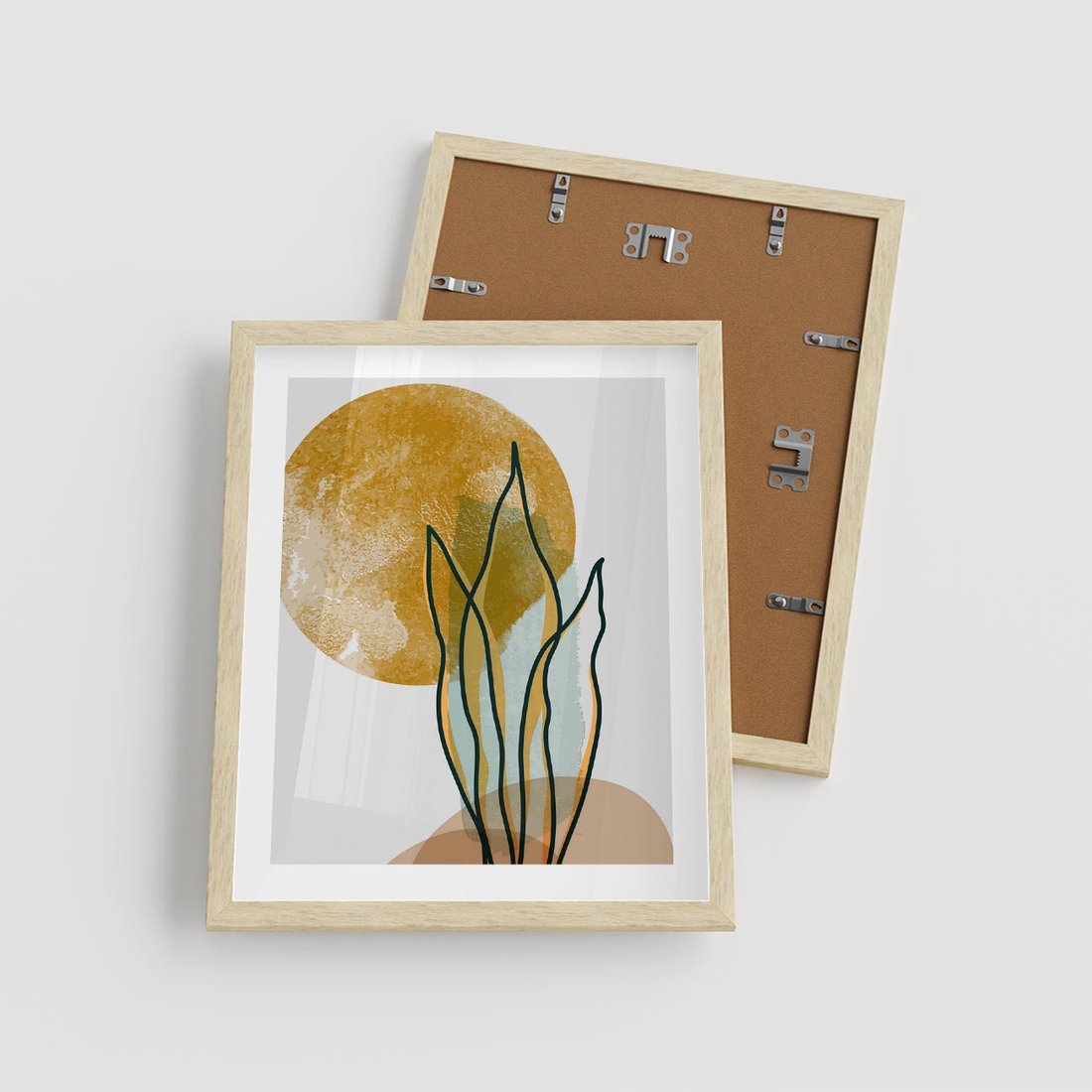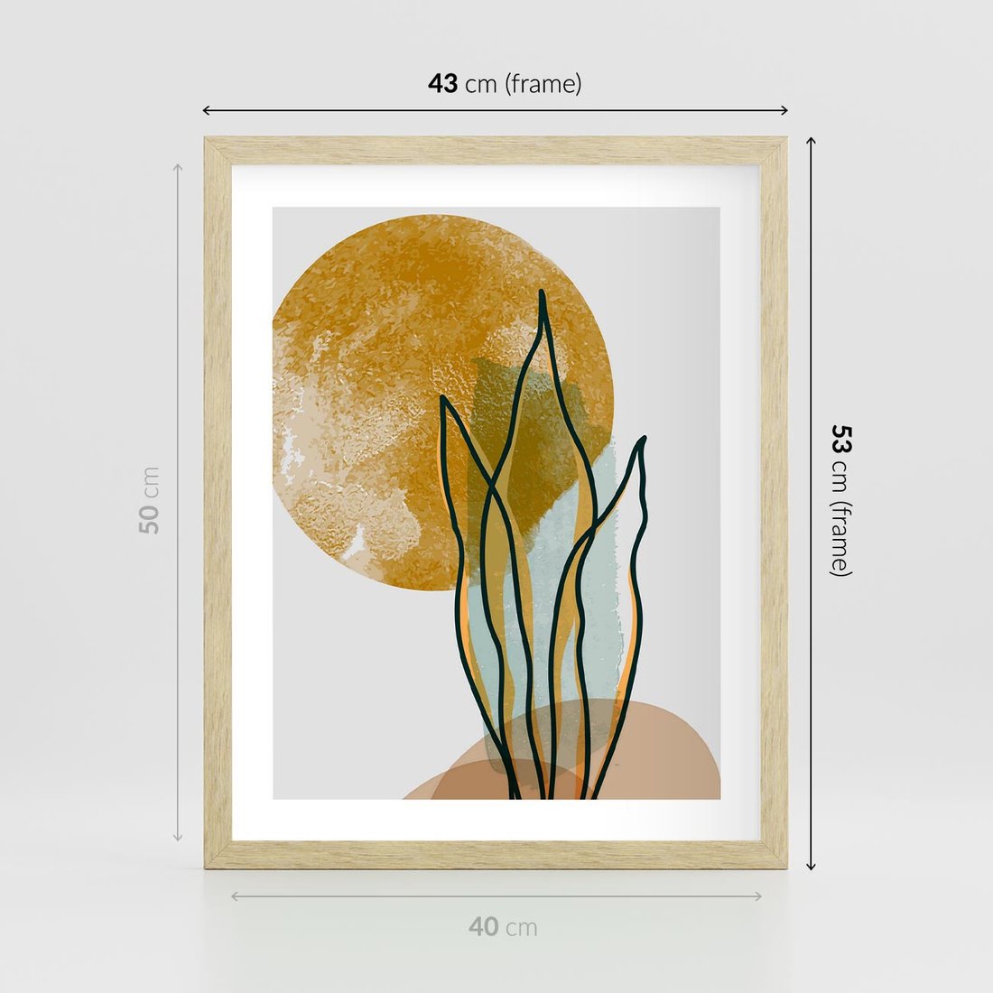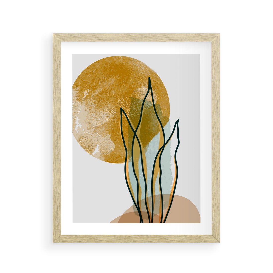 - Plakat w ramie 40x50 - Światło Natury: Graficzne Liście i Złote Słońce
