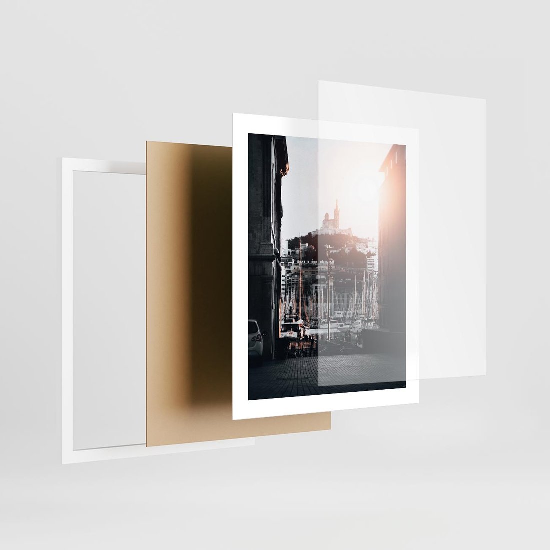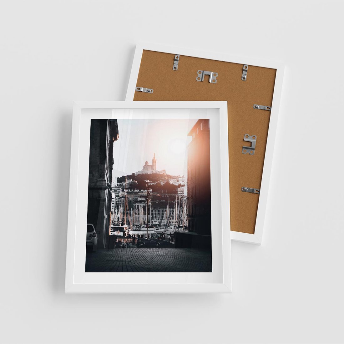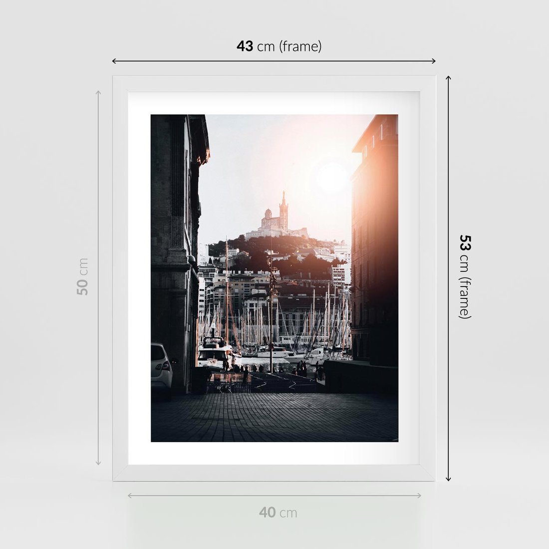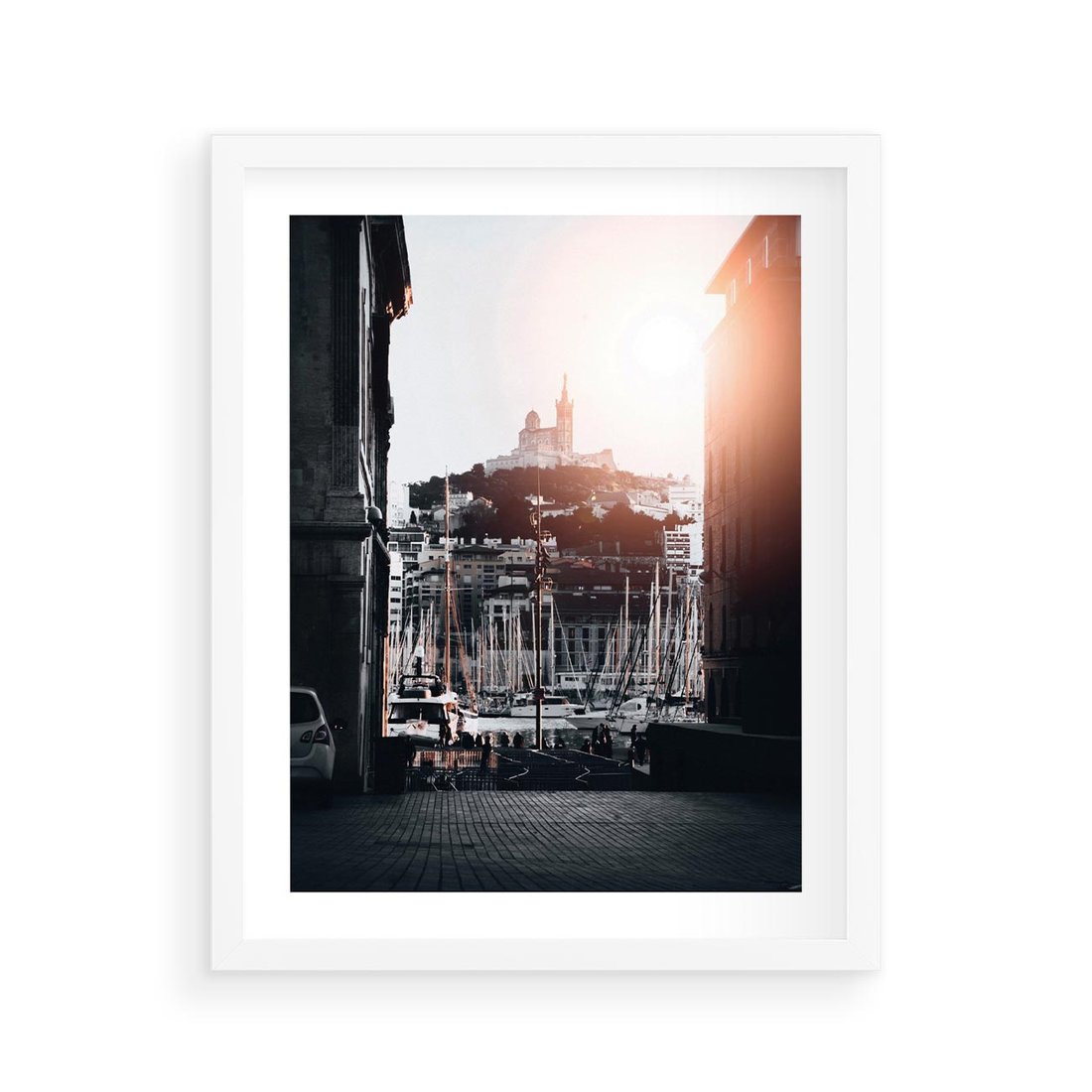 Plakat w ramie 40x50 - Światło Portowe - czarno białe zdjecie, uliczka w nadmorskim mieście - rama biała