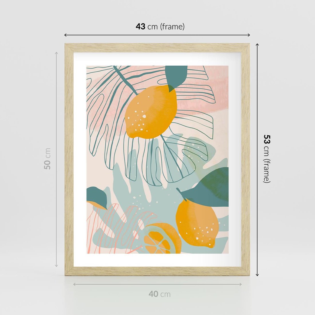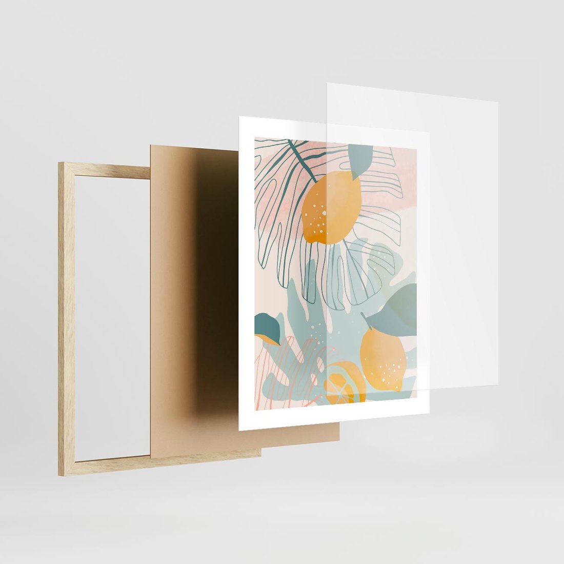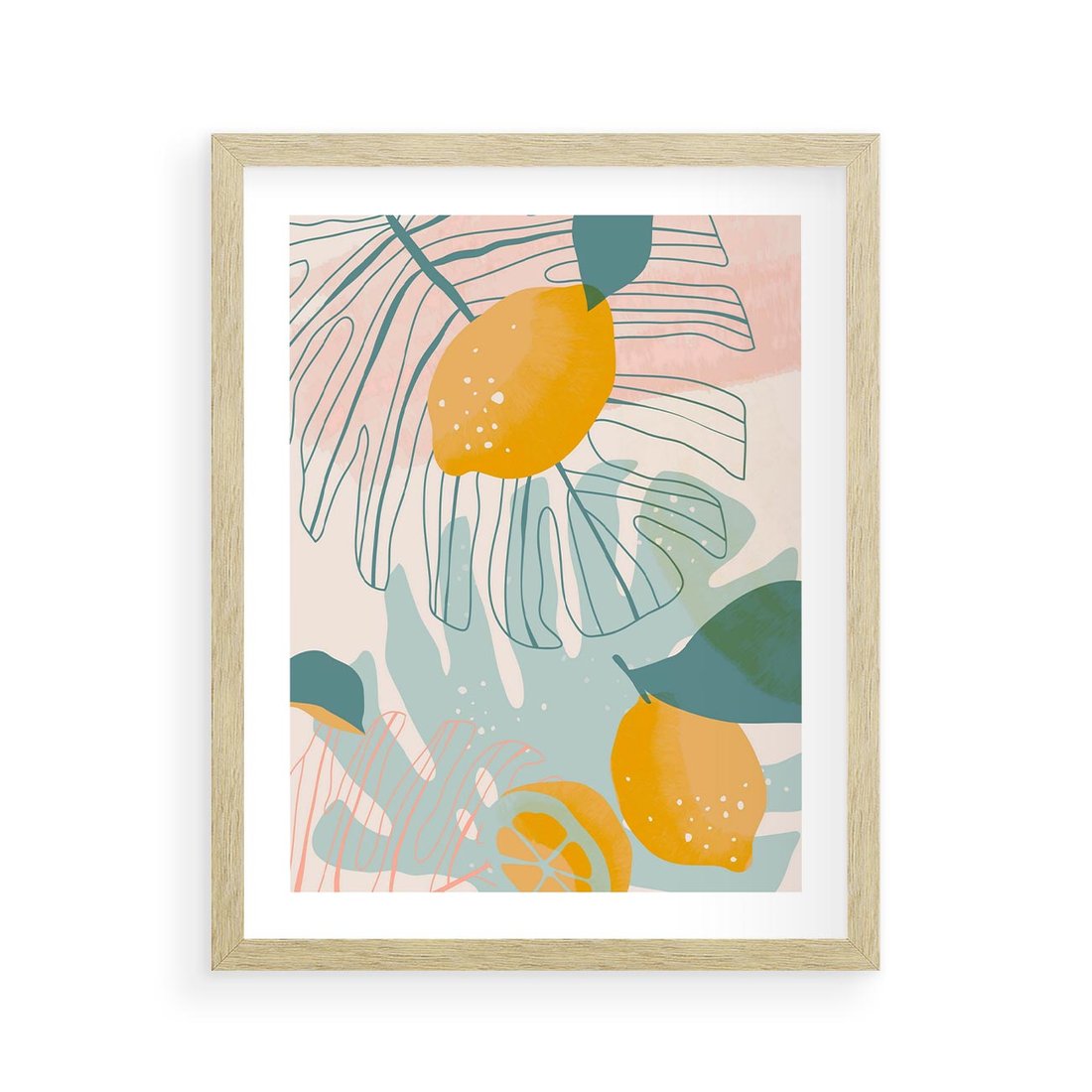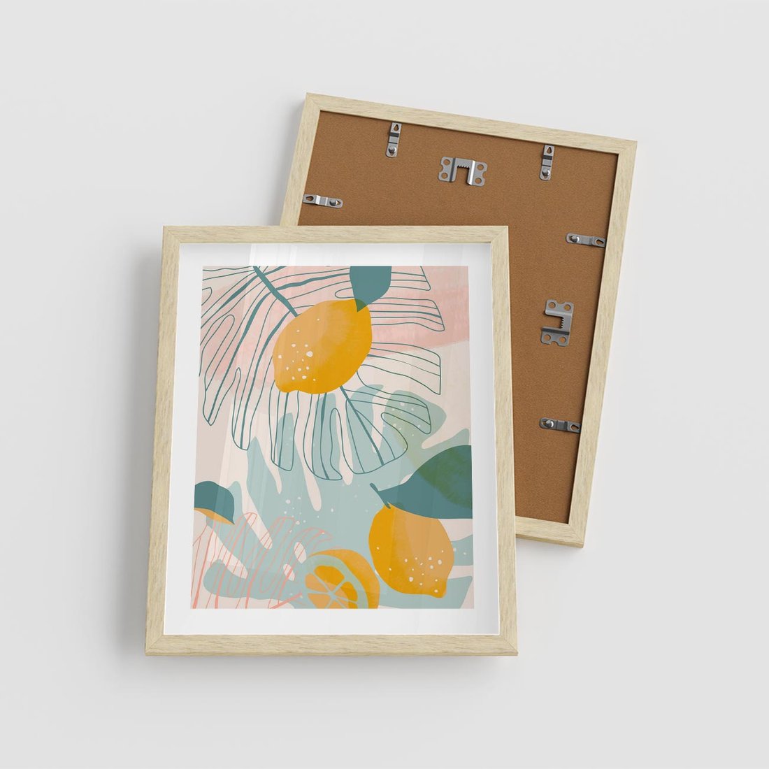 To plakat z nowoczesną grafiką, w którym dominują pastelowe kolory i motywy liści monstery oraz cytryn. Plakat łączy w sobie świeżość natury i nowoczesny design.