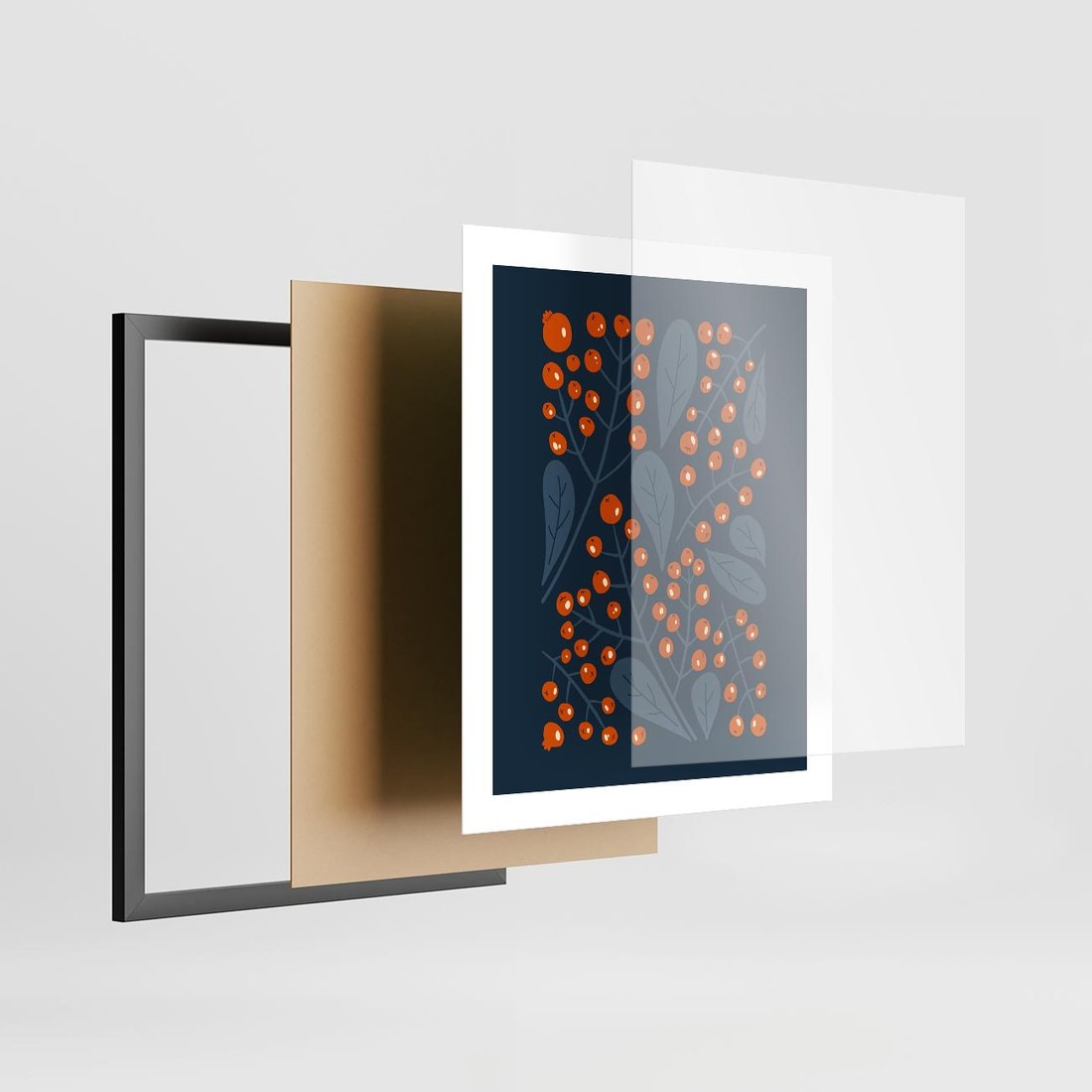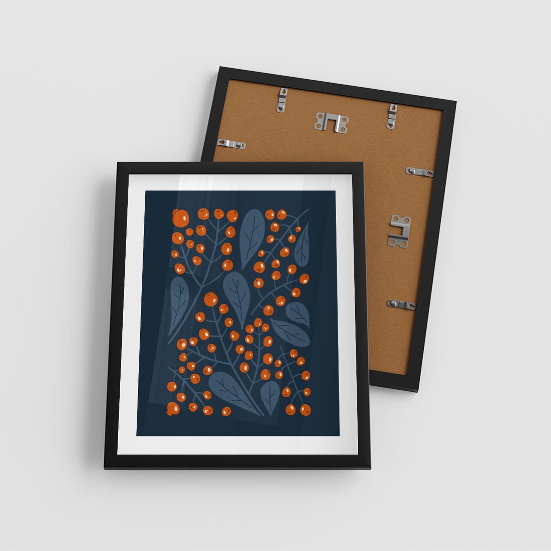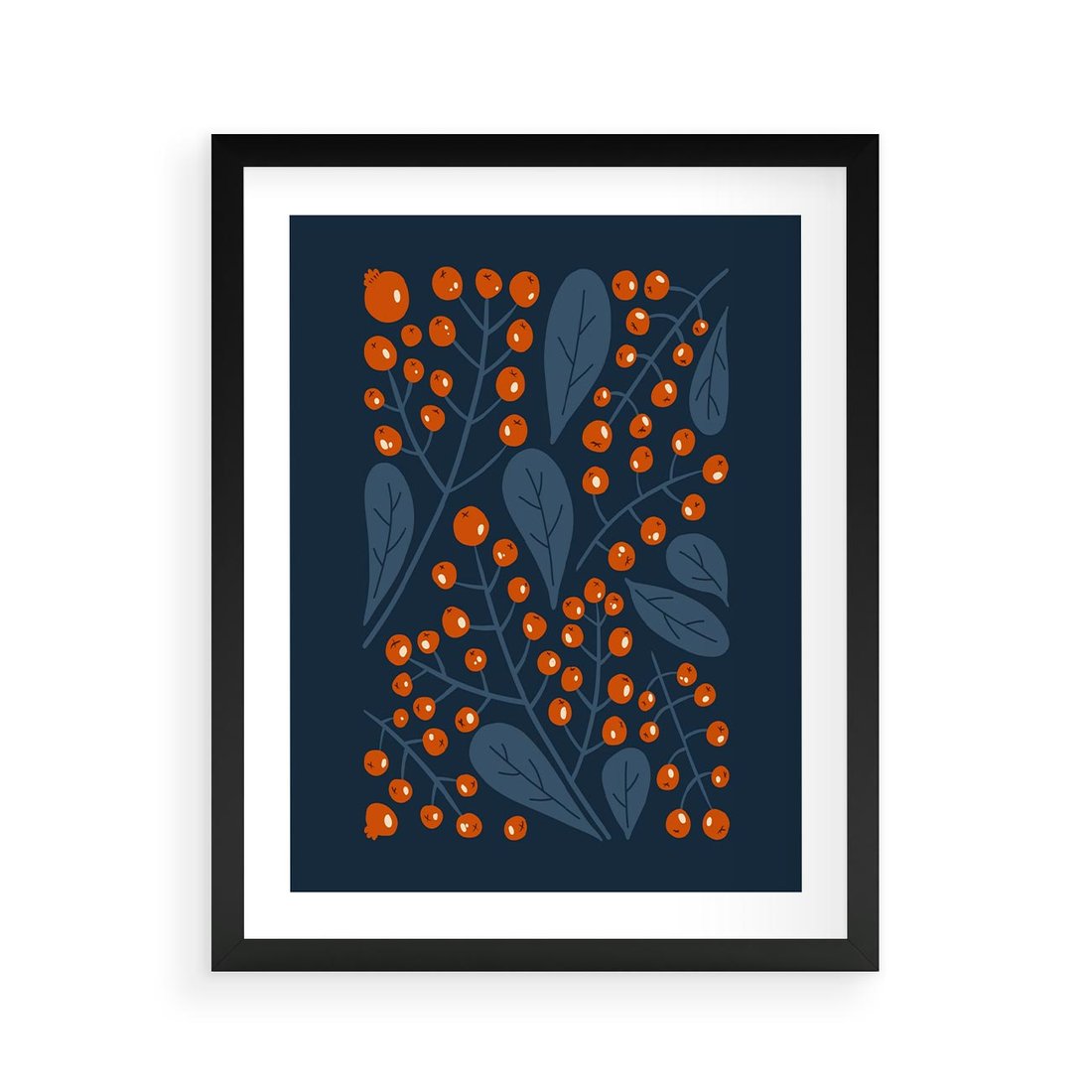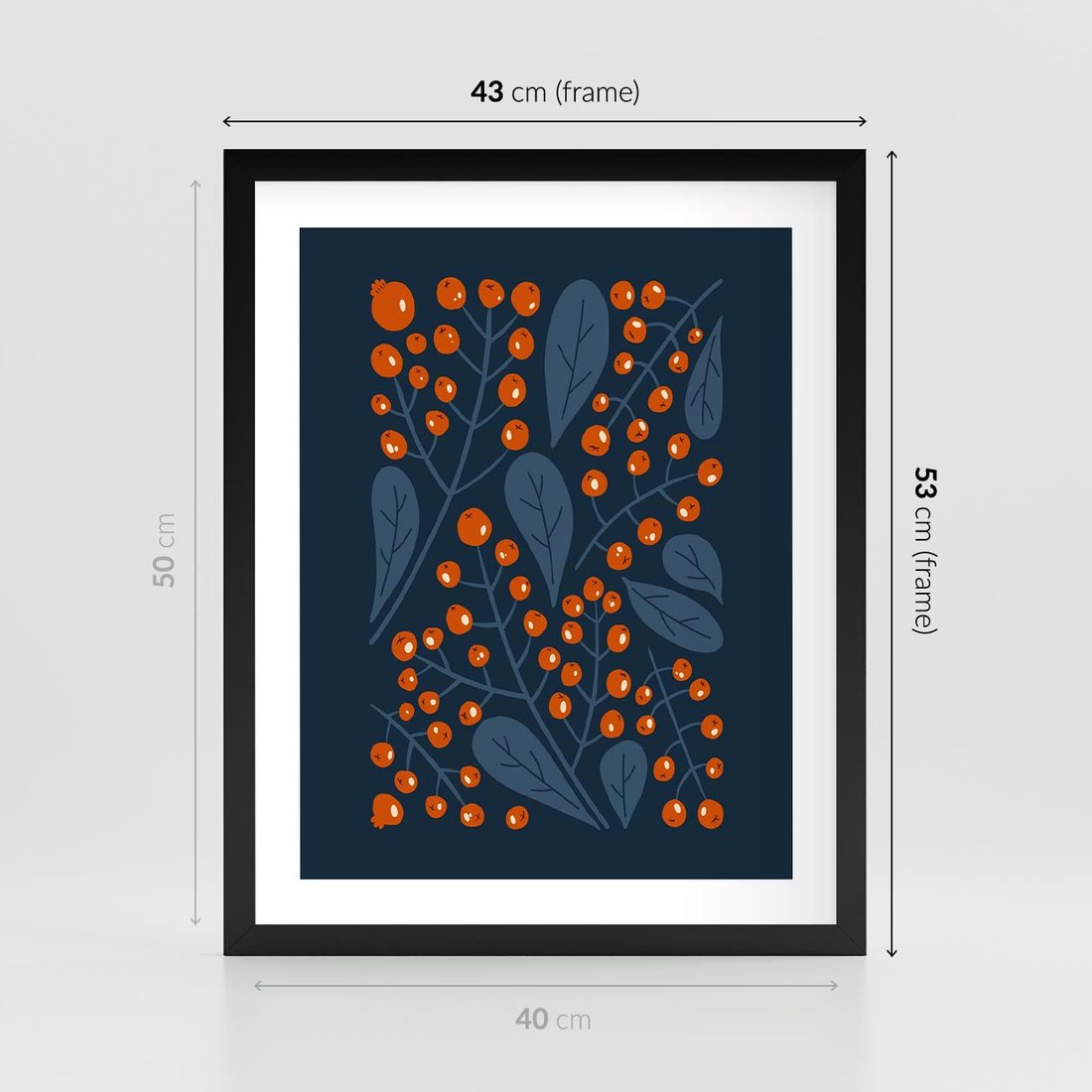 Plakat w ramie 40x50 - Symfonia liści i owoców - granatowe tło, pomarańczowe owoce jarzębiny - rama czarna