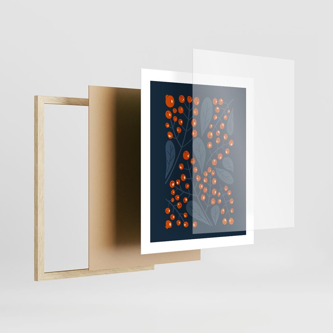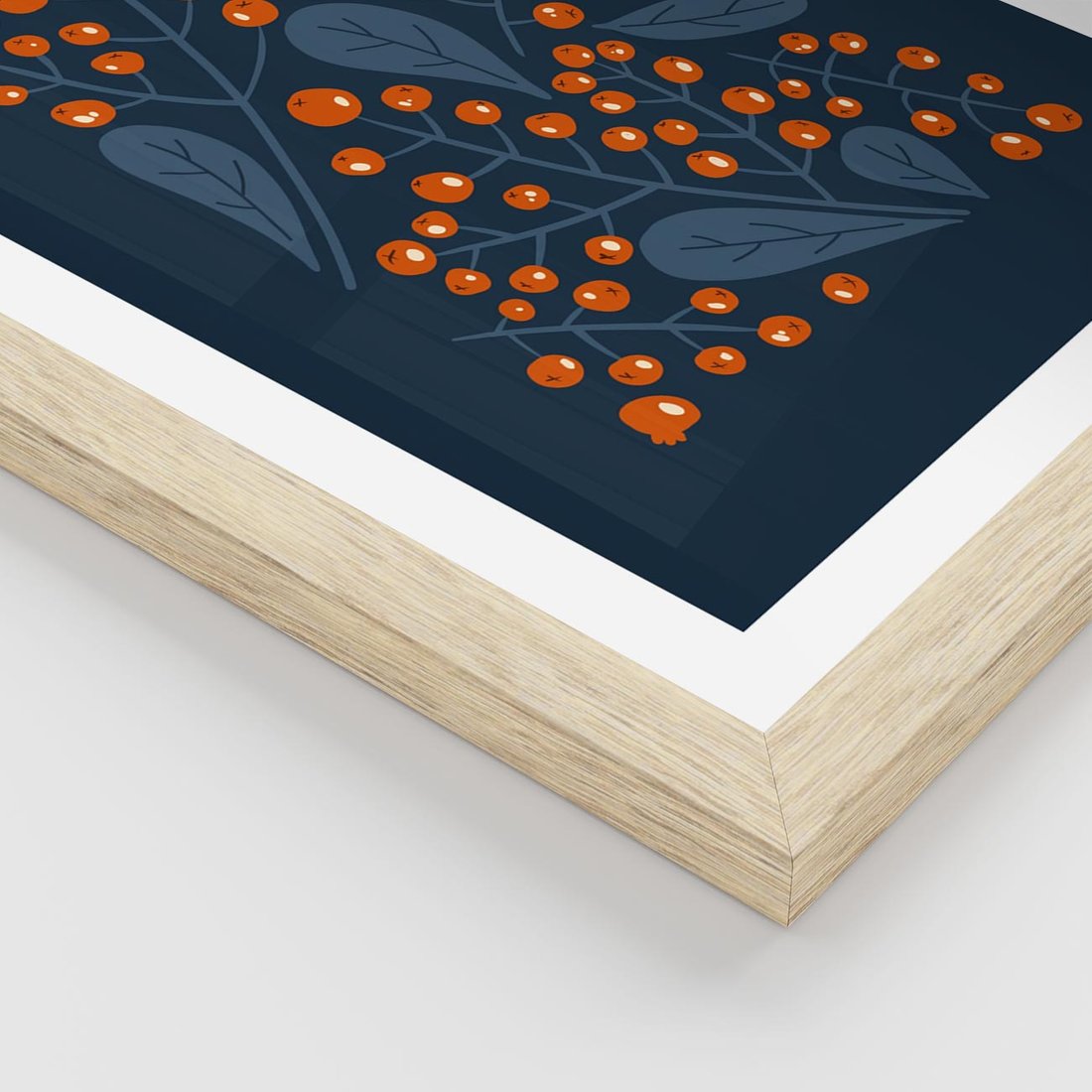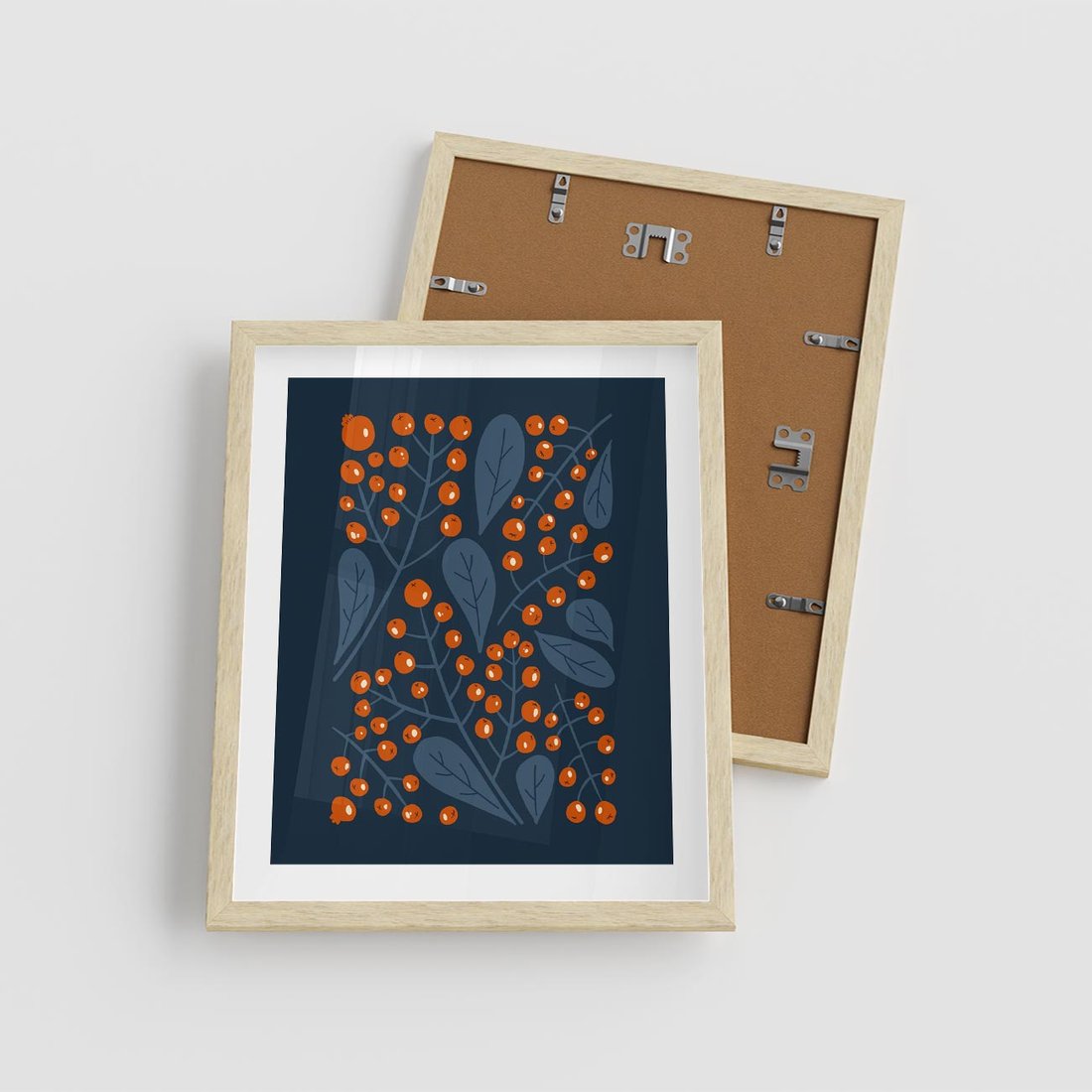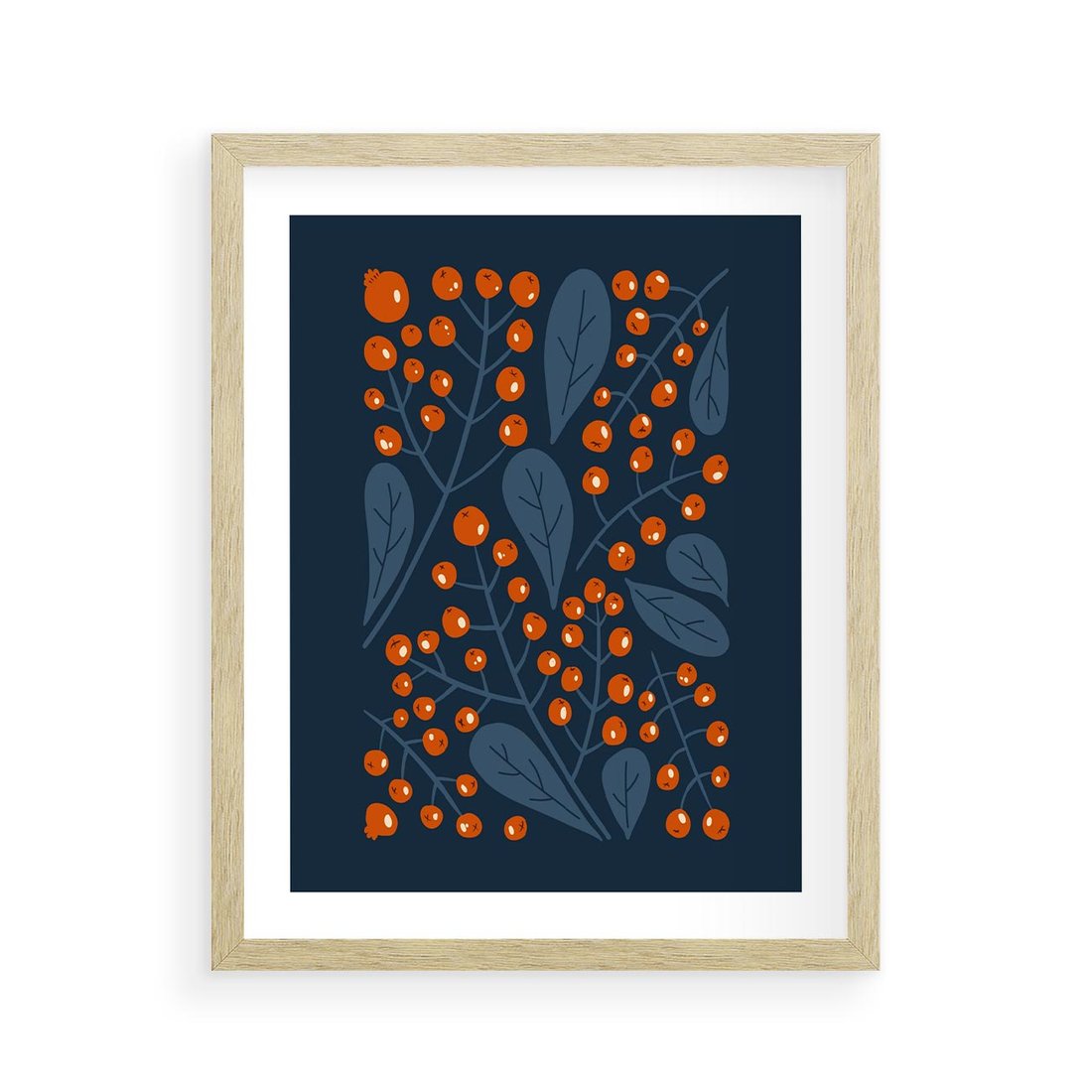 Plakat w ramie 40x50 - Symfonia liści i owoców - granatowe tło, pomarańczowe owoce jarzębiny - rama drewno
