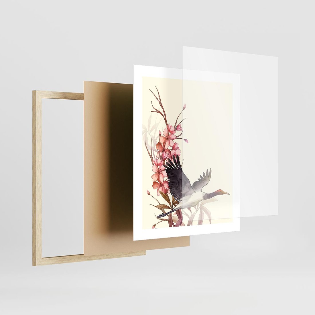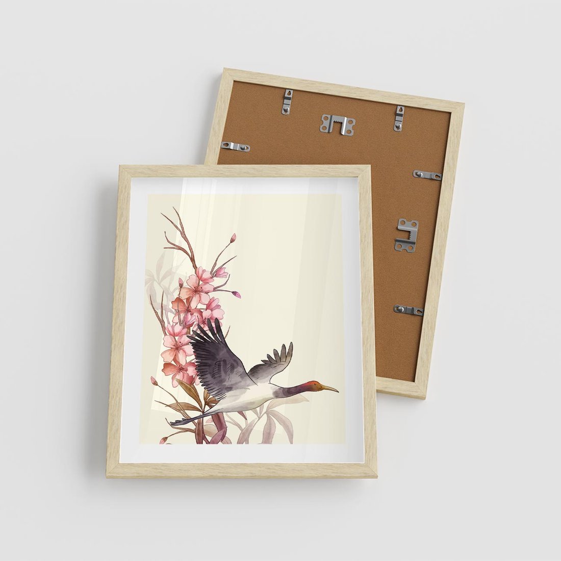 Wprowadź harmonię Japandi do swojego wnętrza z japońską sztuką przedstawiającą ptaka i kwiat wiśni. To spokojne połączenie, które przyniesie równowagę i estetykę natury do Twojego otoczenia.