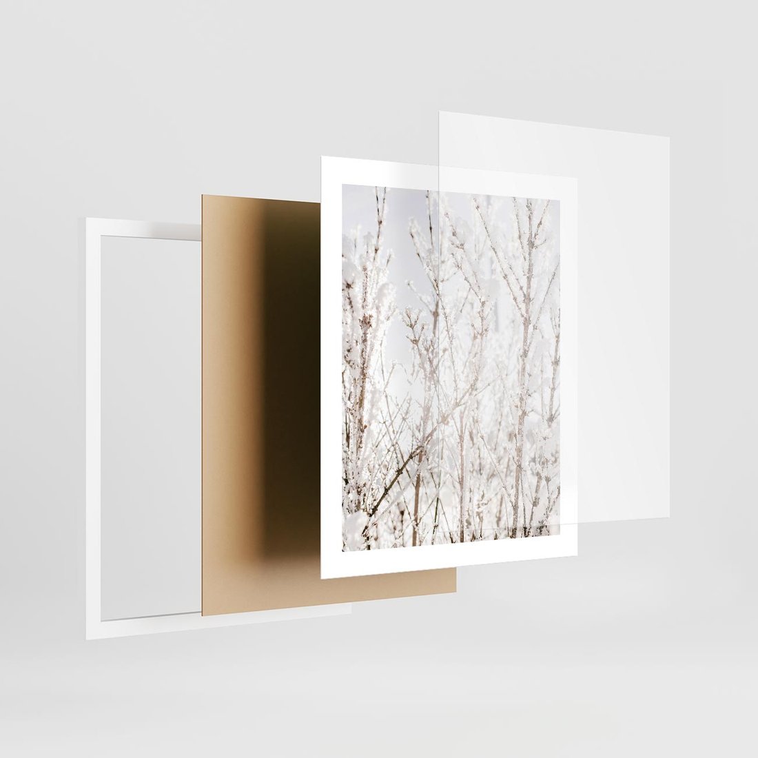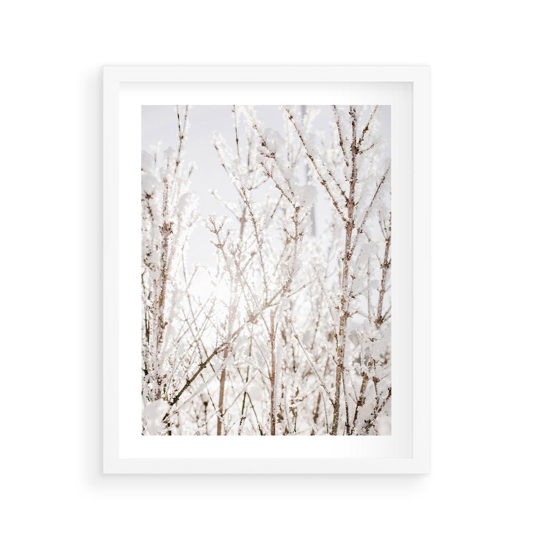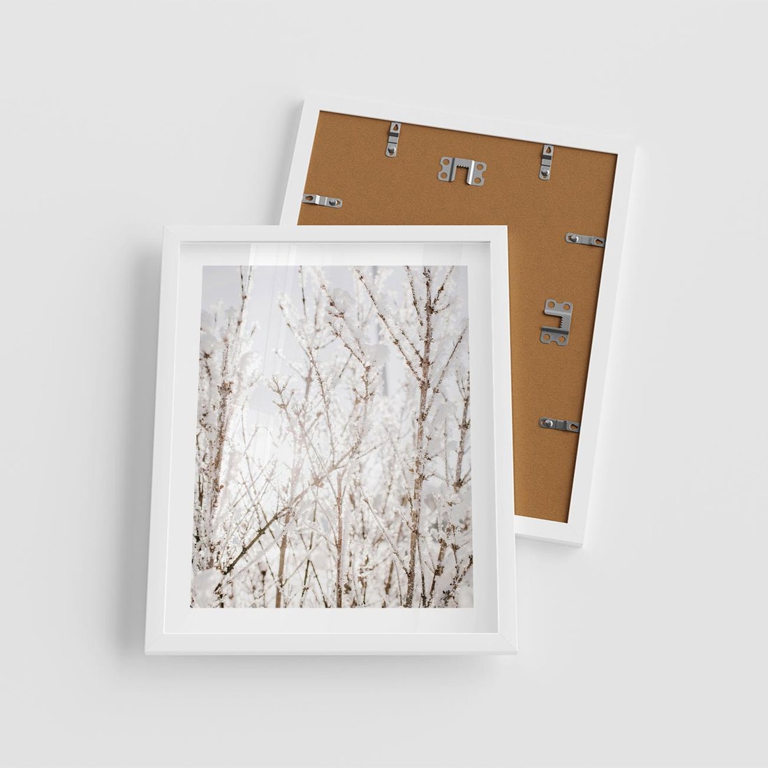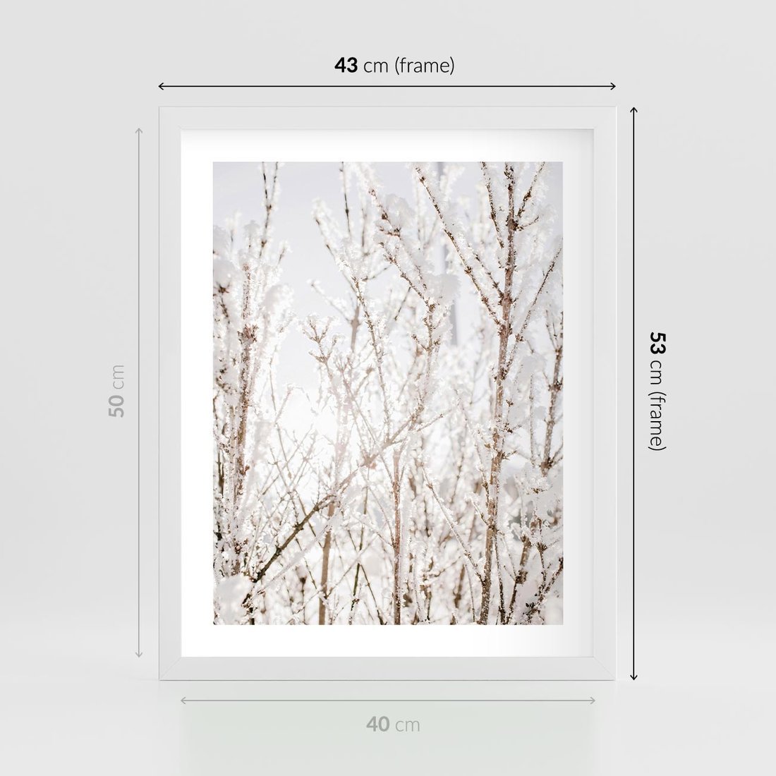 Plakat w ramie 40x50 - Szron na Gałęziach - ośnieżone gałązki, szron na gałęziach - rama biała