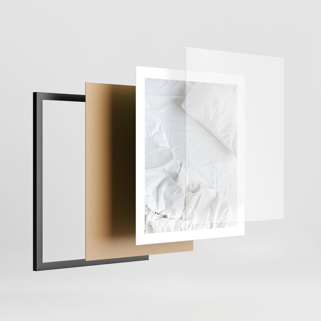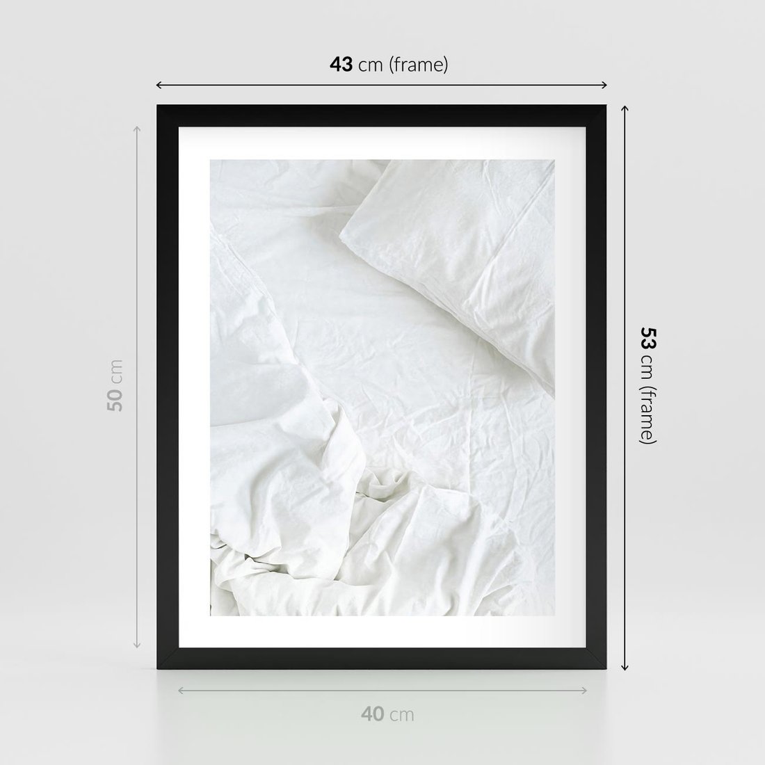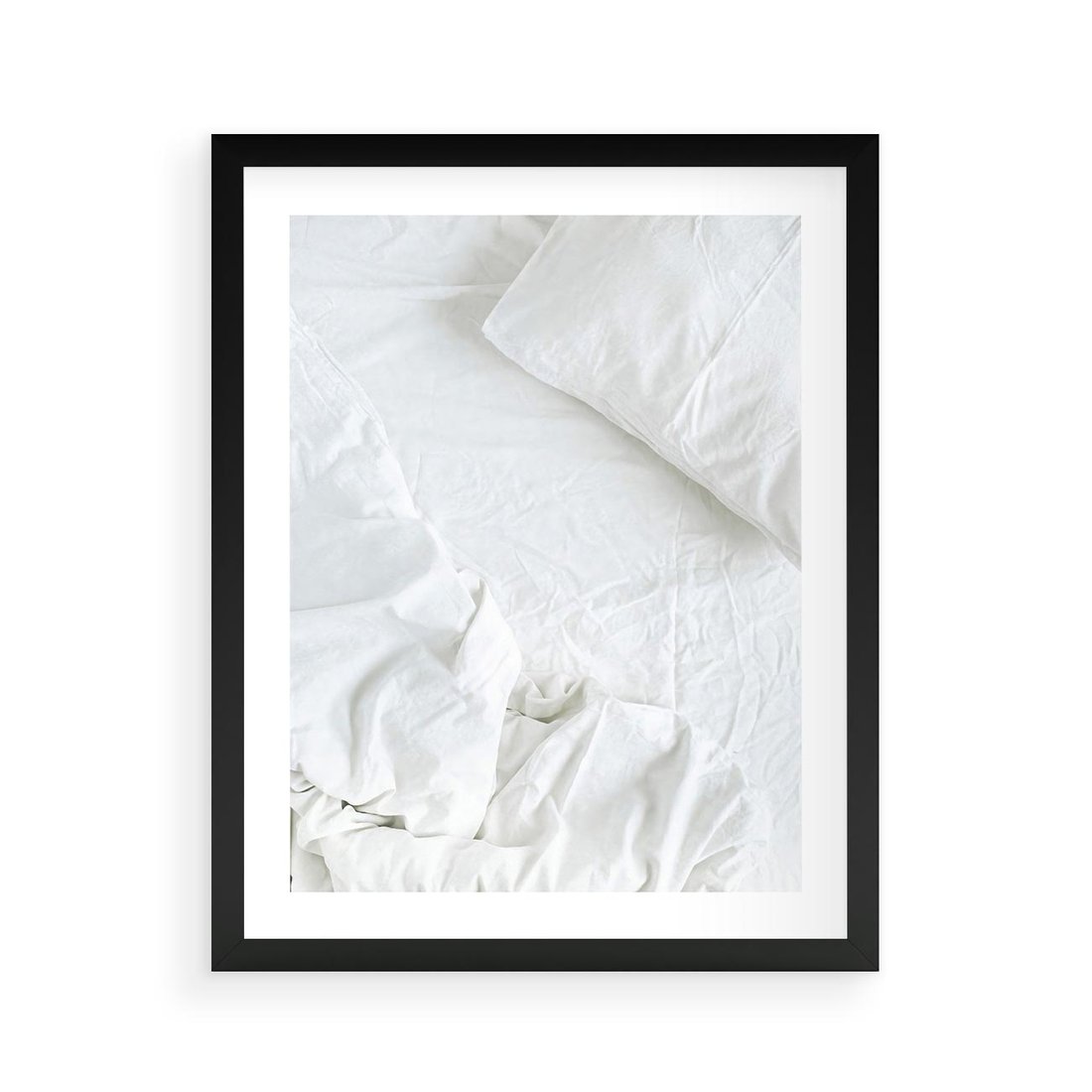 Plakat w ramie 40x50 - Sztuka i Komfort - pościel, biała kołdra poduszka - rama czarna