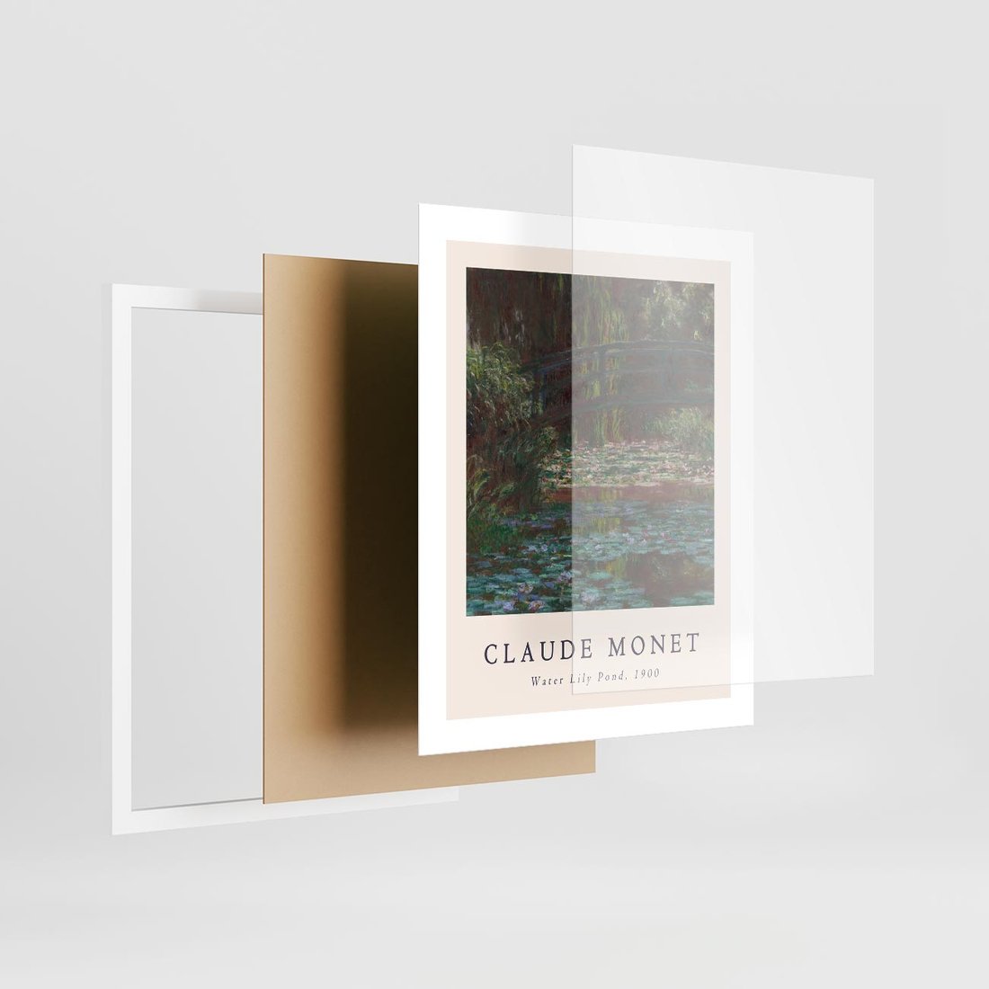 Reprodukcja słynnego obrazu Claude'a Moneta przedstawiającego staw z kwiatami, wzbogacona o starannie dobraną typografię, tworzy elegancki plakat artystyczny.