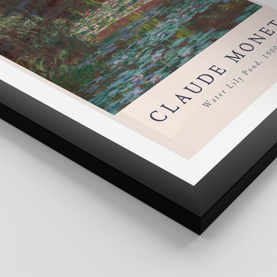 Reprodukcja słynnego obrazu Claude'a Moneta przedstawiającego staw z kwiatami, wzbogacona o starannie dobraną typografię, tworzy elegancki plakat artystyczny.