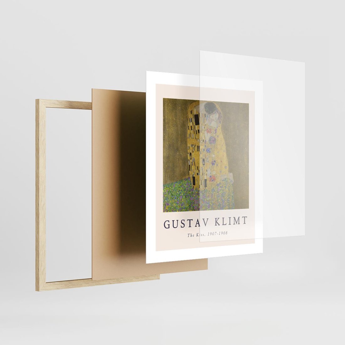 To jest reprodukcja słynnego dzieła Gustava Klimta zatytułowanego "Pocałunek". Plakat ten łączy w sobie piękno oryginalnego obrazu z elementami typografii.