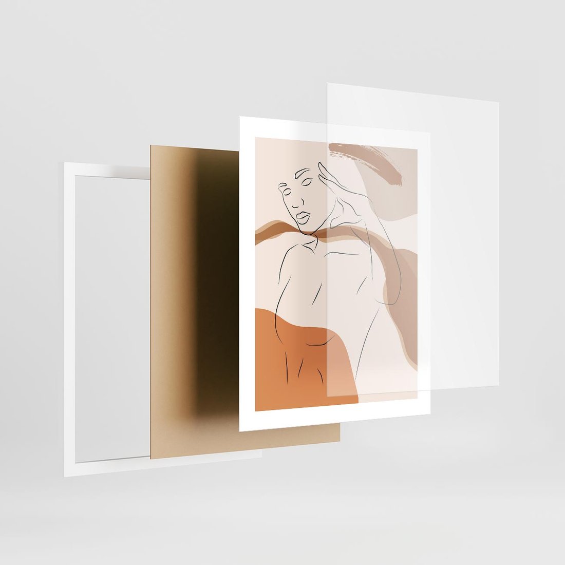 To szkic jedną linią przedstawiający nagą kobietę, w delikatnych odcieniach beżu i brązu. Obraz ten podkreśla piękno ciała w minimalistyczny sposób.