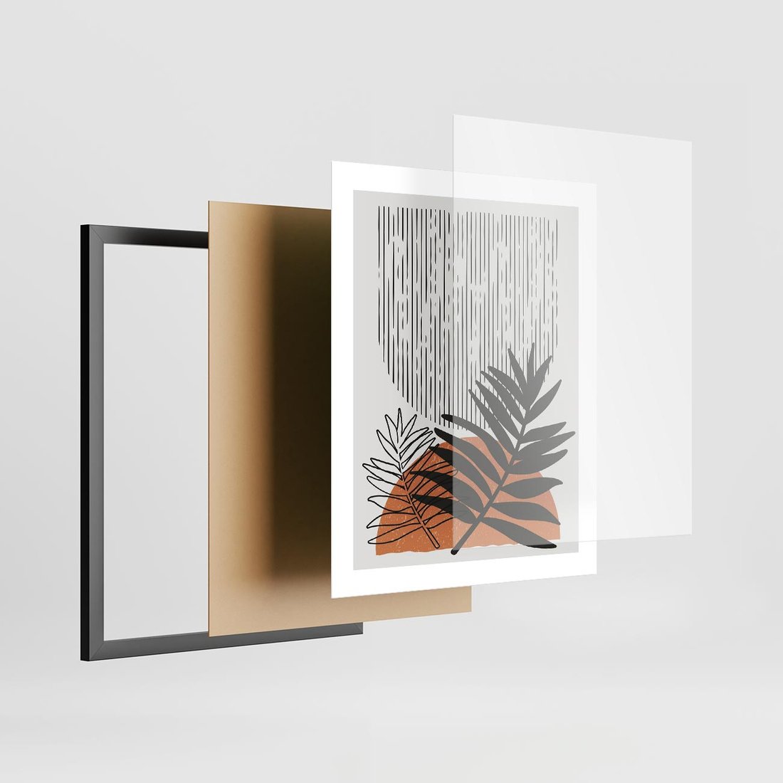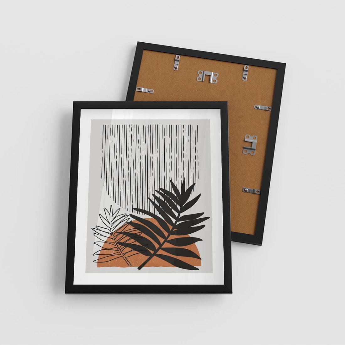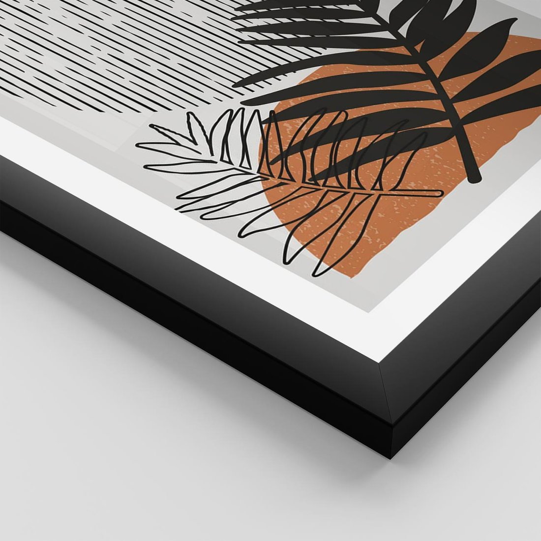 To nowoczesne dzieło sztuki o charakterystycznym stylu modern, które przedstawia motyw boho liści. Obraz łączy w sobie nowoczesność z elementami boho, tworząc unikalny i kreatywny efekt.