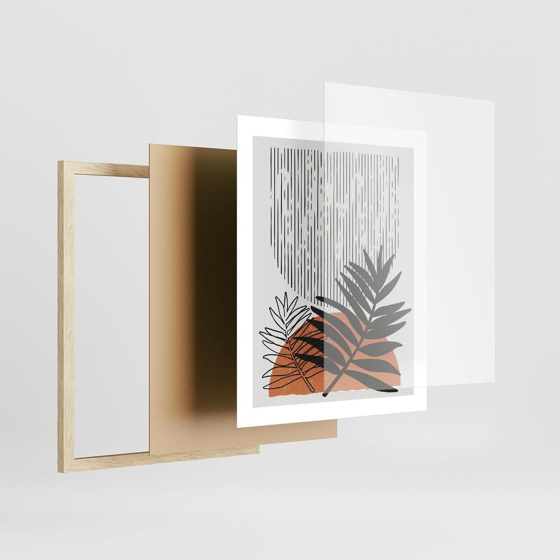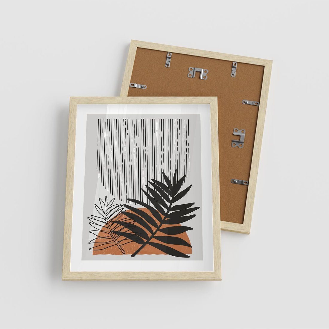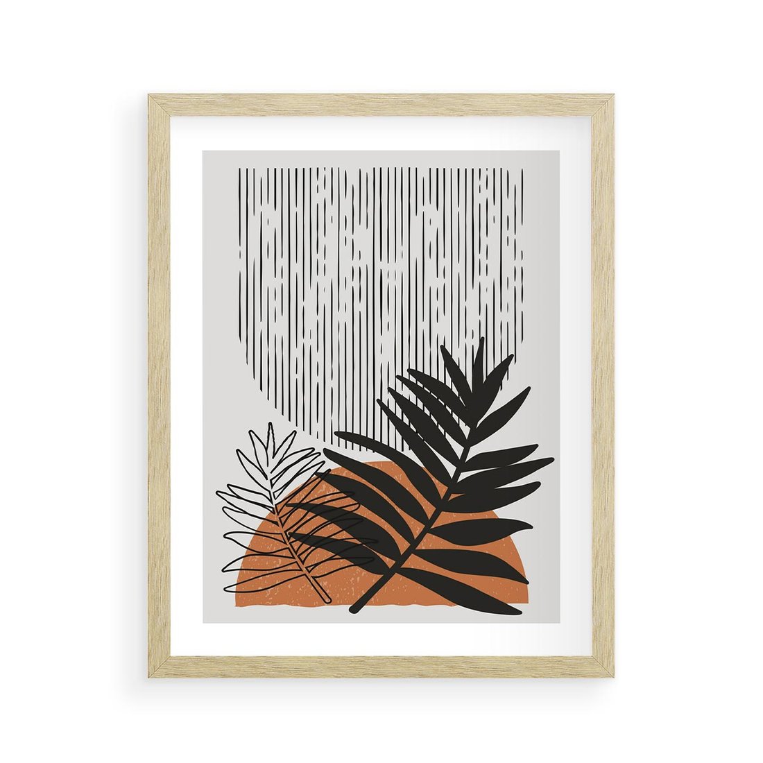 To nowoczesne dzieło sztuki o charakterystycznym stylu modern, które przedstawia motyw boho liści. Obraz łączy w sobie nowoczesność z elementami boho, tworząc unikalny i kreatywny efekt.