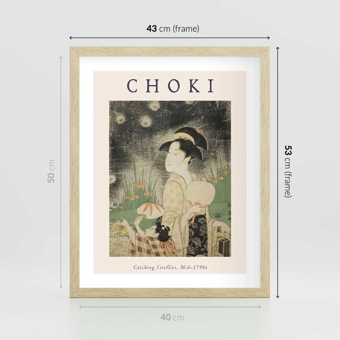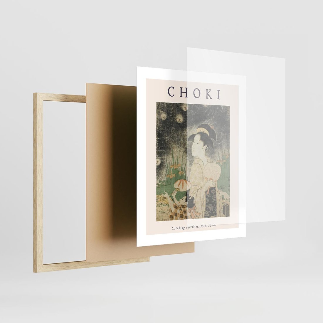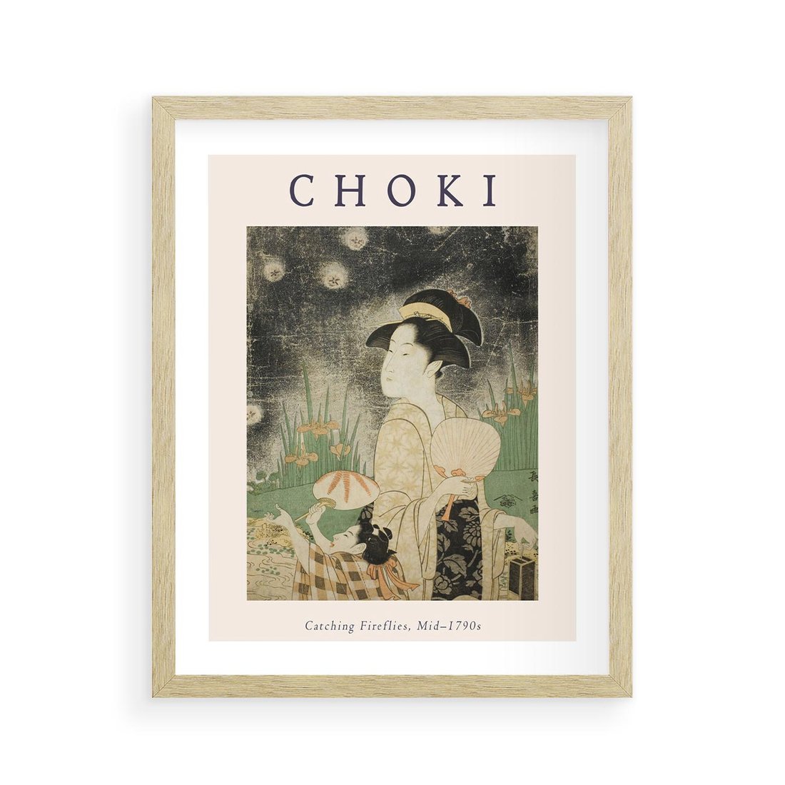 Obraz przedstawia reprodukcję ryciny, która nawiązuje do sztuki Chokiego, łączącej wpływy kultury chińskiej i japońskiej. Ta kompozycja jest pełna delikatności i subtelności.