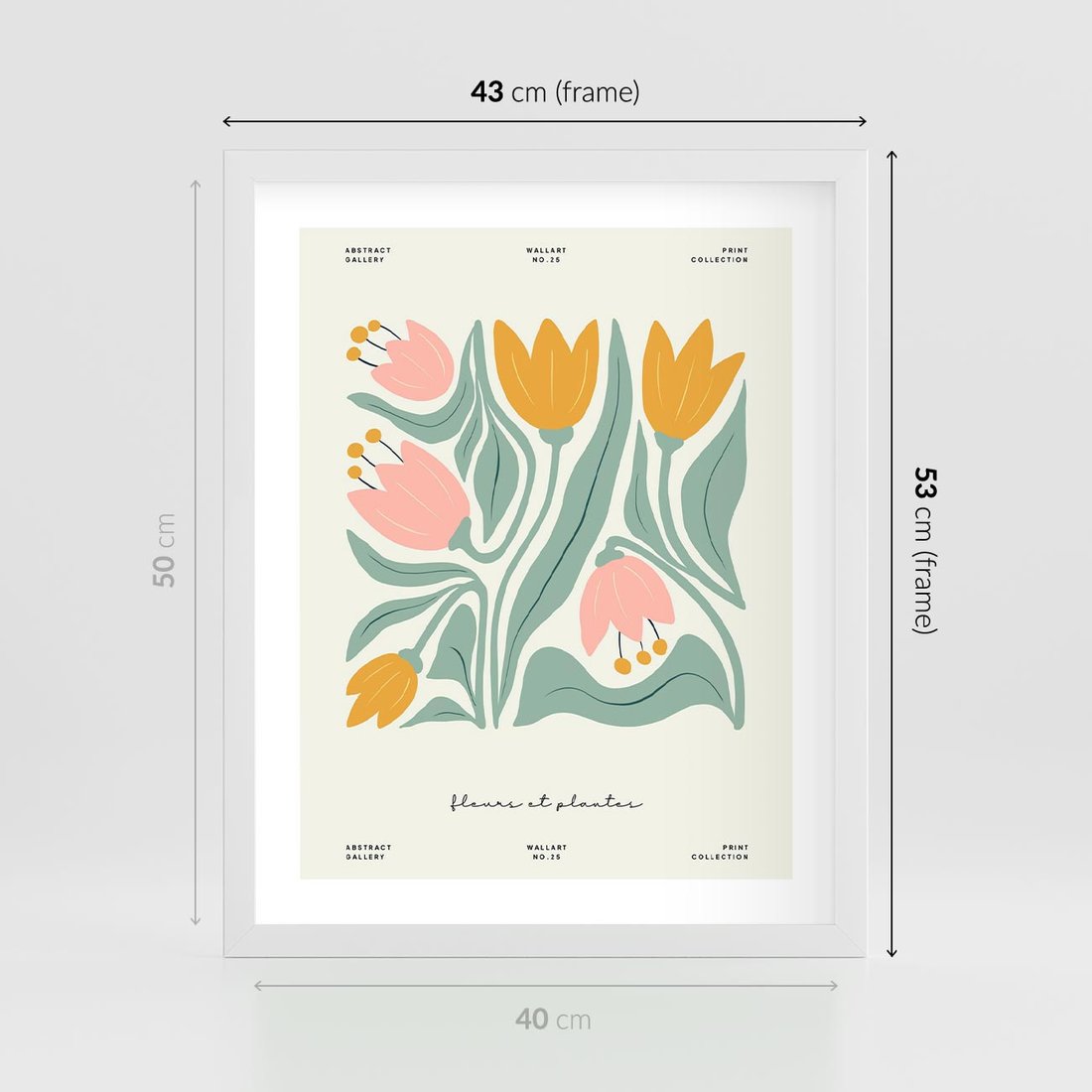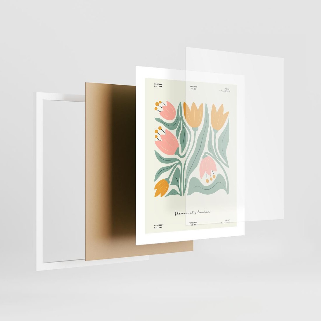 Ten plakat w nowoczesnej abstrakcji przywołuje piękno kwiatów w pastelowych tonach, w harmonii z delikatną typografią. Kompozycja tworzy subtelne i spokojne wrażenie, zachęcając do odkrywania piękna natury.