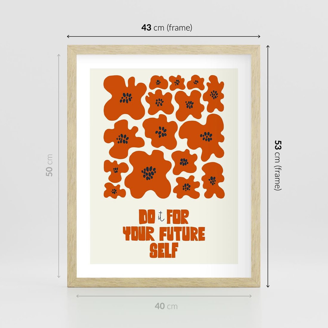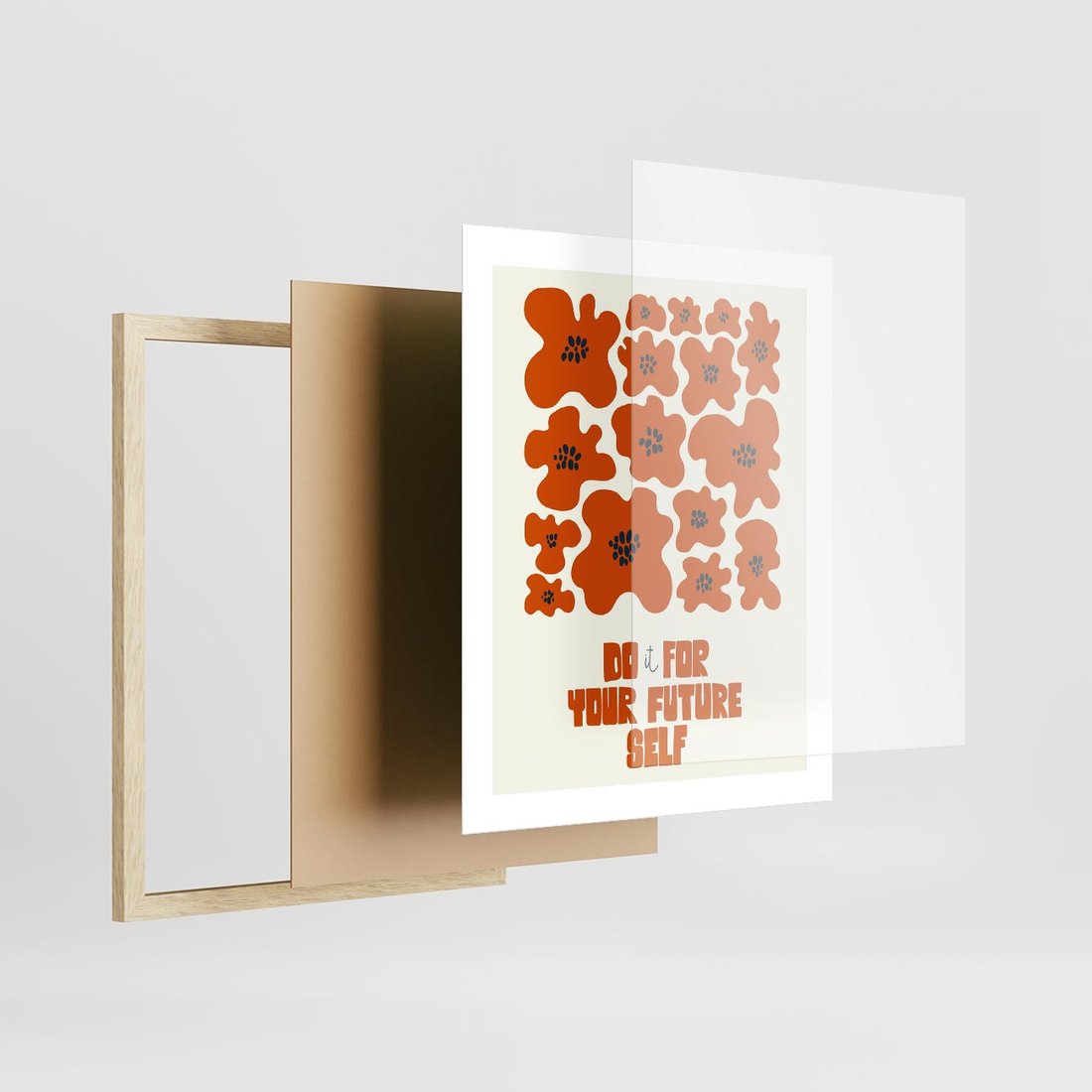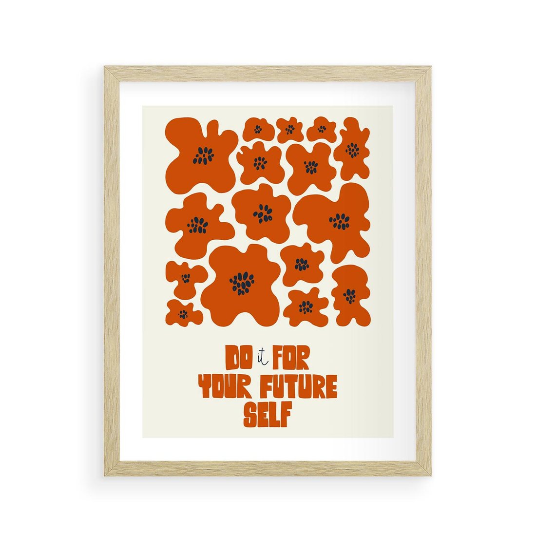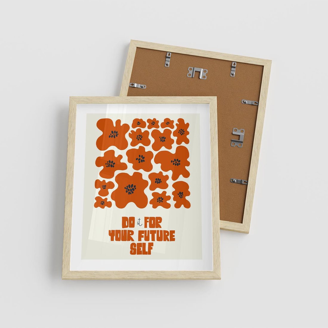 Ta nowoczesna grafika przedstawia kompozycję pomarańczowych kwiatów, która odzwierciedla ideę self-care. To obraz, który przypomina o ważności dbania o siebie, zachęcając do wewnętrznego odprężenia. Połączenie kwiatów z inspirującą typografią tworzy piękny przekaz, wprowadzając do wnętrza dawkę pozytywnej energii.