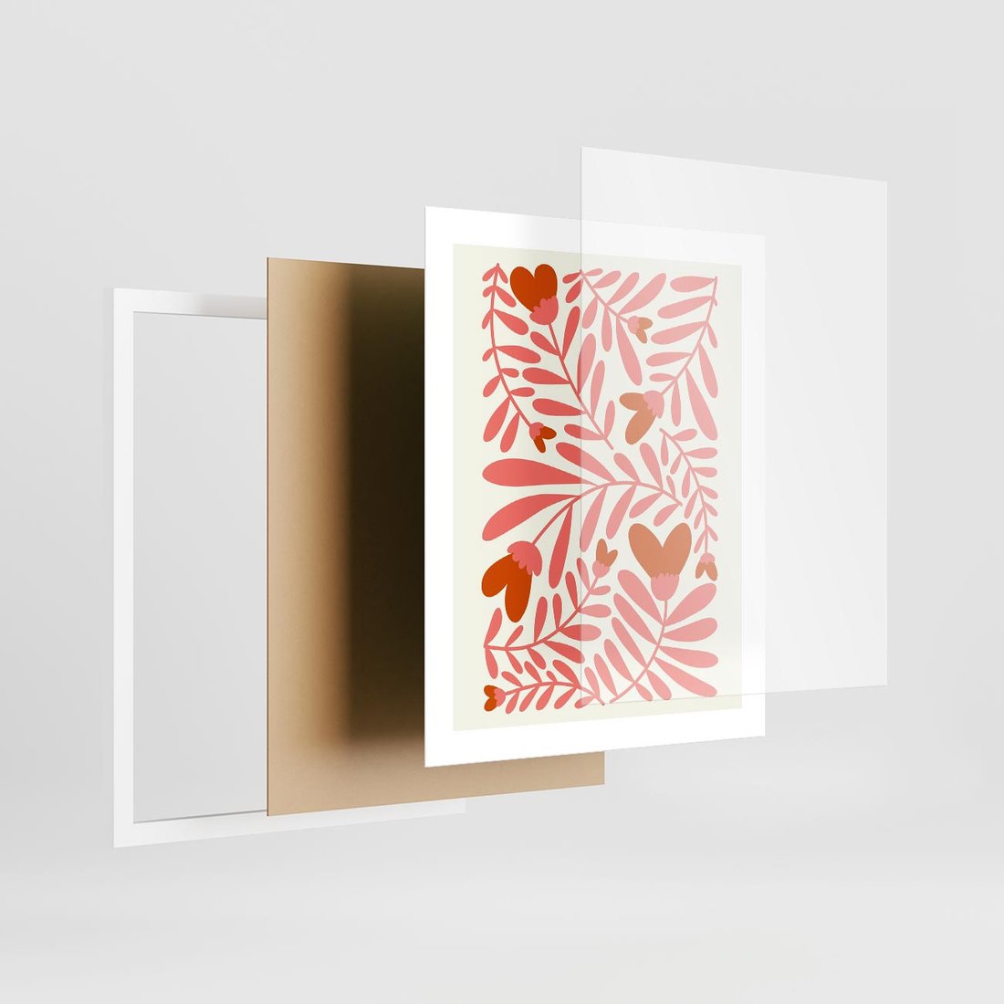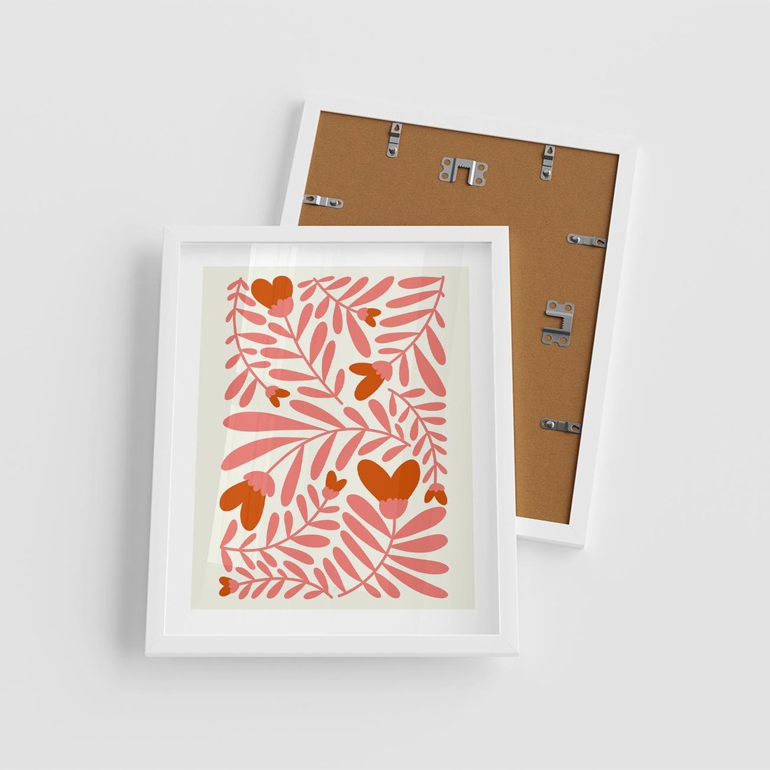 Ta nowoczesna grafika w pastelowych odcieniach tworzy kwiatową kompozycję w pięknych granatowych, różowych i pomarańczowych tonacjach. To obraz harmonii i wyrazistości, który wniesie do wnętrza radość i energię natury w nowoczesnym wydaniu.