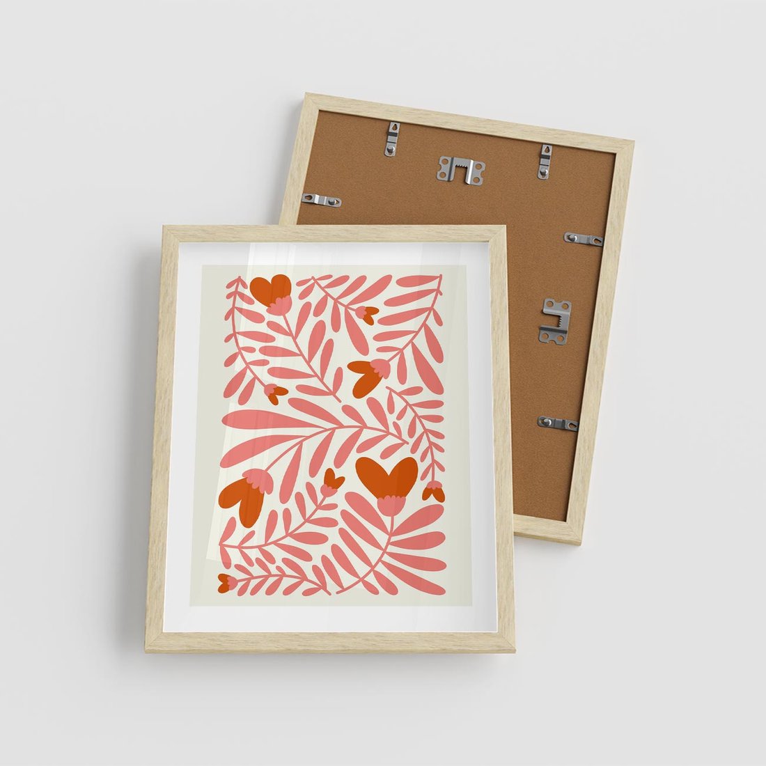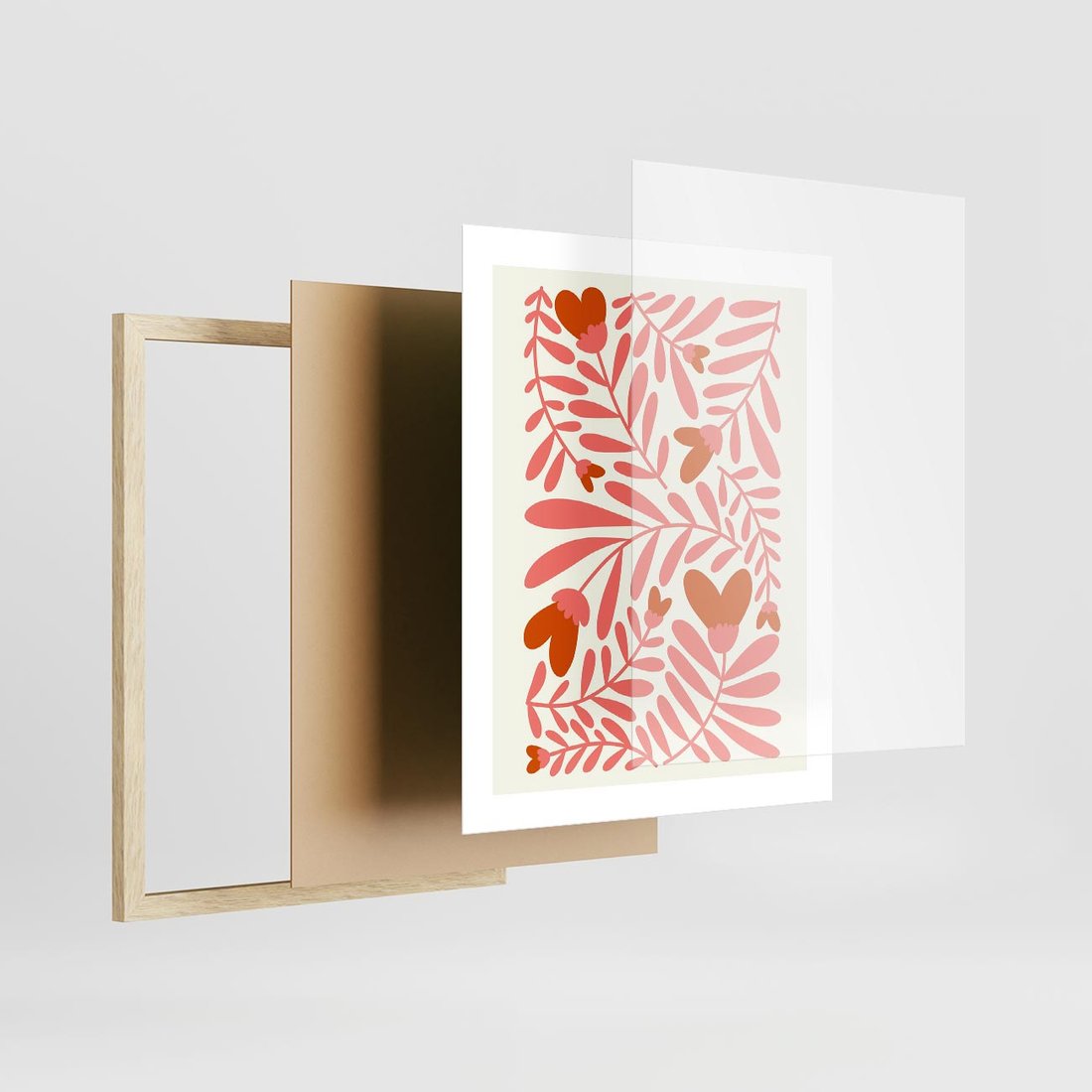 Ta nowoczesna grafika w pastelowych odcieniach tworzy kwiatową kompozycję w pięknych granatowych, różowych i pomarańczowych tonacjach. To obraz harmonii i wyrazistości, który wniesie do wnętrza radość i energię natury w nowoczesnym wydaniu.