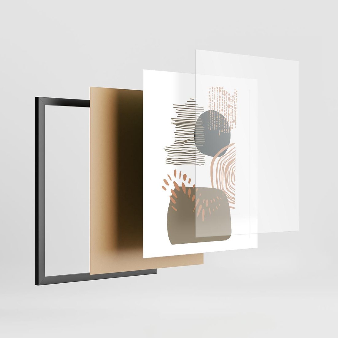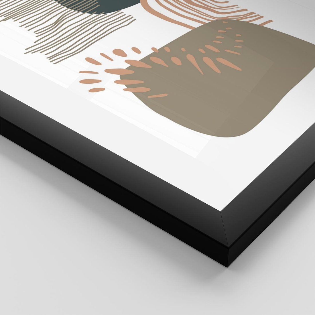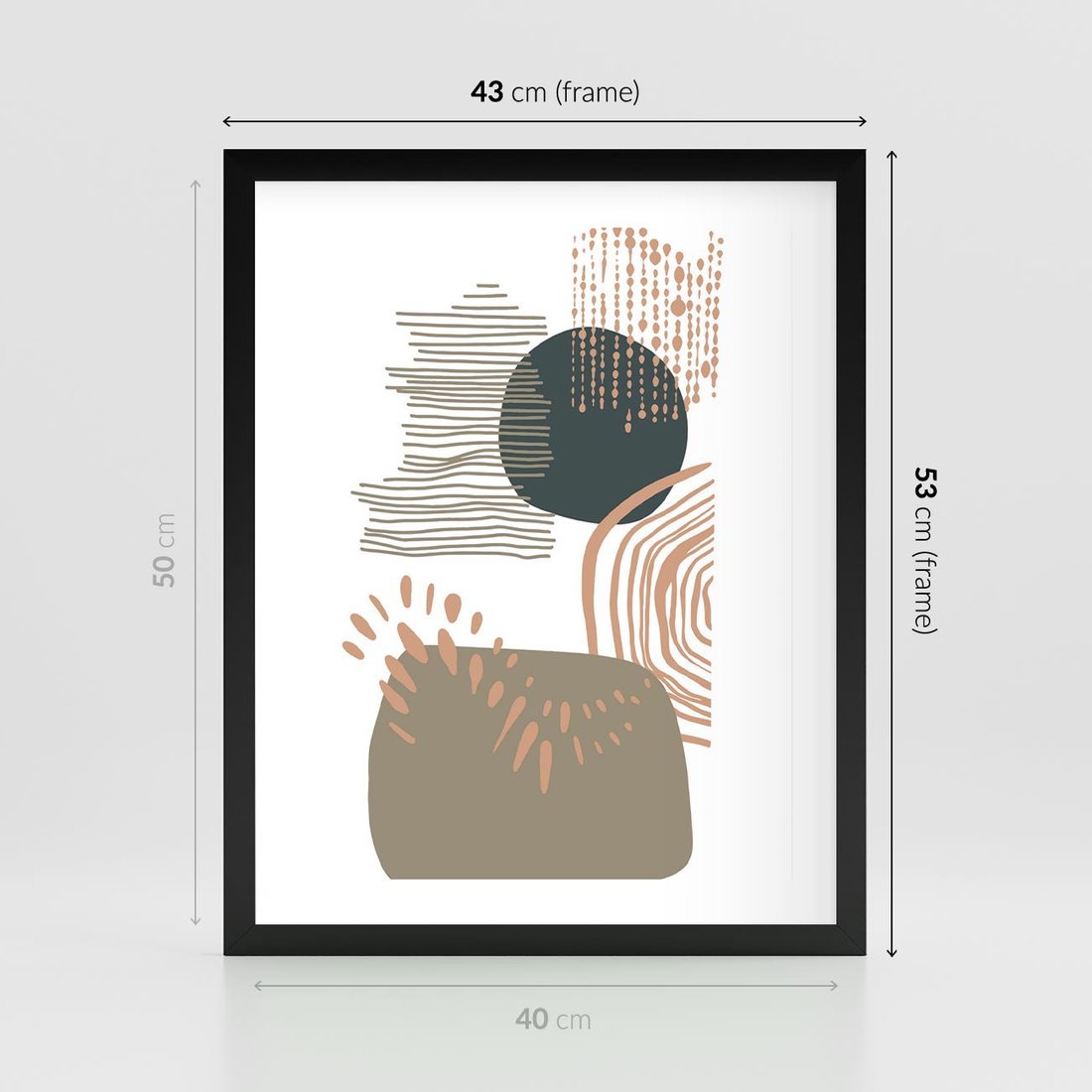 Plakat w ramie 40x50 - Taniec Plam - abstrakcyjna kompozycja z kropek kresek i kółek, odcienie brązu i beżu - rama czarna