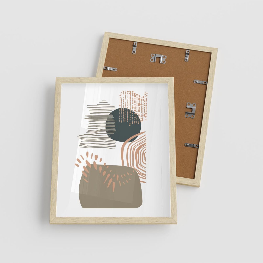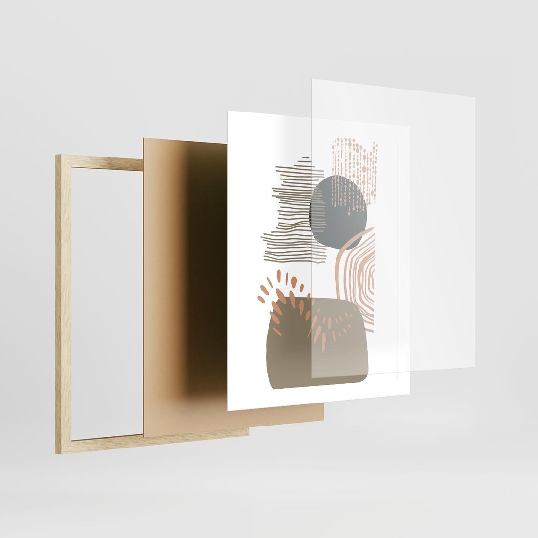 Ta abstrakcyjna kompozycja składa się z delikatnych kropek, kresek i kółek w spokojnych odcieniach brązu i beżu. Jej minimalistyczny charakter przynosi uczucie harmonii i spokoju, doskonale pasując do każdego wnętrza.