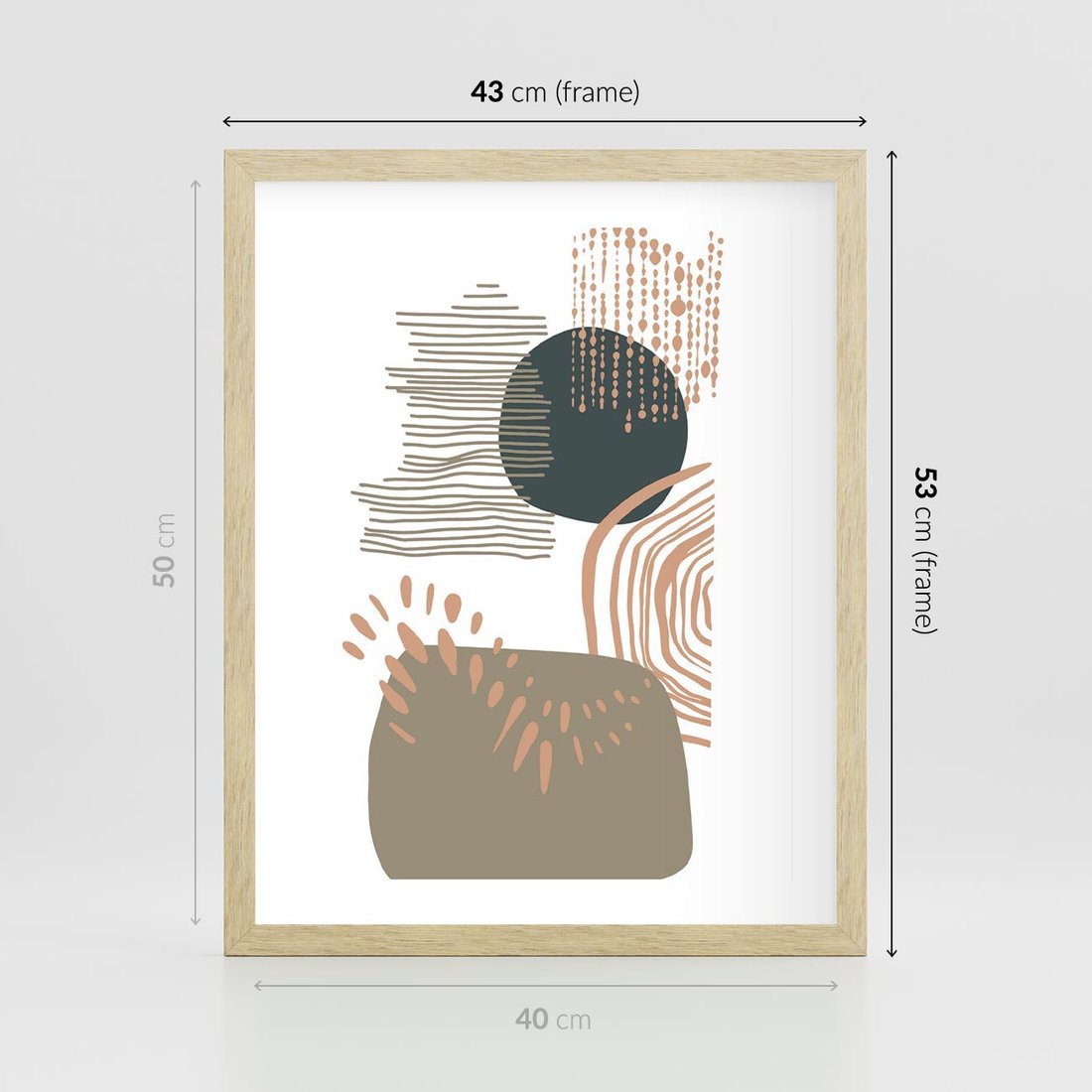 Plakat w ramie 40x50 - Taniec Plam - abstrakcyjna kompozycja z kropek kresek i kółek, odcienie brązu i beżu - rama drewno