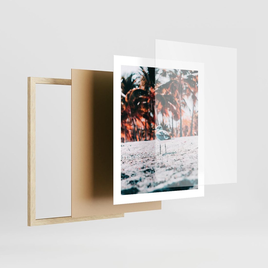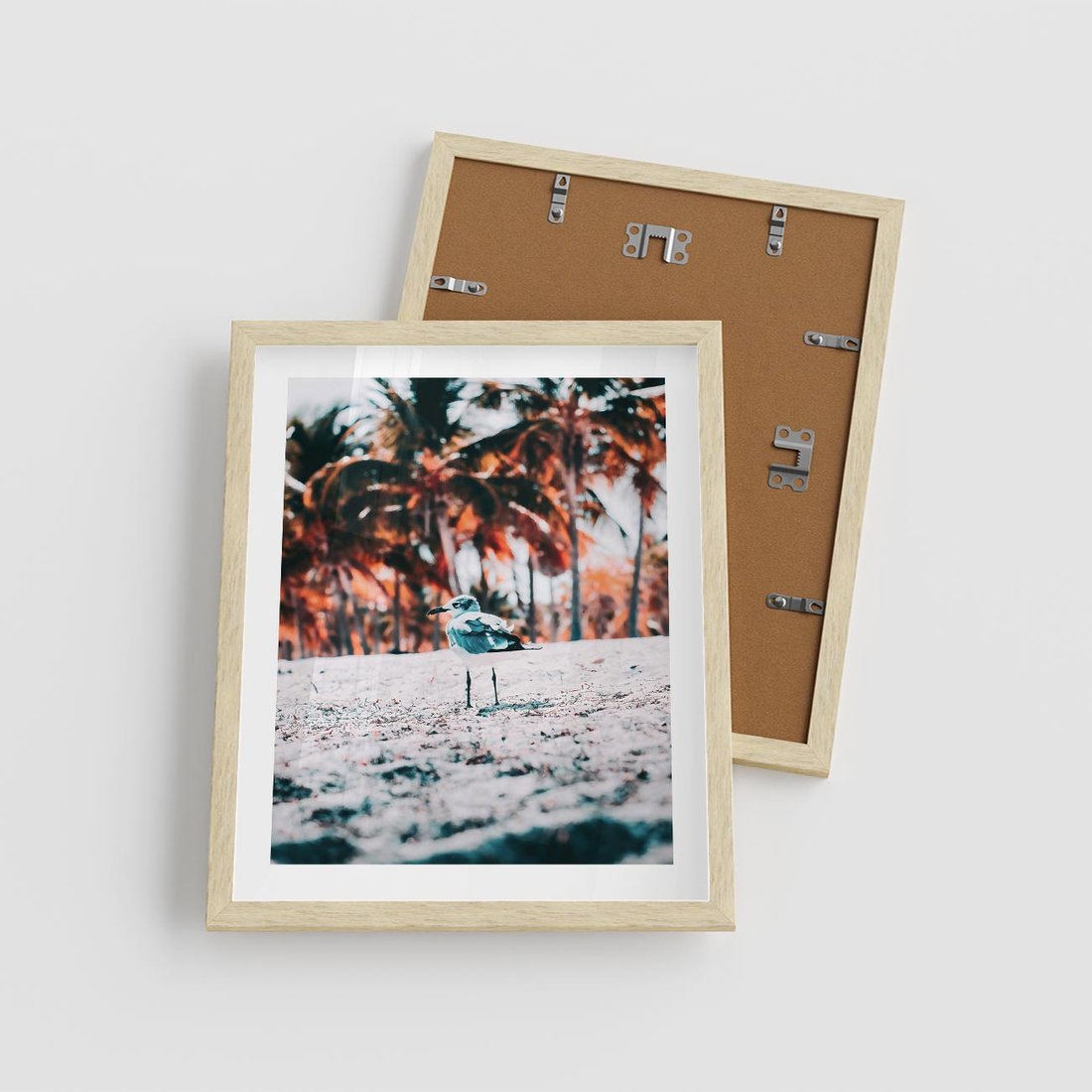 Plakat w ramie 40x50 - Tropikalna Uroda: Plaża z Mewą - tropikalna plaża, mewa na piasku - rama drewno