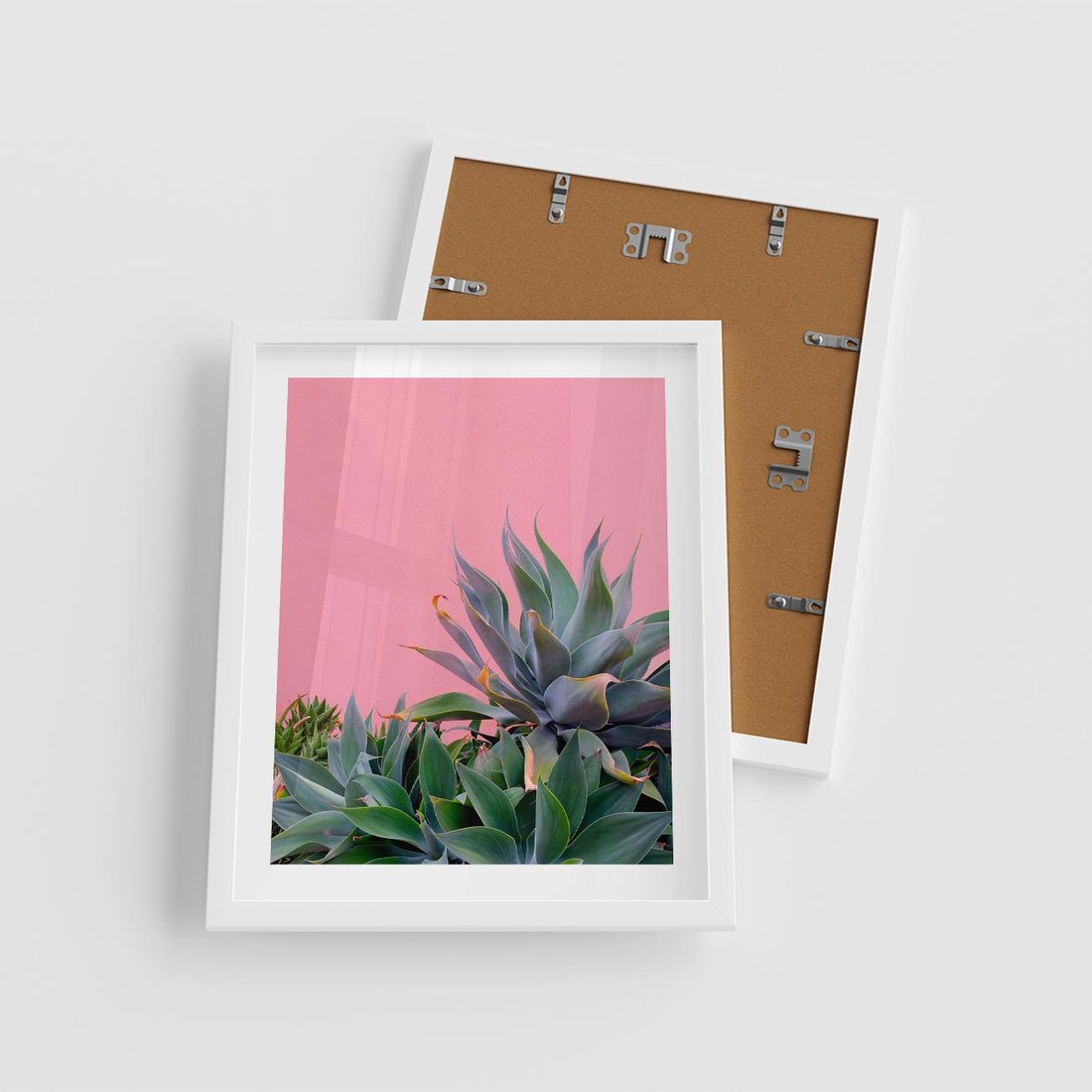 Plakat w ramie 40x50 - Tropikalne Liście na Różowej Ścianie - różowa ściana, tropikalne liście na jej tle - rama biała