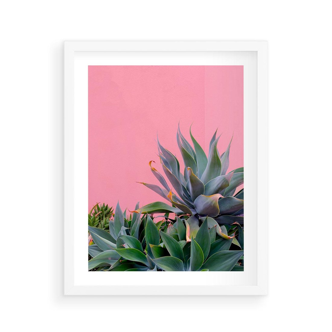 Obraz przedstawia kompozycję z różową ścianą i tropikalnymi liśćmi na jej tle. Ta kompozycja jest pełna koloru i życia, doskonale pasując do wnętrz, które pragną wprowadzić tropikalny klimat.