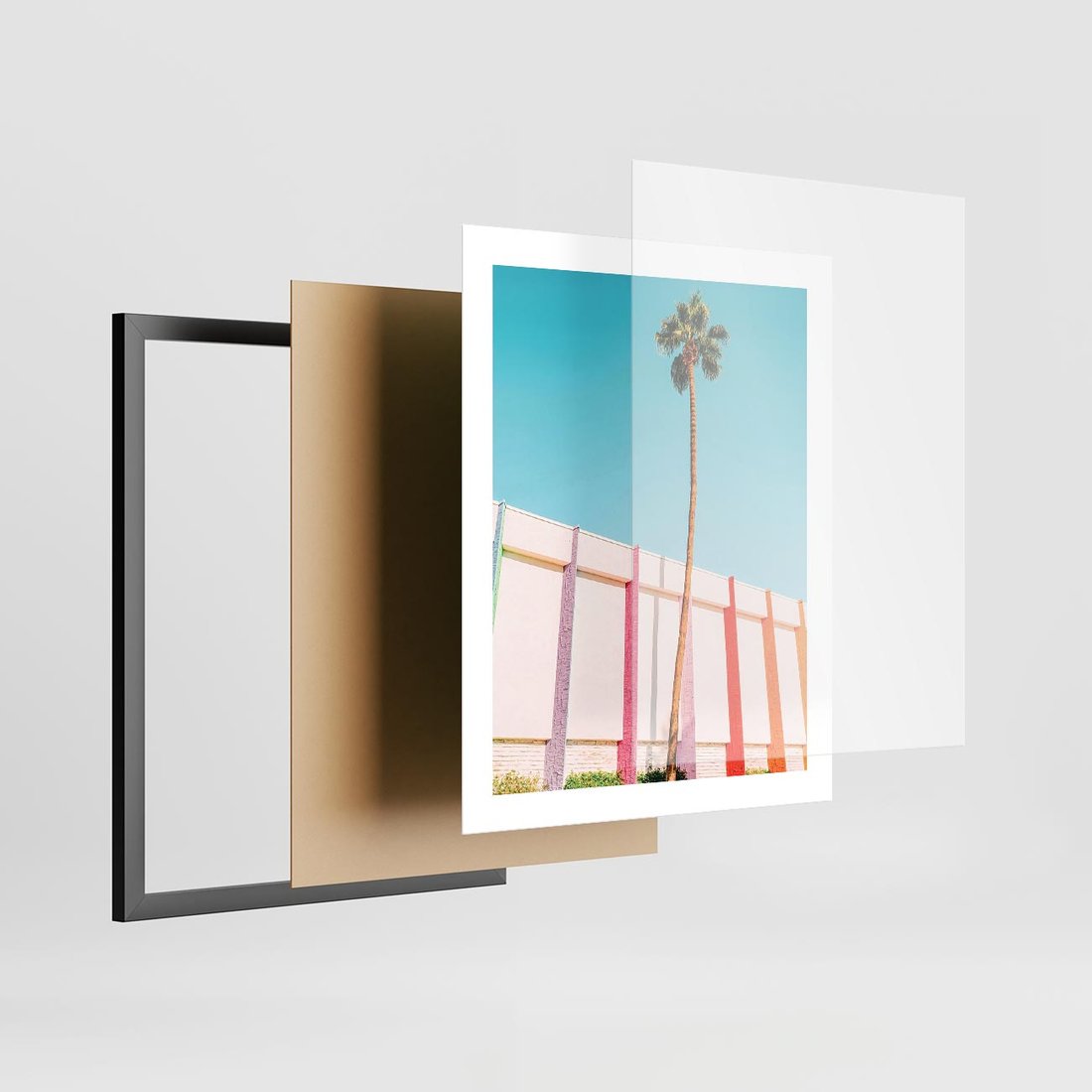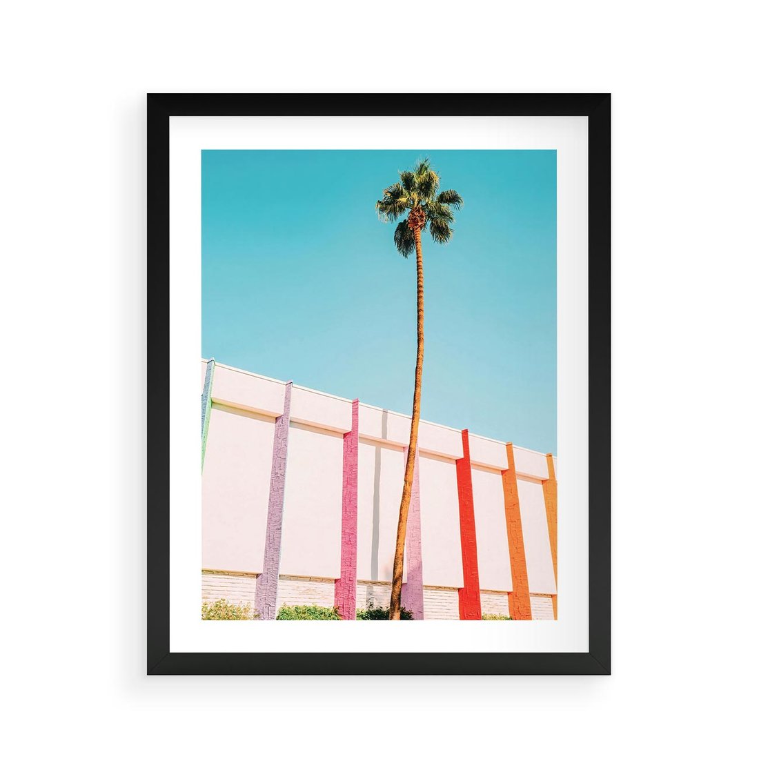 Obraz przedstawia palmę na tle błękitnego nieba oraz kolorowy mur o odcieniach pasteli. To harmonijne połączenie natury i architektury, które nadaje obrazowi radosny i tropikalny charakter.