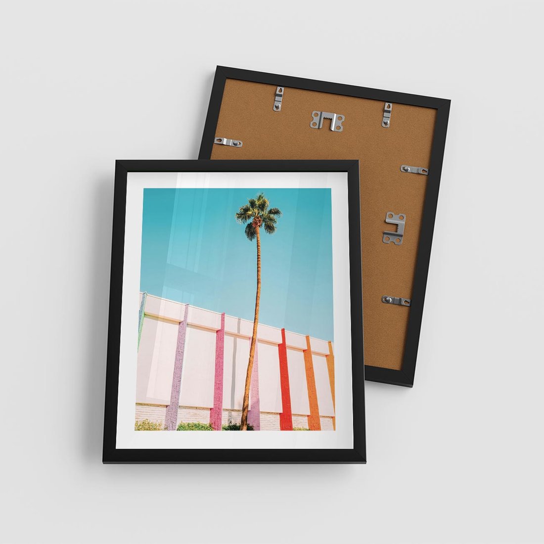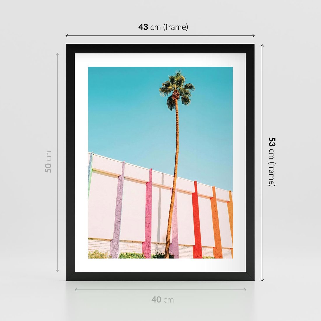 Plakat w ramie 40x50 - Tropikalny Kontrast - palma na tle błękitnego nieba, kolorowy mur - rama czarna