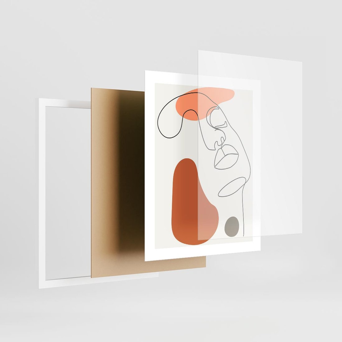 To nowoczesna grafika w stylu geometrycznym, gdzie w beżowych odcieniach przedstawiona jest abstrakcyjna twarz kobiety wykonana w technice "one line", tworząc minimalistyczny i elegancki portret.