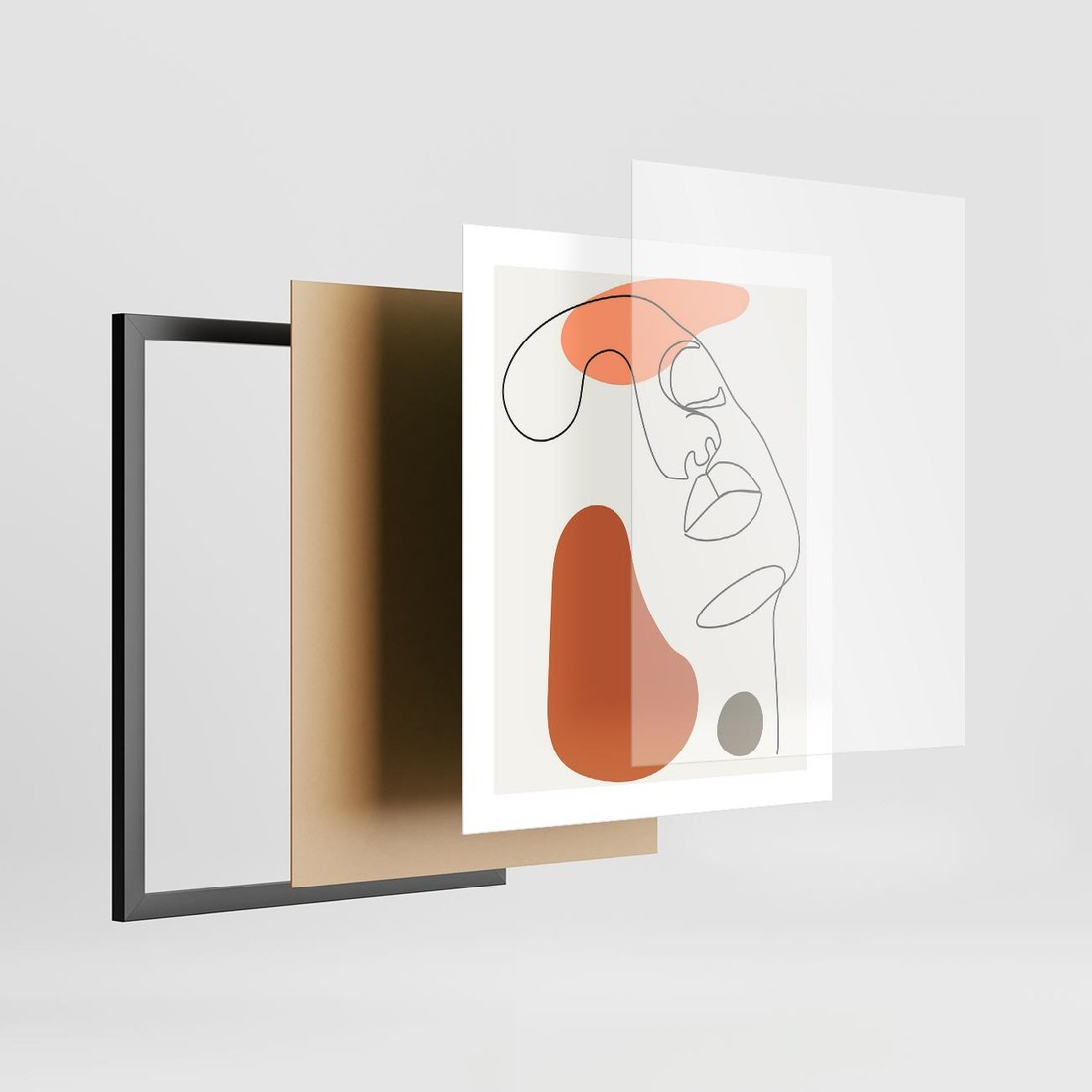 To nowoczesna grafika w stylu geometrycznym, gdzie w beżowych odcieniach przedstawiona jest abstrakcyjna twarz kobiety wykonana w technice "one line", tworząc minimalistyczny i elegancki portret.