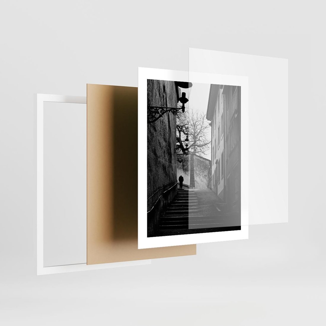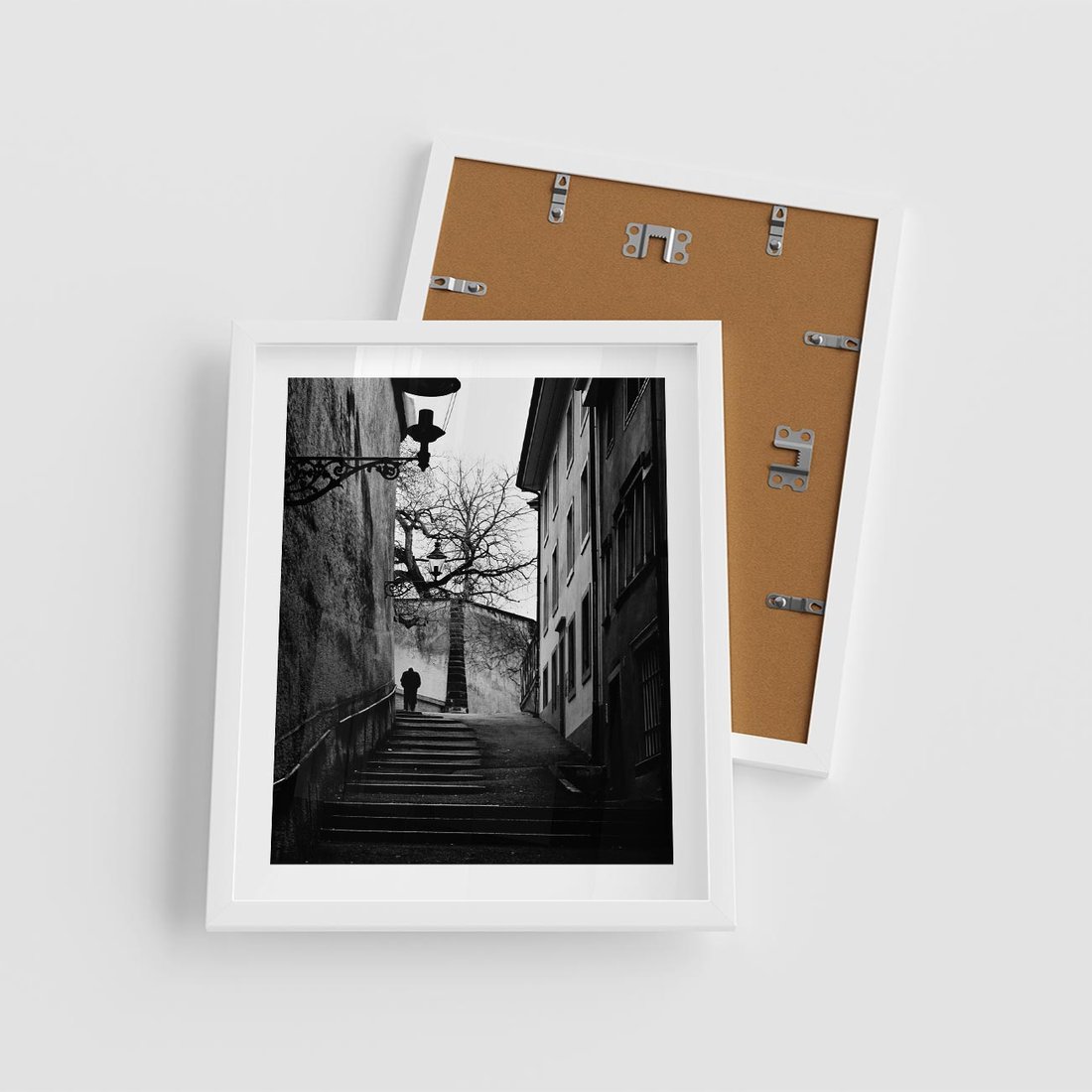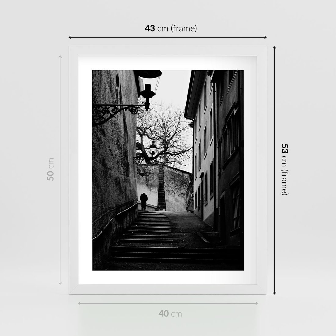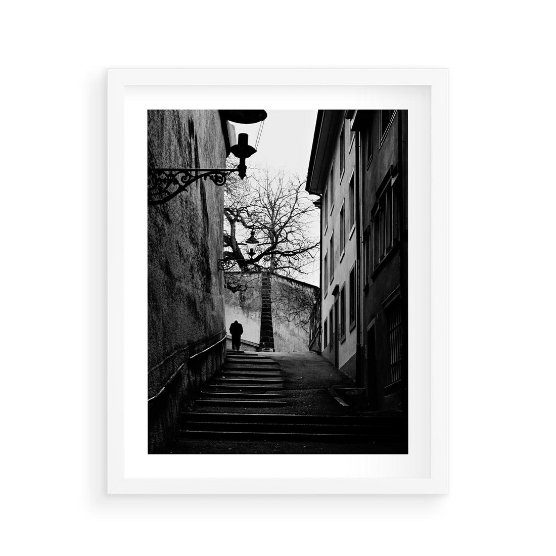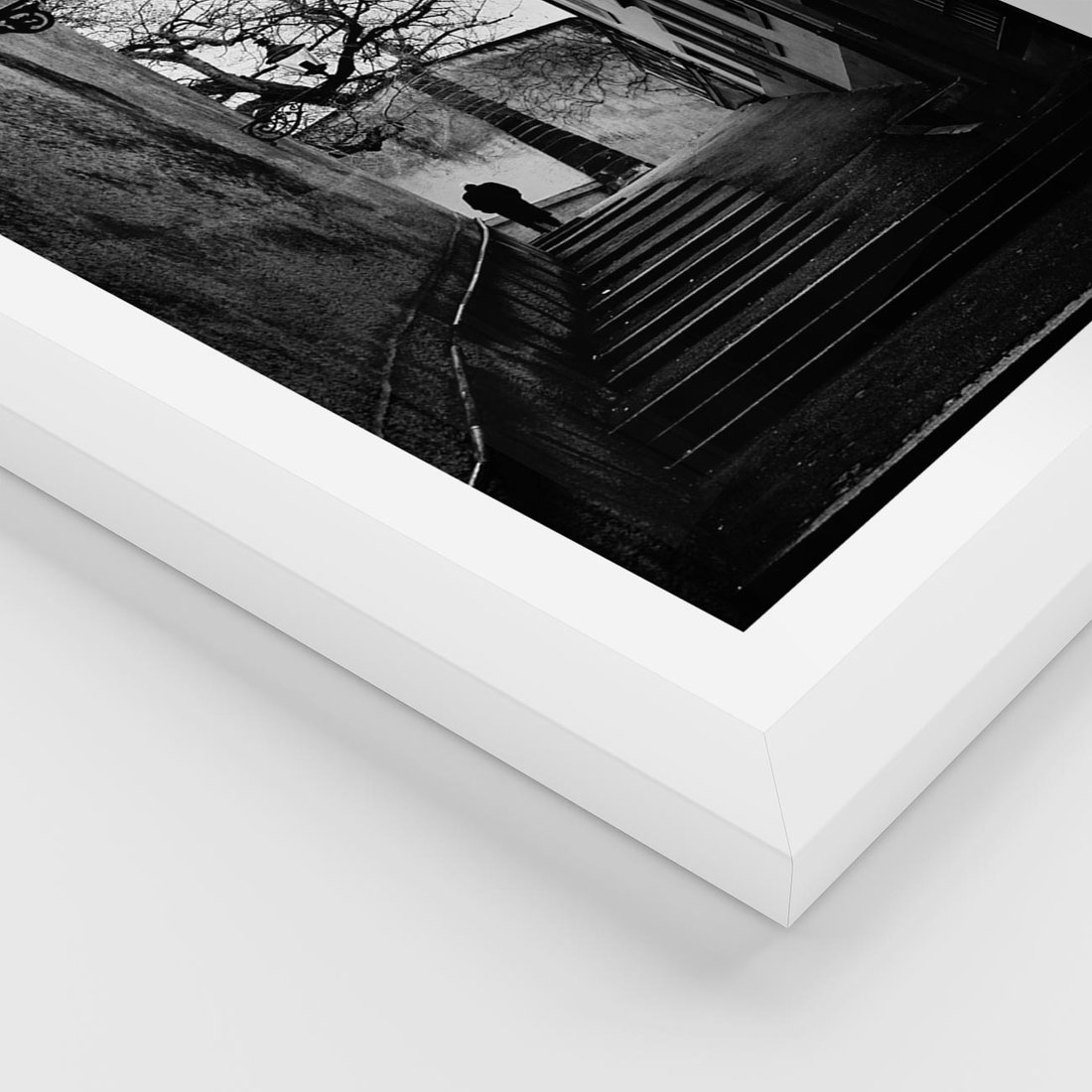 Plakat w ramie 40x50 - Ukryta Uliczka - czarno białe zdjęcie, schody - rama biała