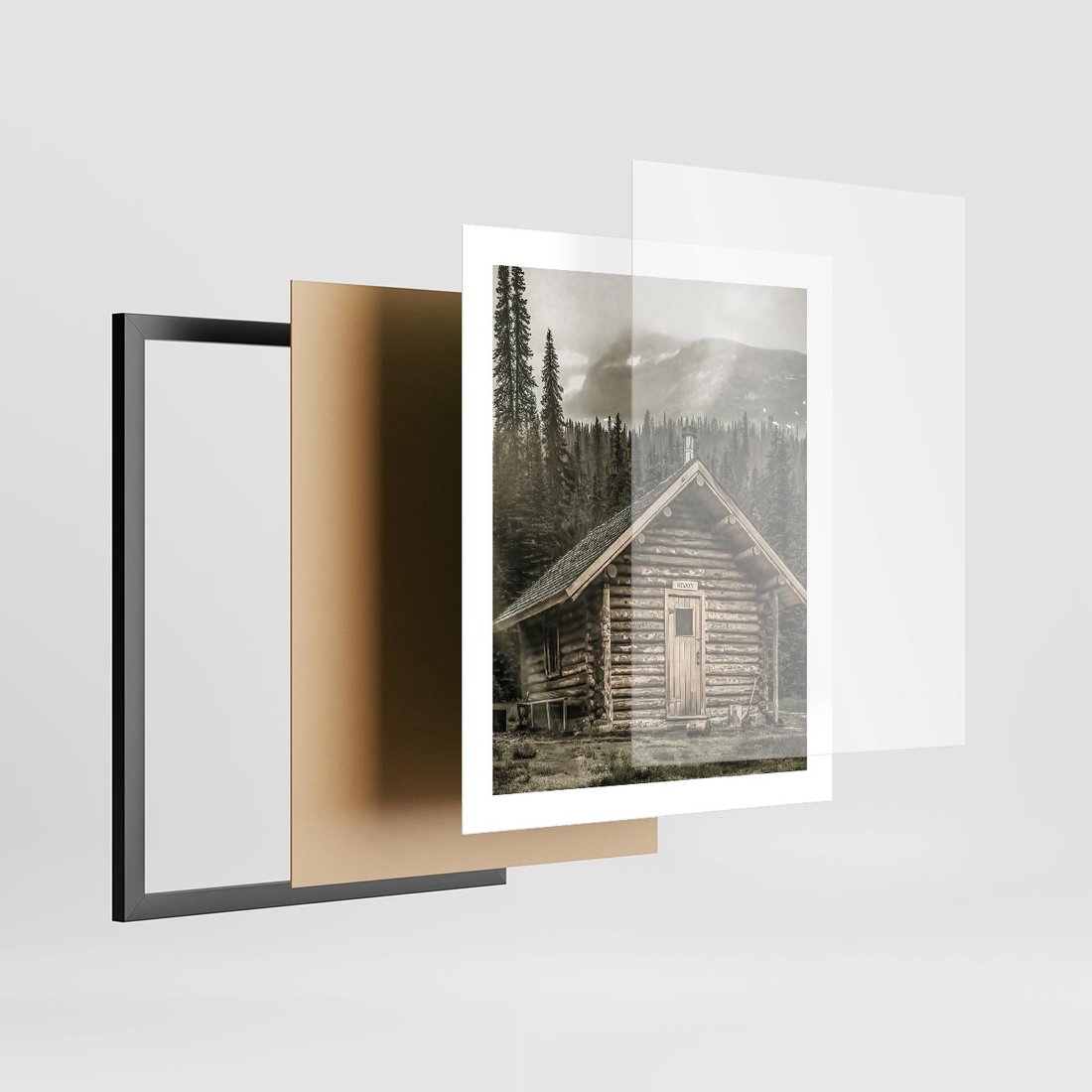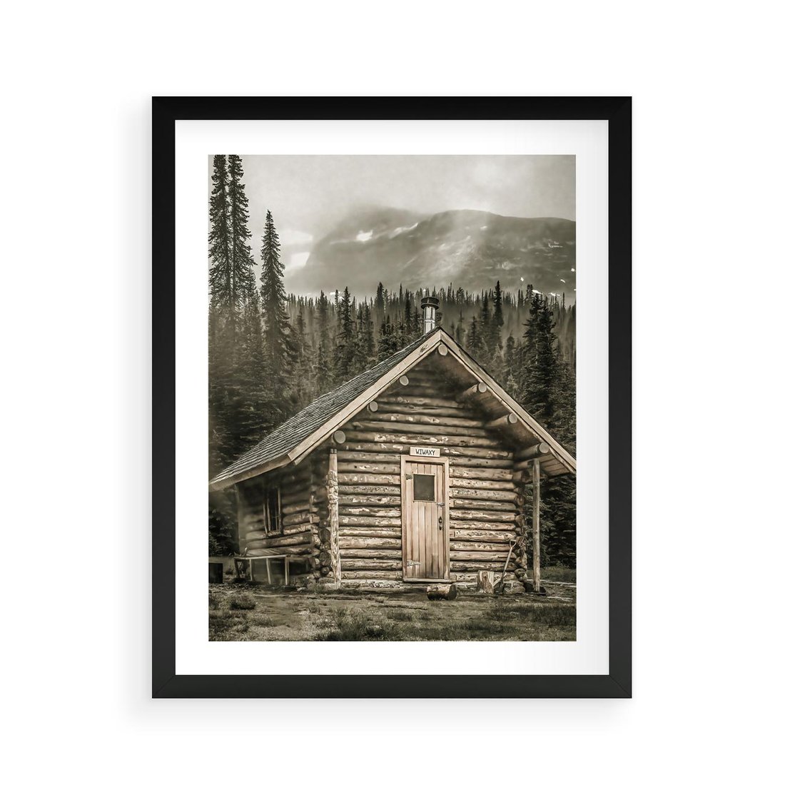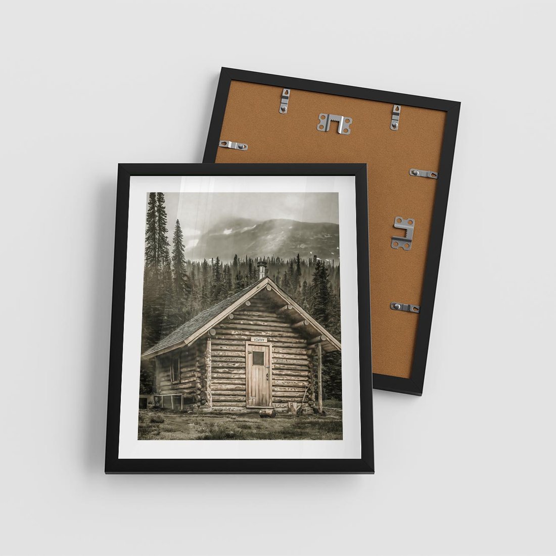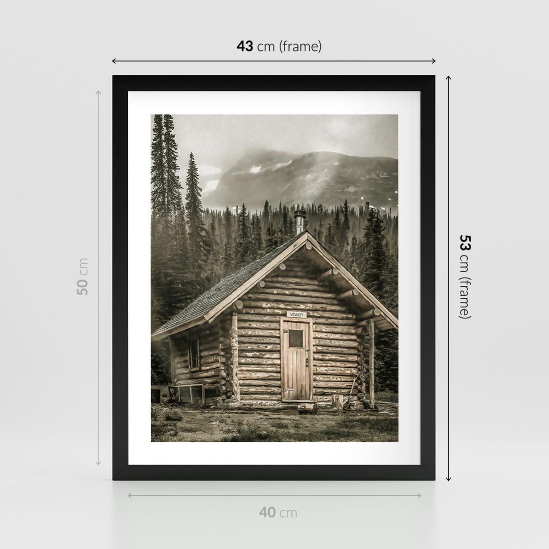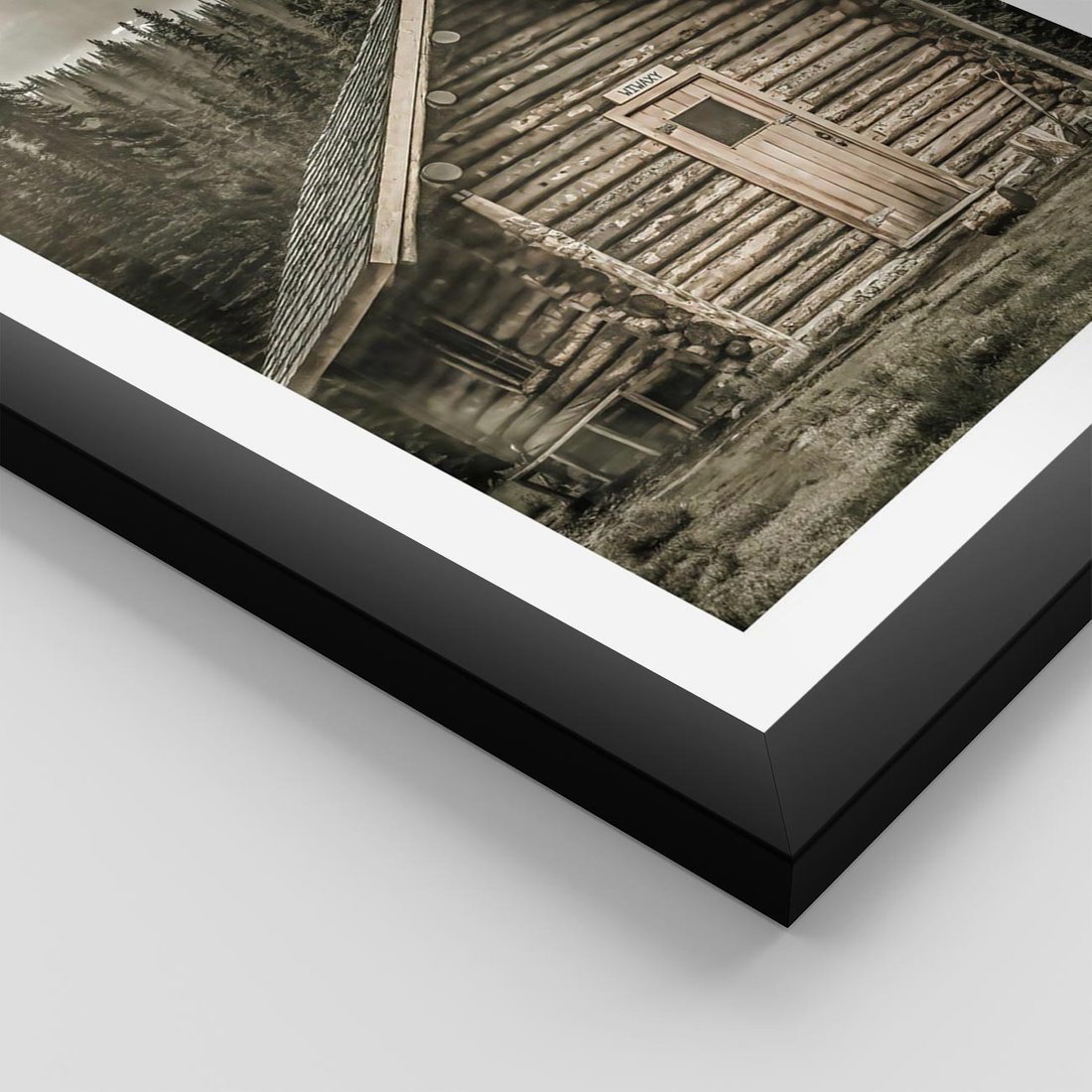 Plakat w ramie 40x50 - Urok Drewnianej Chatki w Górach - chatka w górach, drewniany domek - rama czarna