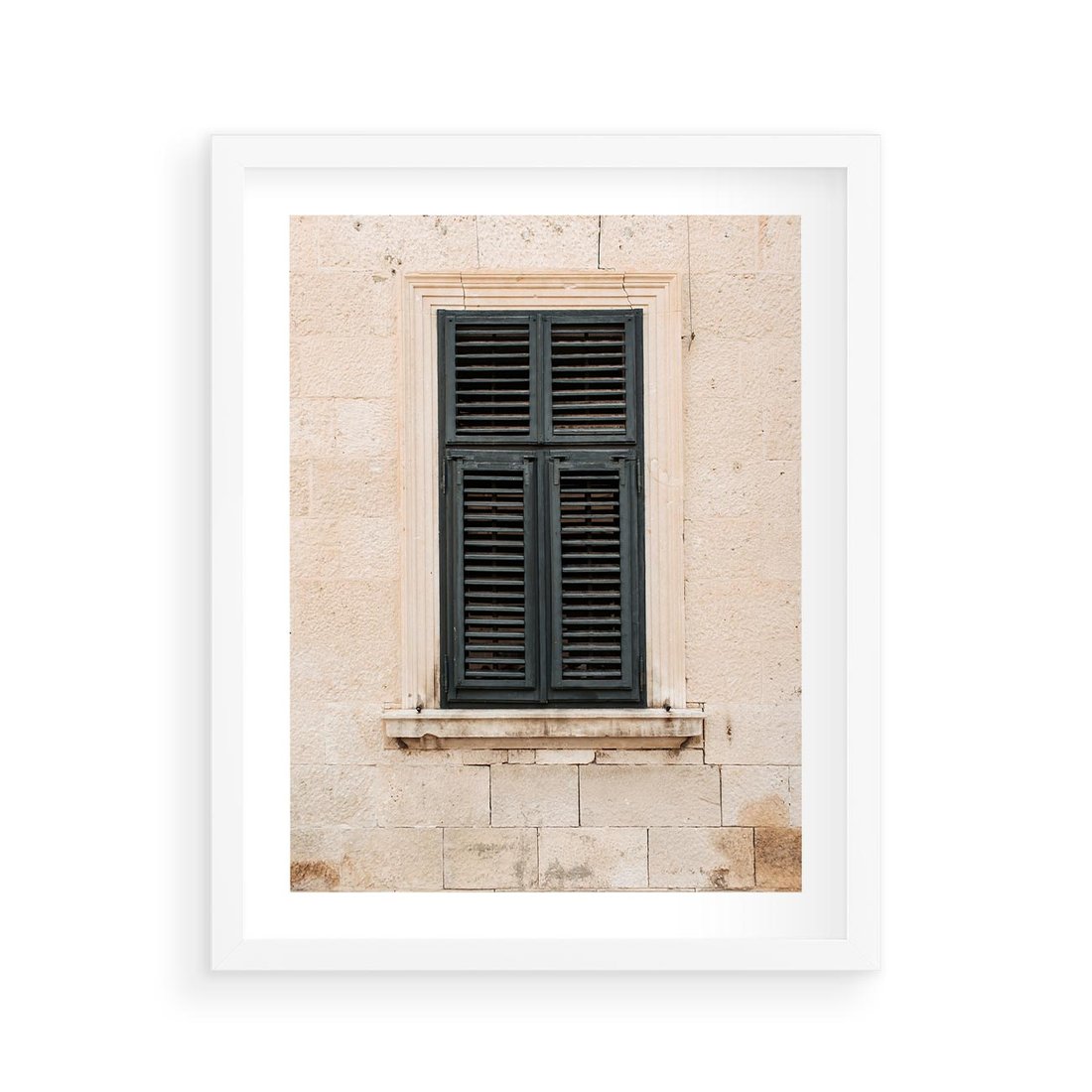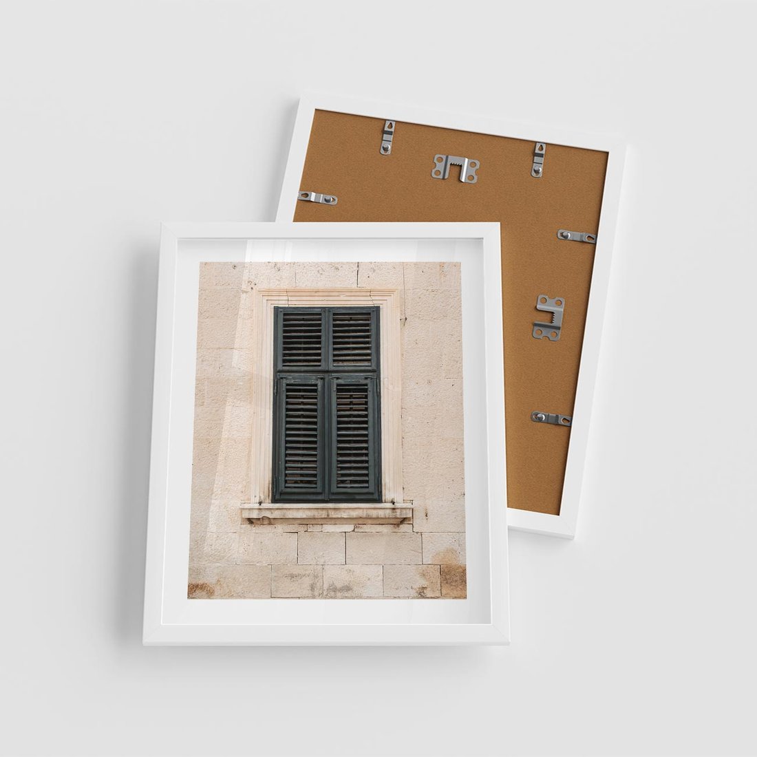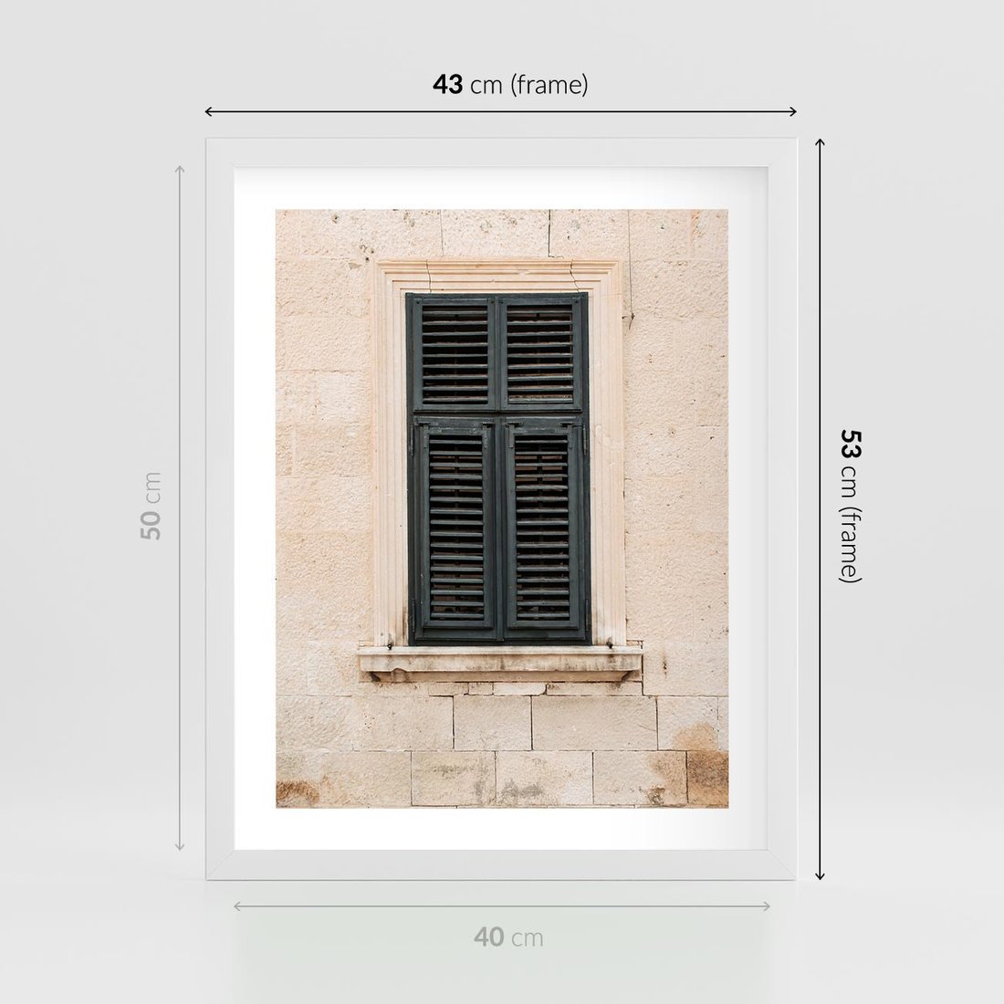 Plakat w ramie 40x50 - Urok Starego Okna z Zielonymi Okiennicami - stare okno, kamienica - rama biała